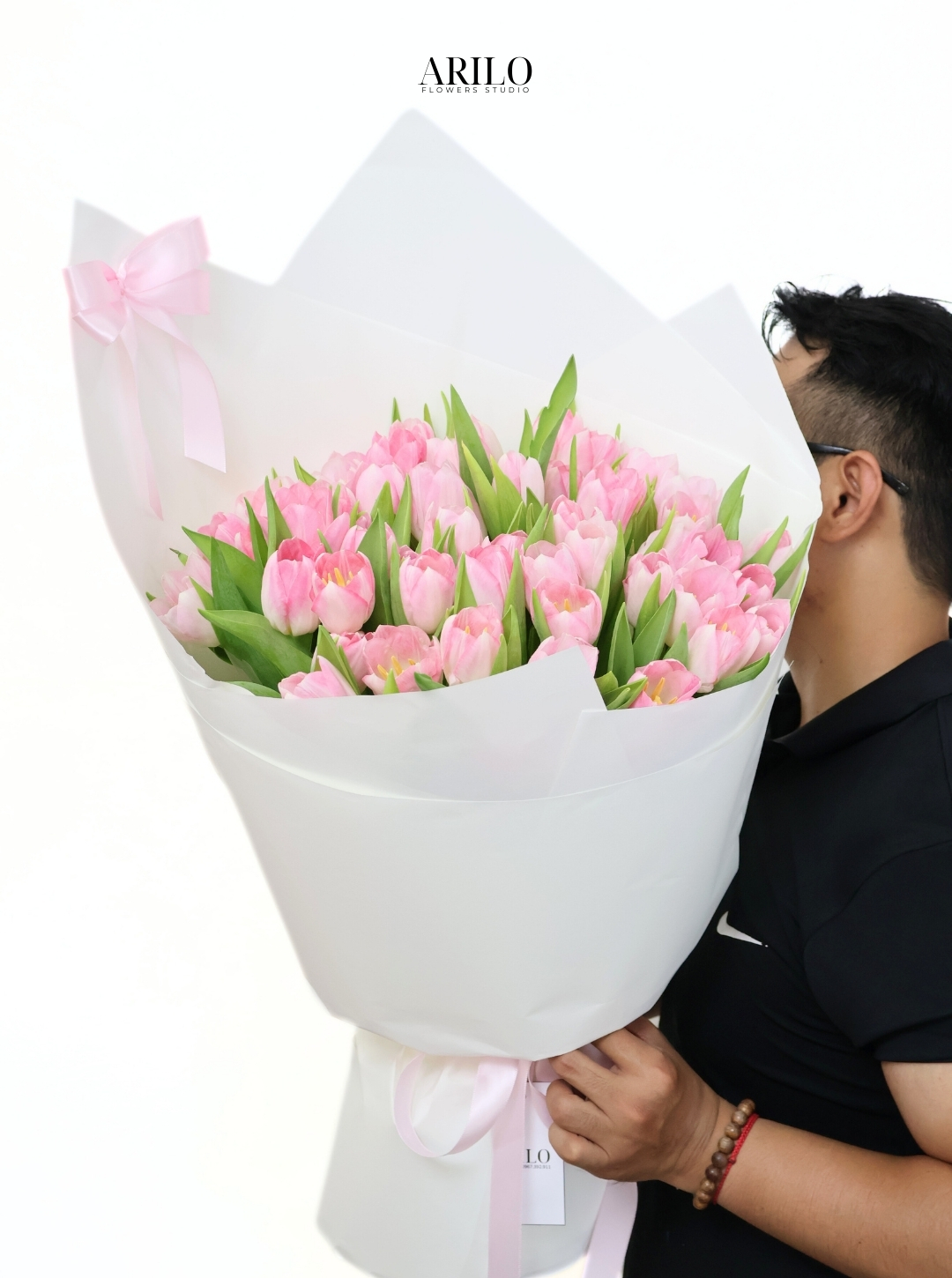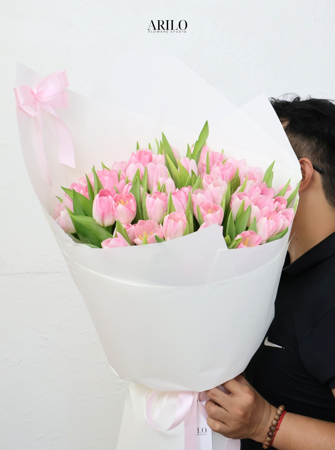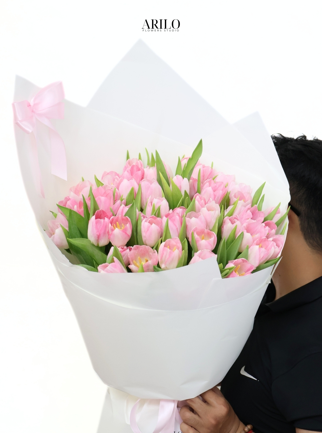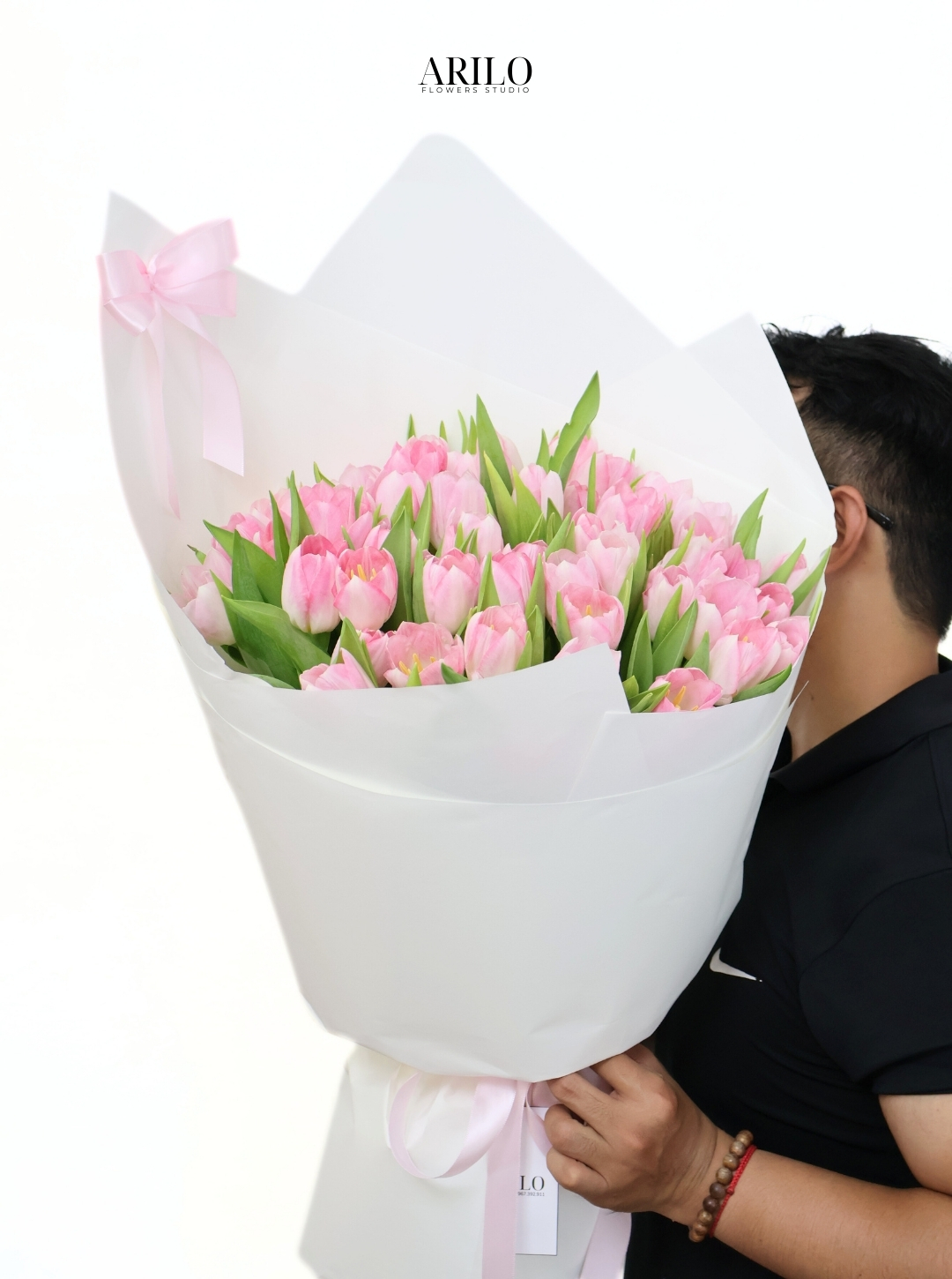 Lớp giấy gói trắng được lựa chọn để tôn lên vẻ đẹp tự nhiên của hoa, đồng thời tạo nên sự tương phản tinh tế với sắc hồng của tulip. Phần nơ hồng nhẹ nhàng giúp tổng thể bó hoa trở nên mềm mại và lãng mạn hơn.
