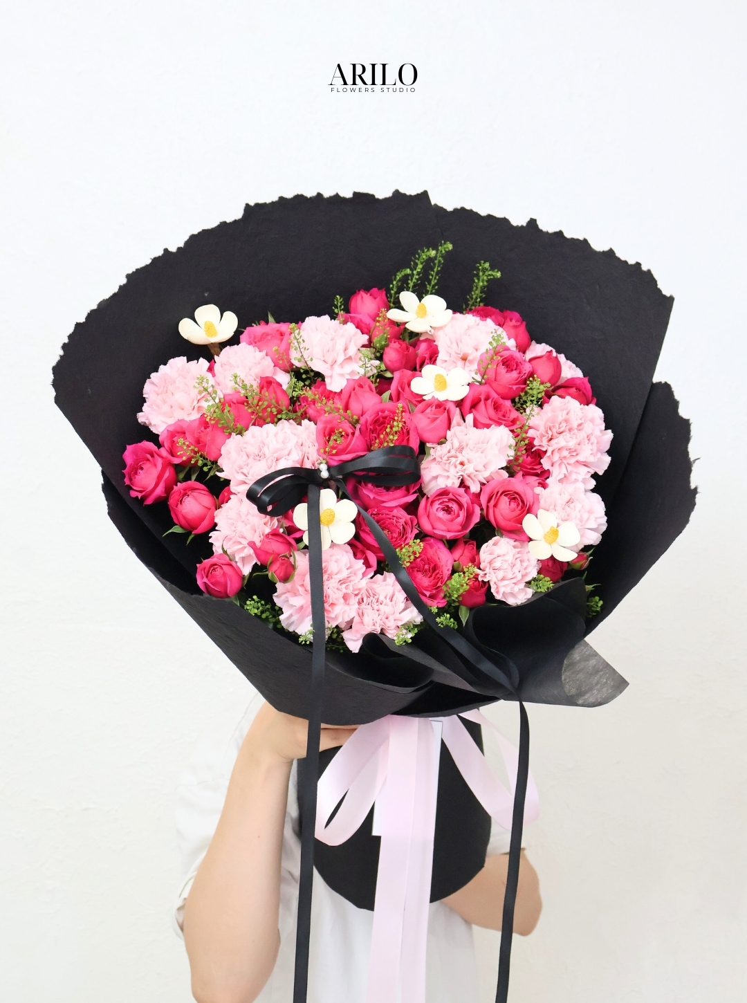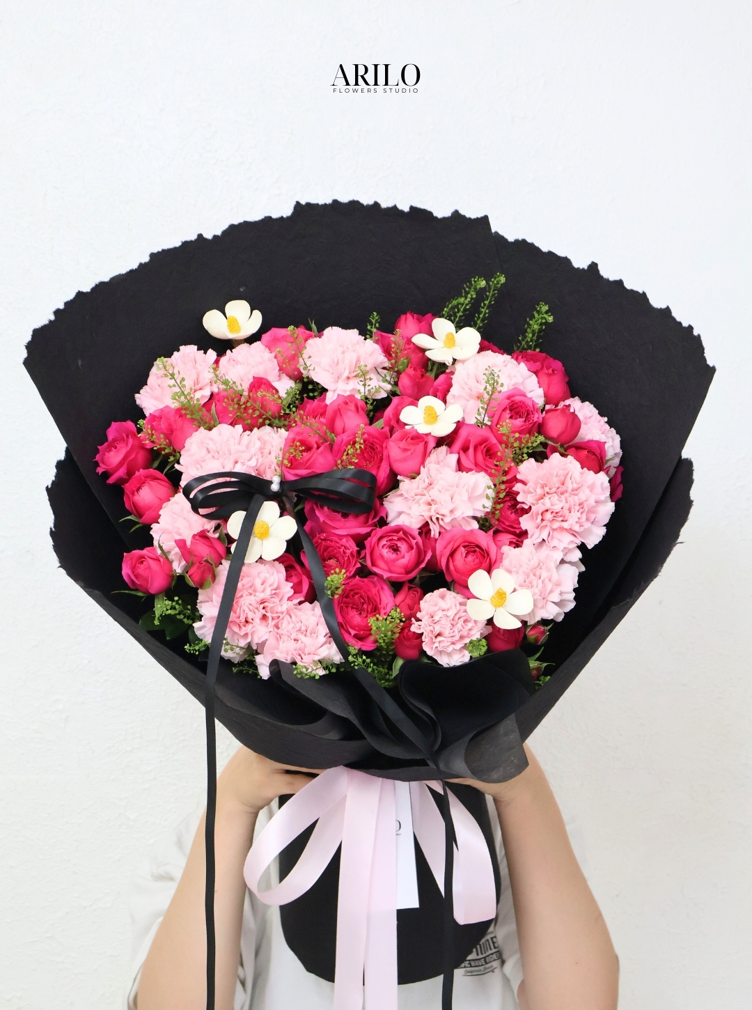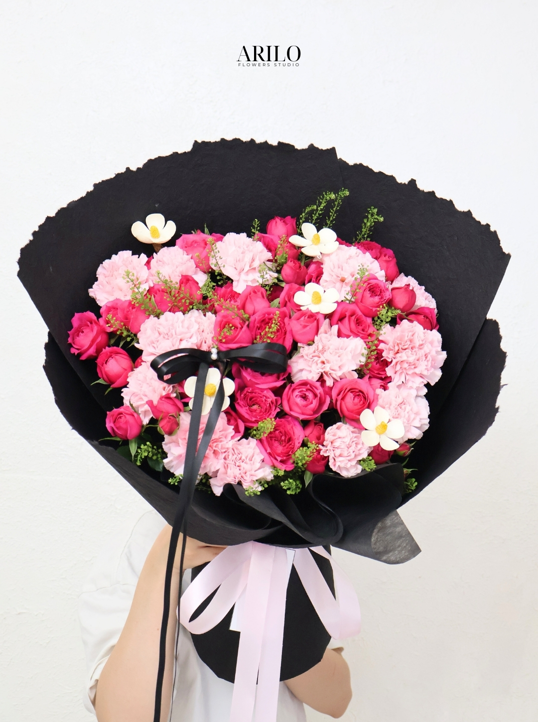 Giấy gói đen bản lớn tạo hình vòng cung mạnh mẽ bao quanh mặt hoa, giúp tổng thể có chiều sâu và độ tương phản rõ ràng. Nơ đen và ruy băng hồng tạo điểm nhấn tinh tế, giúp bó hoa vừa sang trọng vừa mềm mại.