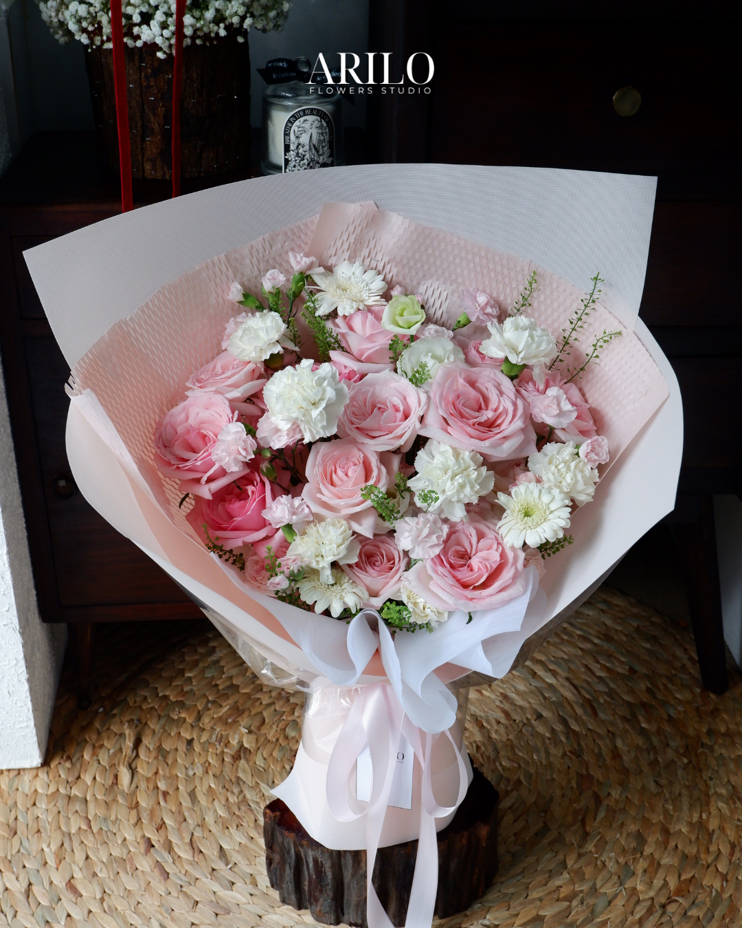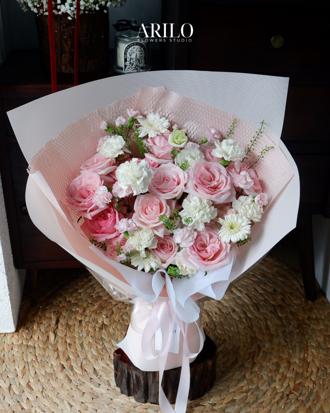 Dưới bàn tay khéo léo của nghệ nhân Arilo, bó hoa không chỉ là sự kết hợp của những đóa hoa mà là một tác phẩm nghệ thuật. Chúng tôi sử dụng giấy gói Hàn Quốc cao cấp (như giấy mờ, giấy lụa) với tông màu trang nhã (ví dụ: kem, xám khói, đen tuyền) làm nổi bật vẻ đẹp kiêu sa của hoa hồng. Điểm nhấn là chiếc nơ lụa mềm mại được thắt thủ công, tạo nên một tổng thể sang trọng và hiện đại.