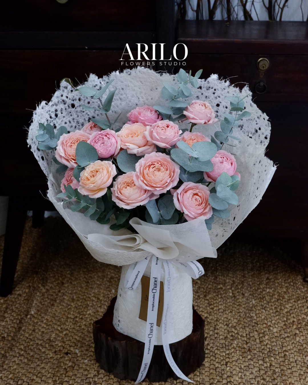 Dưới bàn tay khéo léo của nghệ nhân Arilo, bó hoa không chỉ là sự kết hợp của những đóa hoa mà là một tác phẩm nghệ thuật. Chúng tôi sử dụng giấy gói Hàn Quốc cao cấp (như giấy mờ, giấy lụa) với tông màu trang nhã (ví dụ: kem, xám khói, đen tuyền) làm nổi bật vẻ đẹp kiêu sa của hoa hồng. Điểm nhấn là chiếc nơ lụa mềm mại được thắt thủ công, tạo nên một tổng thể sang trọng và hiện đại.