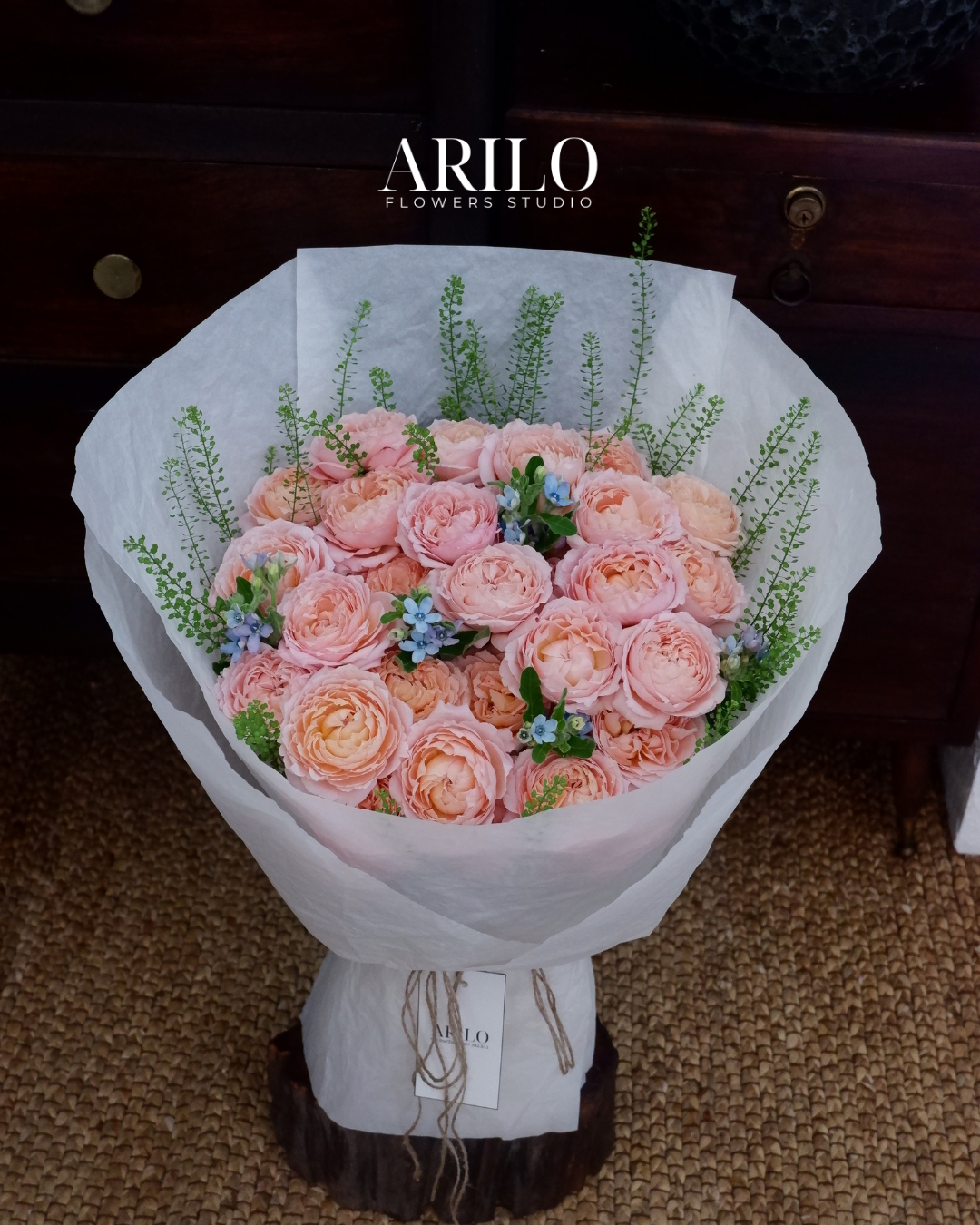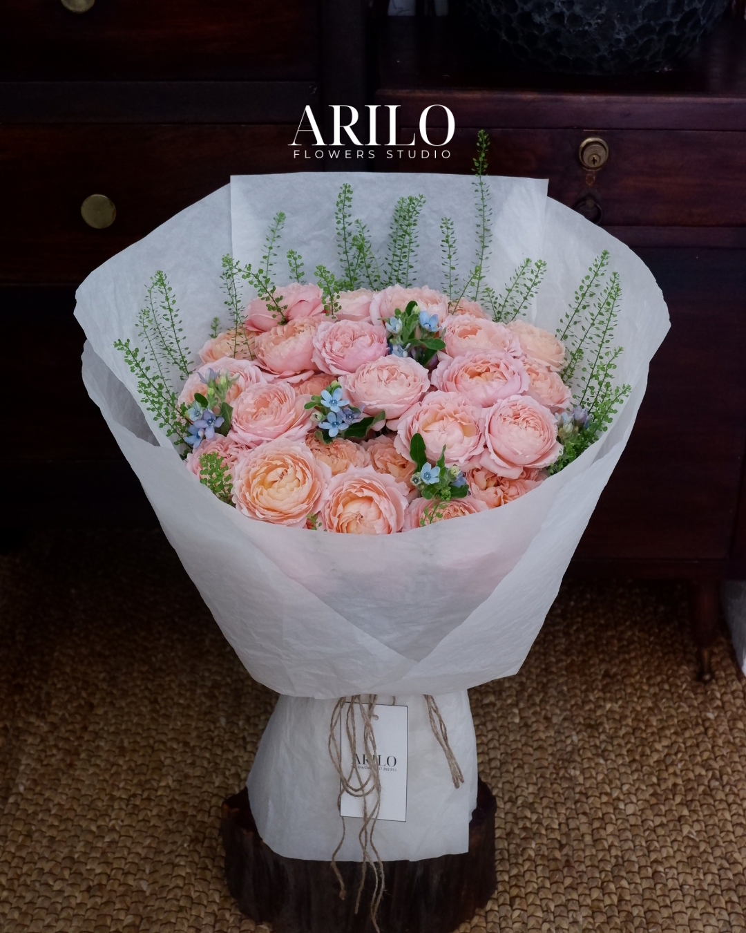 Dưới bàn tay khéo léo của nghệ nhân Arilo, bó hoa không chỉ là sự kết hợp của những đóa hoa mà là một tác phẩm nghệ thuật. Chúng tôi sử dụng giấy gói Hàn Quốc cao cấp (như giấy mờ, giấy lụa) với tông màu trang nhã (ví dụ: kem, xám khói, đen tuyền) làm nổi bật vẻ đẹp kiêu sa của hoa hồng. Điểm nhấn là chiếc nơ lụa mềm mại được thắt thủ công, tạo nên một tổng thể sang trọng và hiện đại.