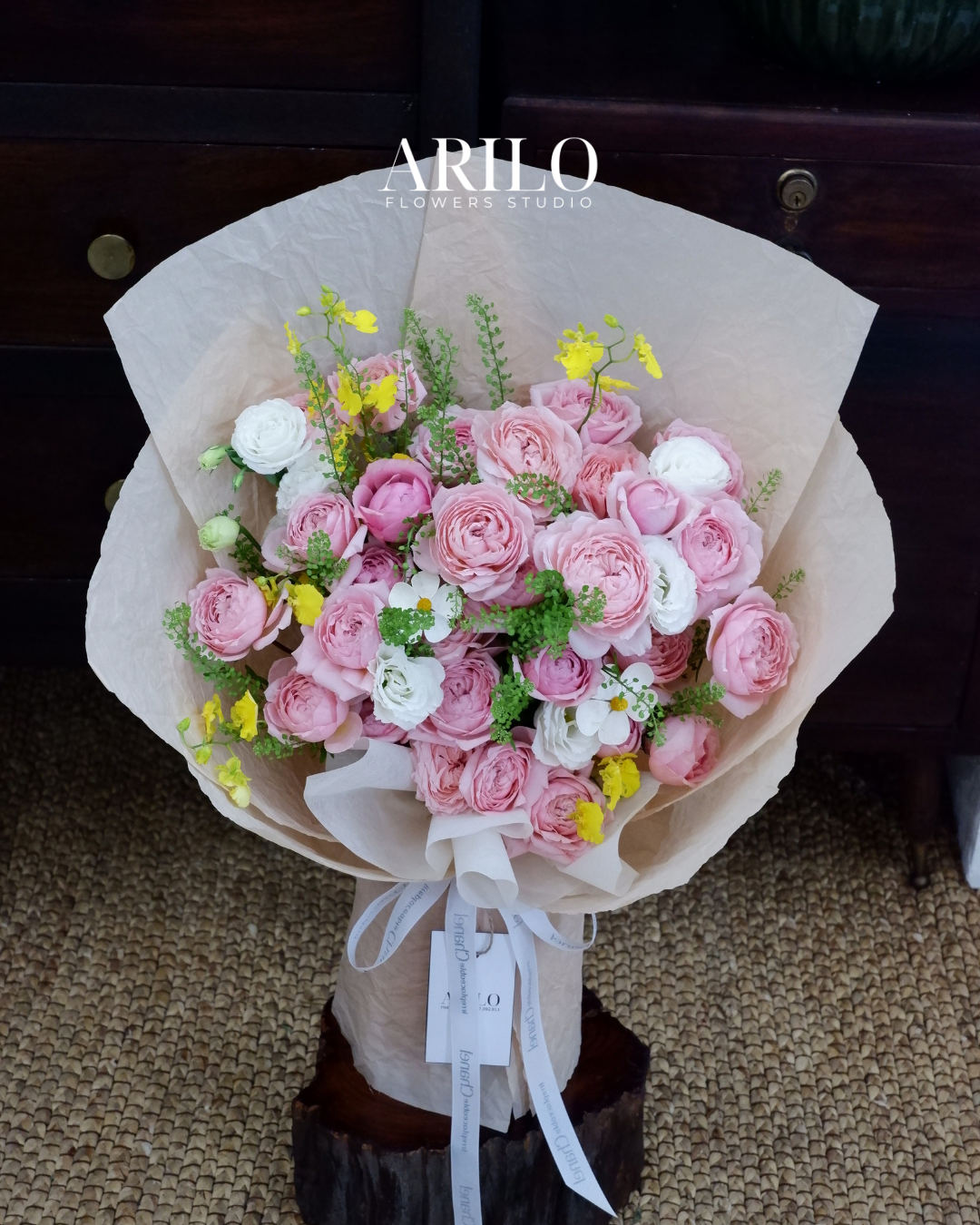 Dưới bàn tay khéo léo của nghệ nhân Arilo, bó hoa không chỉ là sự kết hợp của những đóa hoa mà là một tác phẩm nghệ thuật. Chúng tôi sử dụng giấy gói Hàn Quốc cao cấp (như giấy mờ, giấy lụa) với tông màu trang nhã (ví dụ: kem, xám khói, đen tuyền) làm nổi bật vẻ đẹp kiêu sa của hoa hồng. Điểm nhấn là chiếc nơ lụa mềm mại được thắt thủ công, tạo nên một tổng thể sang trọng và hiện đại.