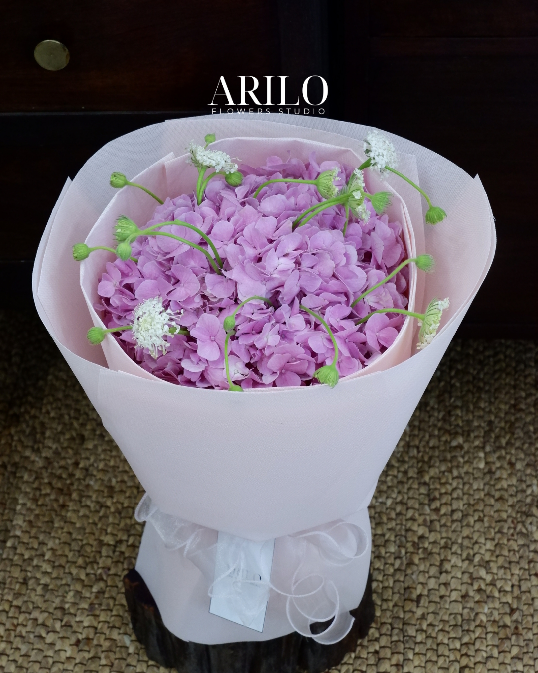 Dưới bàn tay khéo léo của nghệ nhân Arilo, bó hoa không chỉ là sự kết hợp của những đóa hoa mà là một tác phẩm nghệ thuật. Chúng tôi sử dụng giấy gói Hàn Quốc cao cấp (như giấy mờ, giấy lụa) với tông màu trang nhã (ví dụ: kem, xám khói, đen tuyền) làm nổi bật vẻ đẹp kiêu sa của hoa hồng. Điểm nhấn là chiếc nơ lụa mềm mại được thắt thủ công, tạo nên một tổng thể sang trọng và hiện đại.