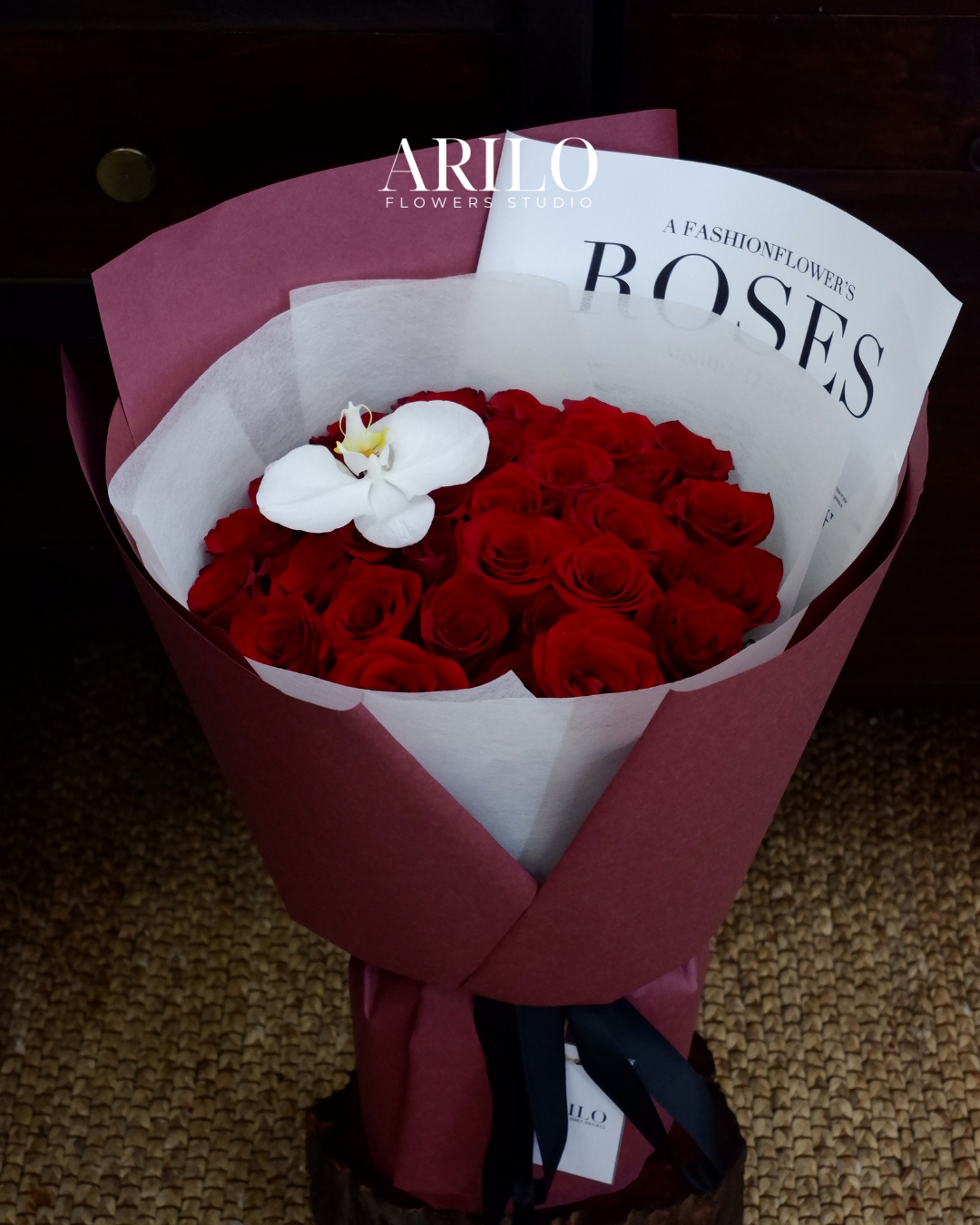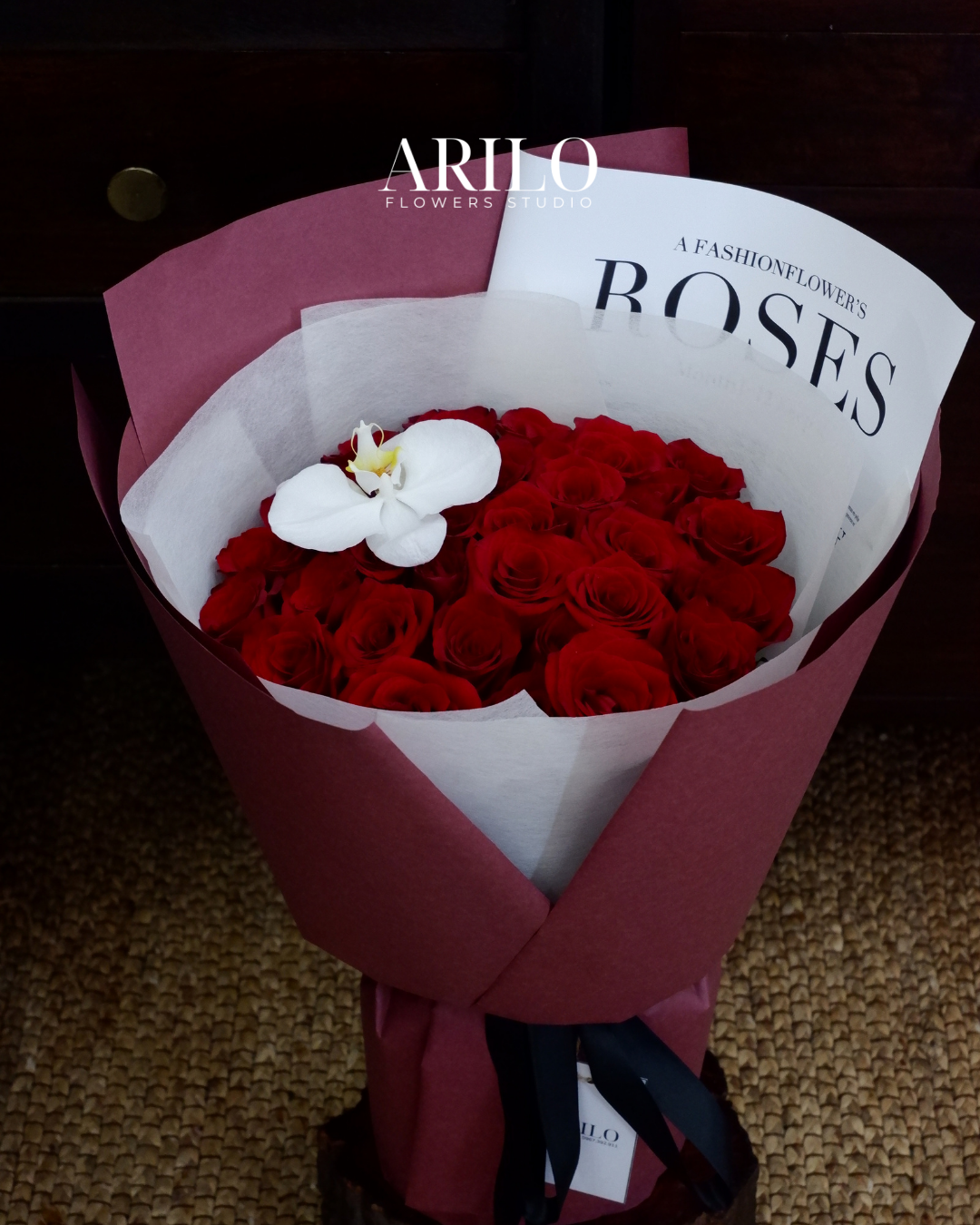 Dưới bàn tay khéo léo của nghệ nhân Arilo, bó hoa không chỉ là sự kết hợp của những đóa hoa mà là một tác phẩm nghệ thuật. Chúng tôi sử dụng giấy gói Hàn Quốc cao cấp (như giấy mờ, giấy lụa) với tông màu trang nhã (ví dụ: kem, xám khói, đen tuyền) làm nổi bật vẻ đẹp kiêu sa của hoa hồng. Điểm nhấn là chiếc nơ lụa mềm mại được thắt thủ công, tạo nên một tổng thể sang trọng và hiện đại.