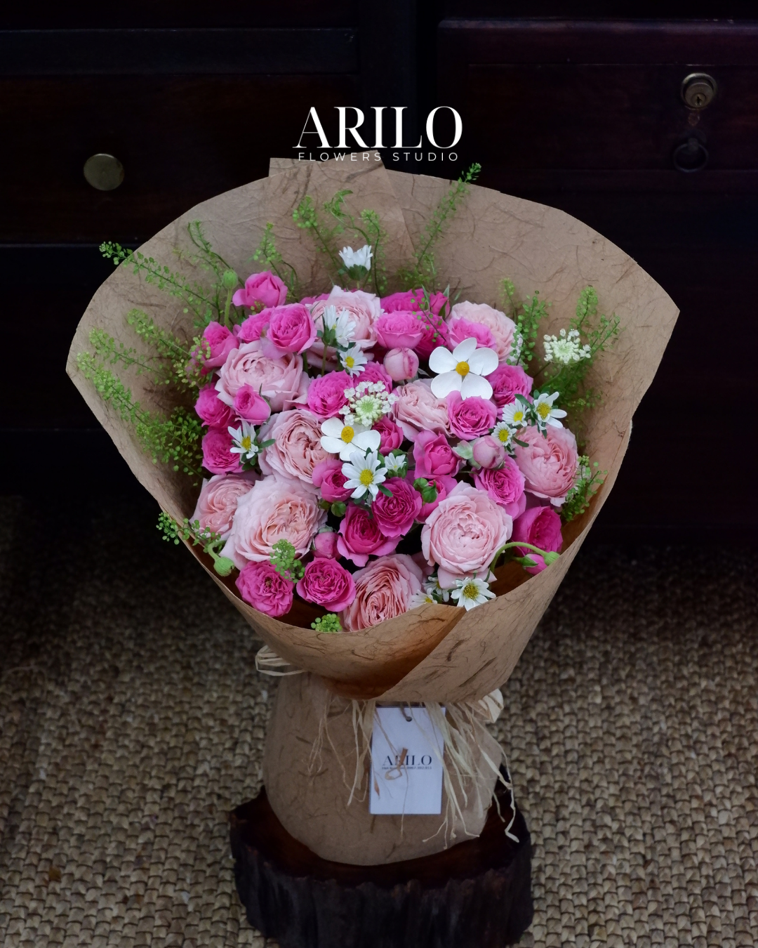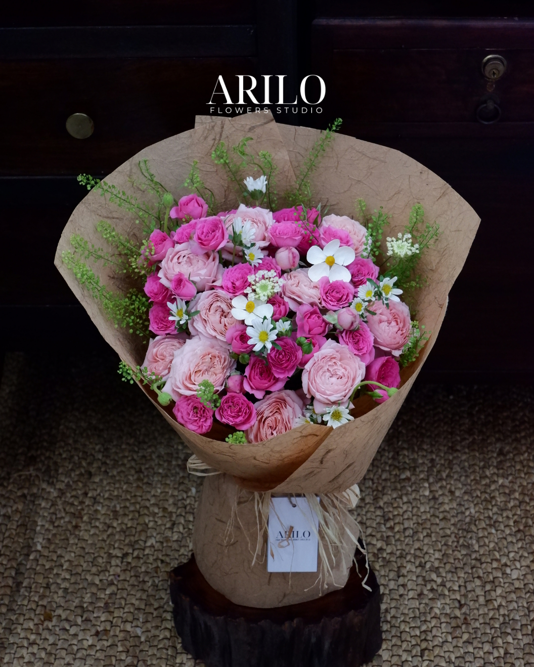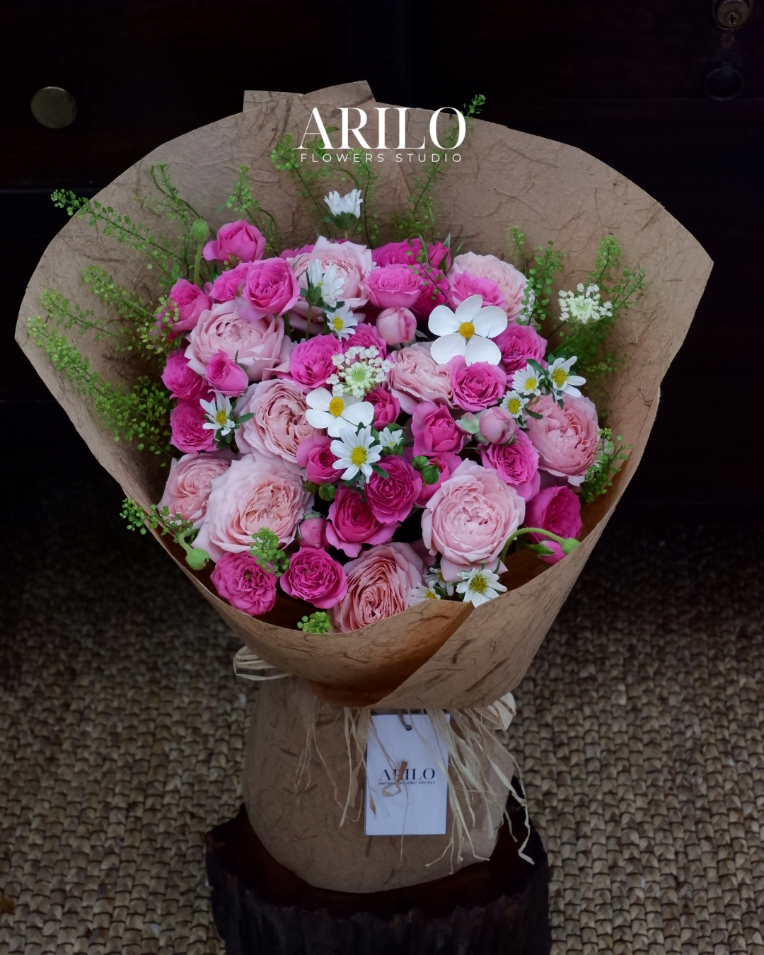 Dưới bàn tay khéo léo của nghệ nhân Arilo, bó hoa không chỉ là sự kết hợp của những đóa hoa mà là một tác phẩm nghệ thuật. Chúng tôi sử dụng giấy gói Hàn Quốc cao cấp (như giấy mờ, giấy lụa) với tông màu trang nhã (ví dụ: kem, xám khói, đen tuyền) làm nổi bật vẻ đẹp kiêu sa của hoa hồng. Điểm nhấn là chiếc nơ lụa mềm mại được thắt thủ công, tạo nên một tổng thể sang trọng và hiện đại.