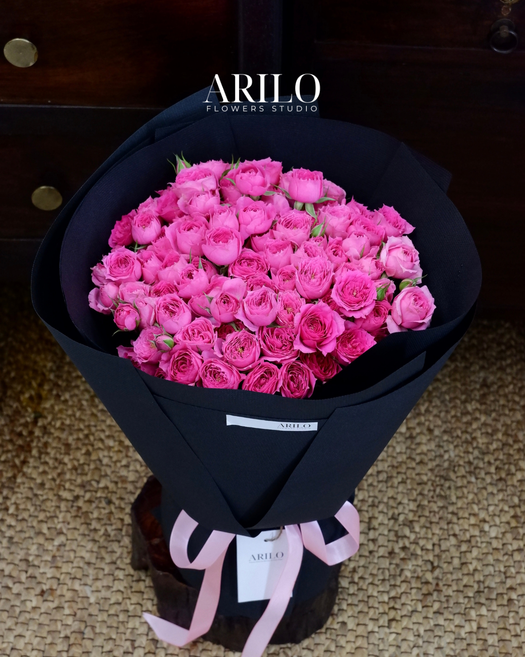Dưới bàn tay khéo léo của nghệ nhân Arilo, bó hoa không chỉ là sự kết hợp của những đóa hoa mà là một tác phẩm nghệ thuật. Chúng tôi sử dụng giấy gói Hàn Quốc cao cấp (như giấy mờ, giấy lụa) với tông màu trang nhã (ví dụ: kem, xám khói, đen tuyền) làm nổi bật vẻ đẹp kiêu sa của hoa hồng. Điểm nhấn là chiếc nơ lụa mềm mại được thắt thủ công, tạo nên một tổng thể sang trọng và hiện đại.