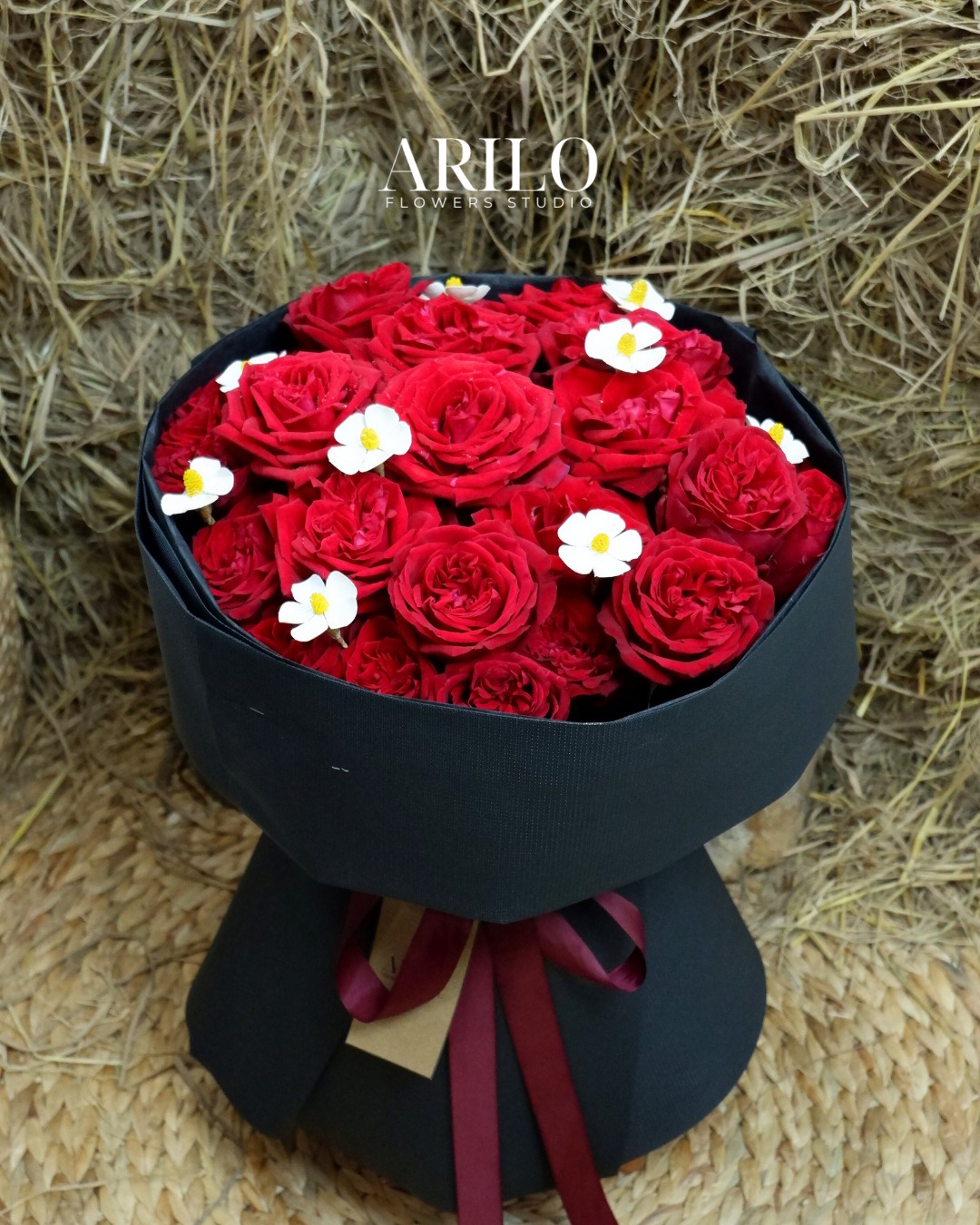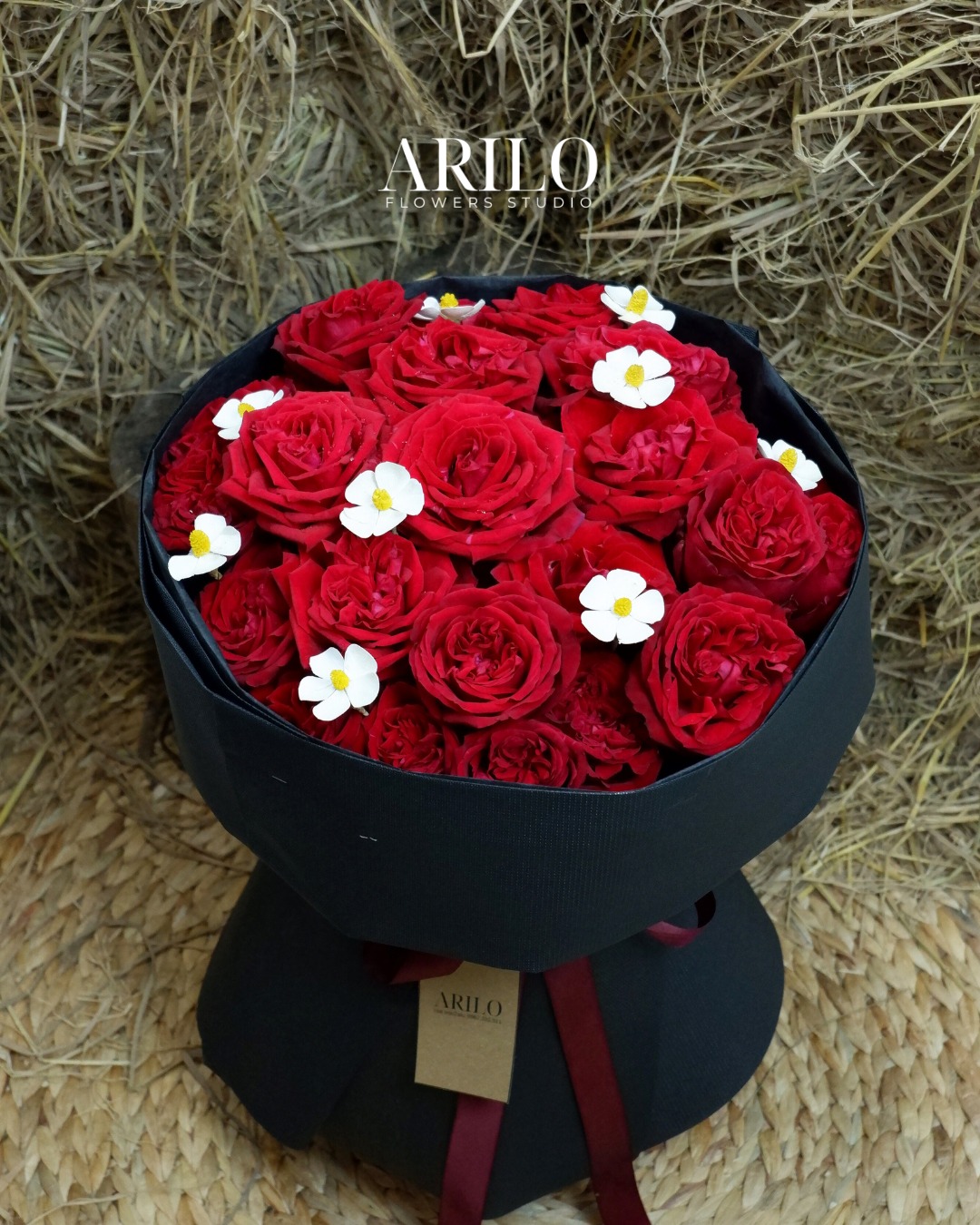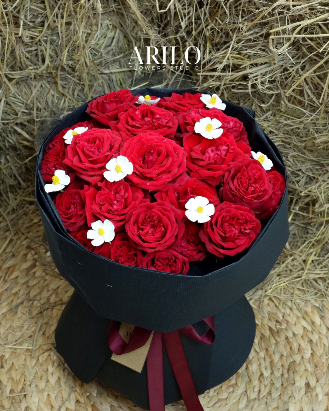 Dưới bàn tay khéo léo của nghệ nhân Arilo, bó hoa không chỉ là sự kết hợp của những đóa hoa mà là một tác phẩm nghệ thuật. Chúng tôi sử dụng giấy gói Hàn Quốc cao cấp (như giấy mờ, giấy lụa) với tông màu trang nhã (ví dụ: kem, xám khói, đen tuyền) làm nổi bật vẻ đẹp kiêu sa của hoa hồng. Điểm nhấn là chiếc nơ lụa mềm mại được thắt thủ công, tạo nên một tổng thể sang trọng và hiện đại.