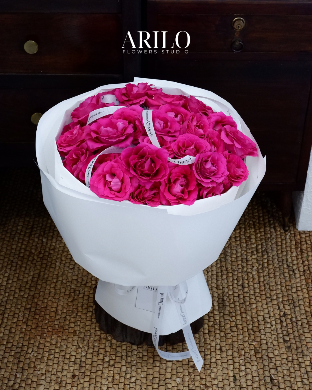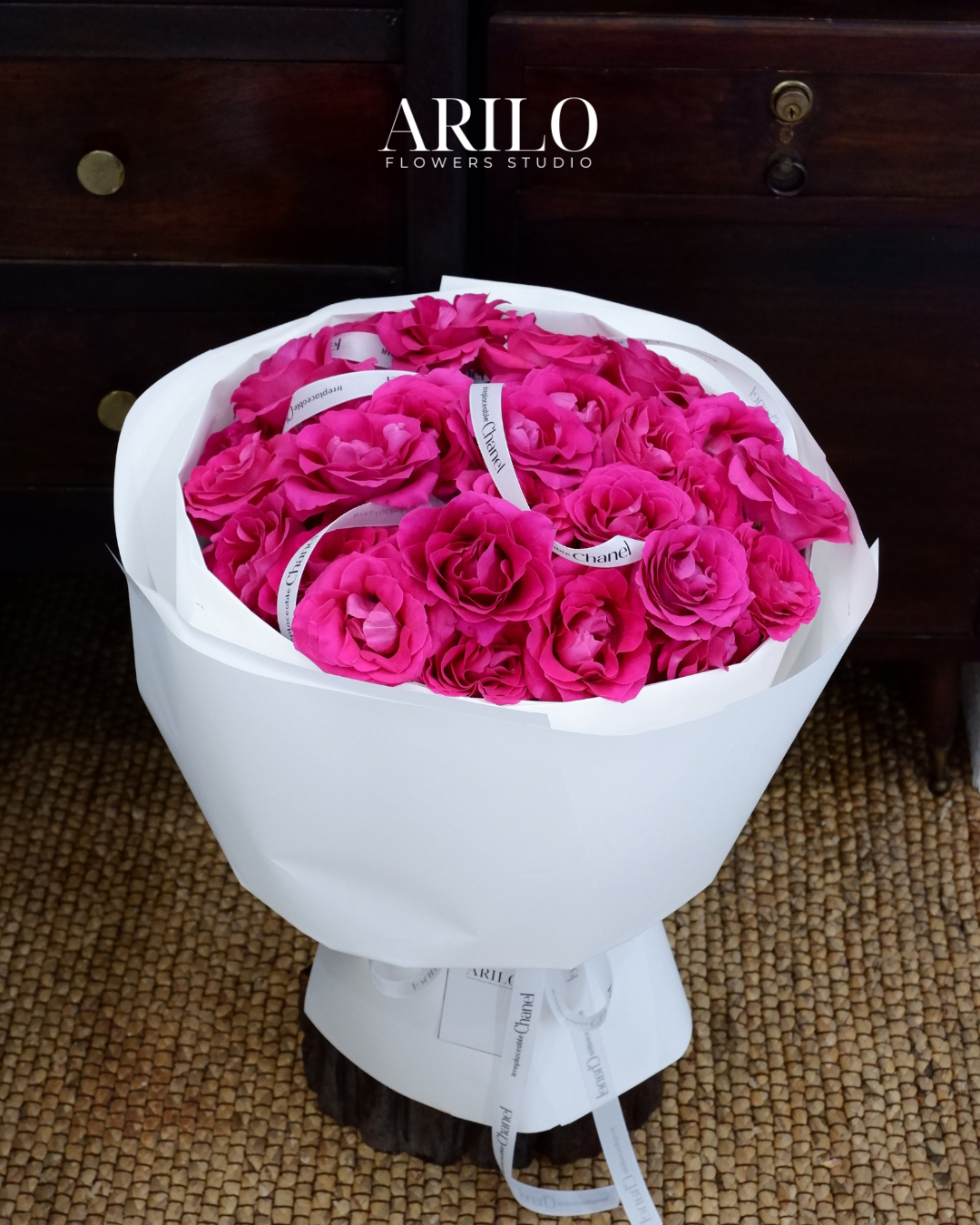 Dưới bàn tay khéo léo của nghệ nhân Arilo, bó hoa không chỉ là sự kết hợp của những đóa hoa mà là một tác phẩm nghệ thuật. Chúng tôi sử dụng giấy gói Hàn Quốc cao cấp (như giấy mờ, giấy lụa) với tông màu trang nhã (ví dụ: kem, xám khói, đen tuyền) làm nổi bật vẻ đẹp kiêu sa của hoa hồng. Điểm nhấn là chiếc nơ lụa mềm mại được thắt thủ công, tạo nên một tổng thể sang trọng và hiện đại.