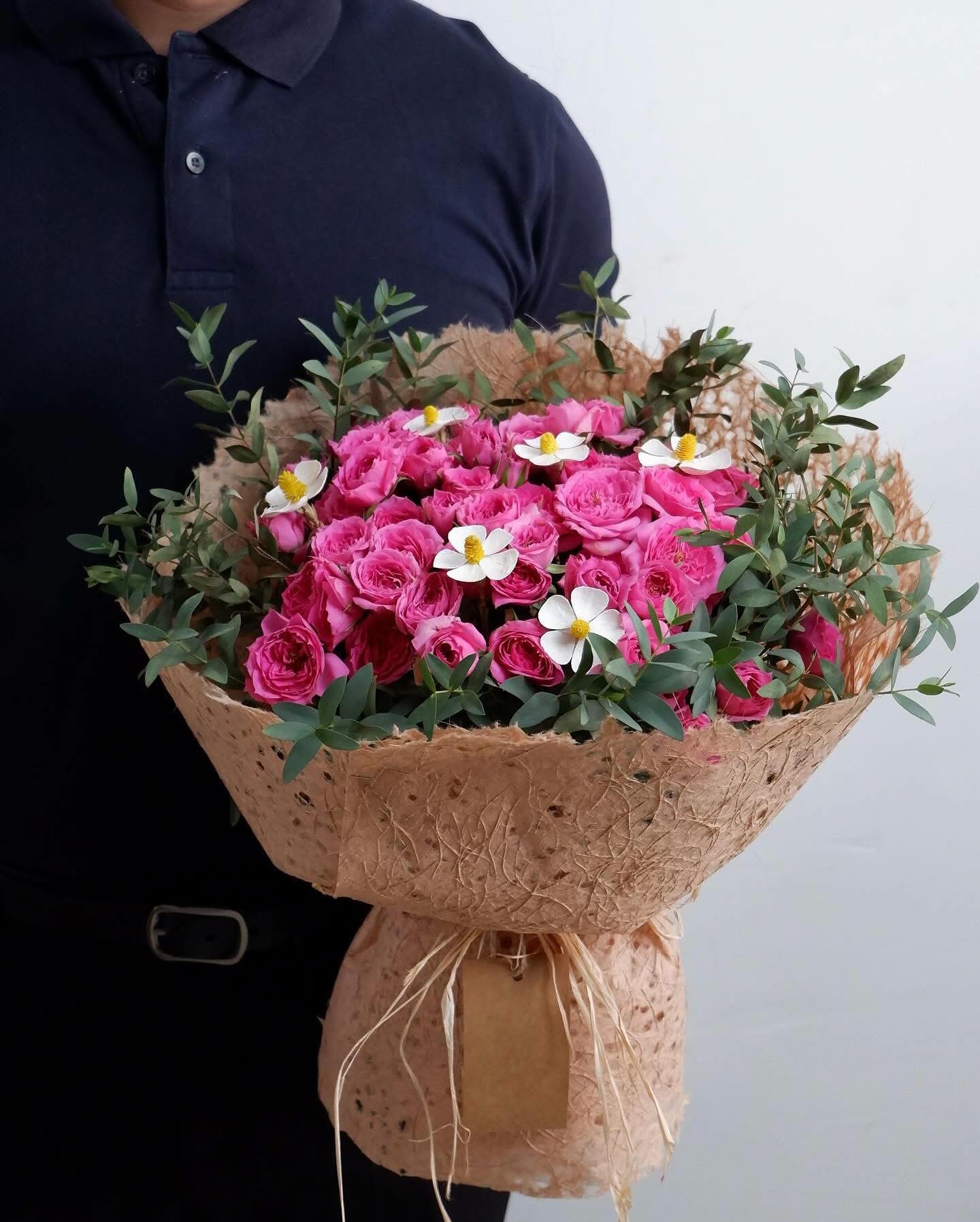 Dưới bàn tay khéo léo của nghệ nhân Arilo, bó hoa không chỉ là sự kết hợp của những đóa hoa mà là một tác phẩm nghệ thuật. Chúng tôi sử dụng giấy gói Hàn Quốc cao cấp (như giấy mờ, giấy lụa) với tông màu trang nhã (ví dụ: kem, xám khói, đen tuyền) làm nổi bật vẻ đẹp kiêu sa của hoa hồng. Điểm nhấn là chiếc nơ lụa mềm mại được thắt thủ công, tạo nên một tổng thể sang trọng và hiện đại.