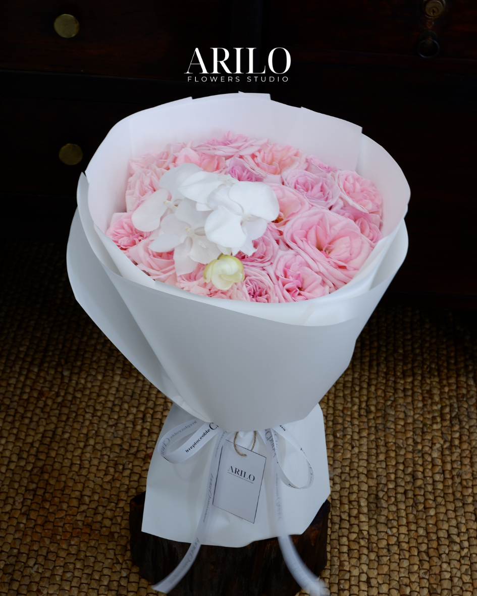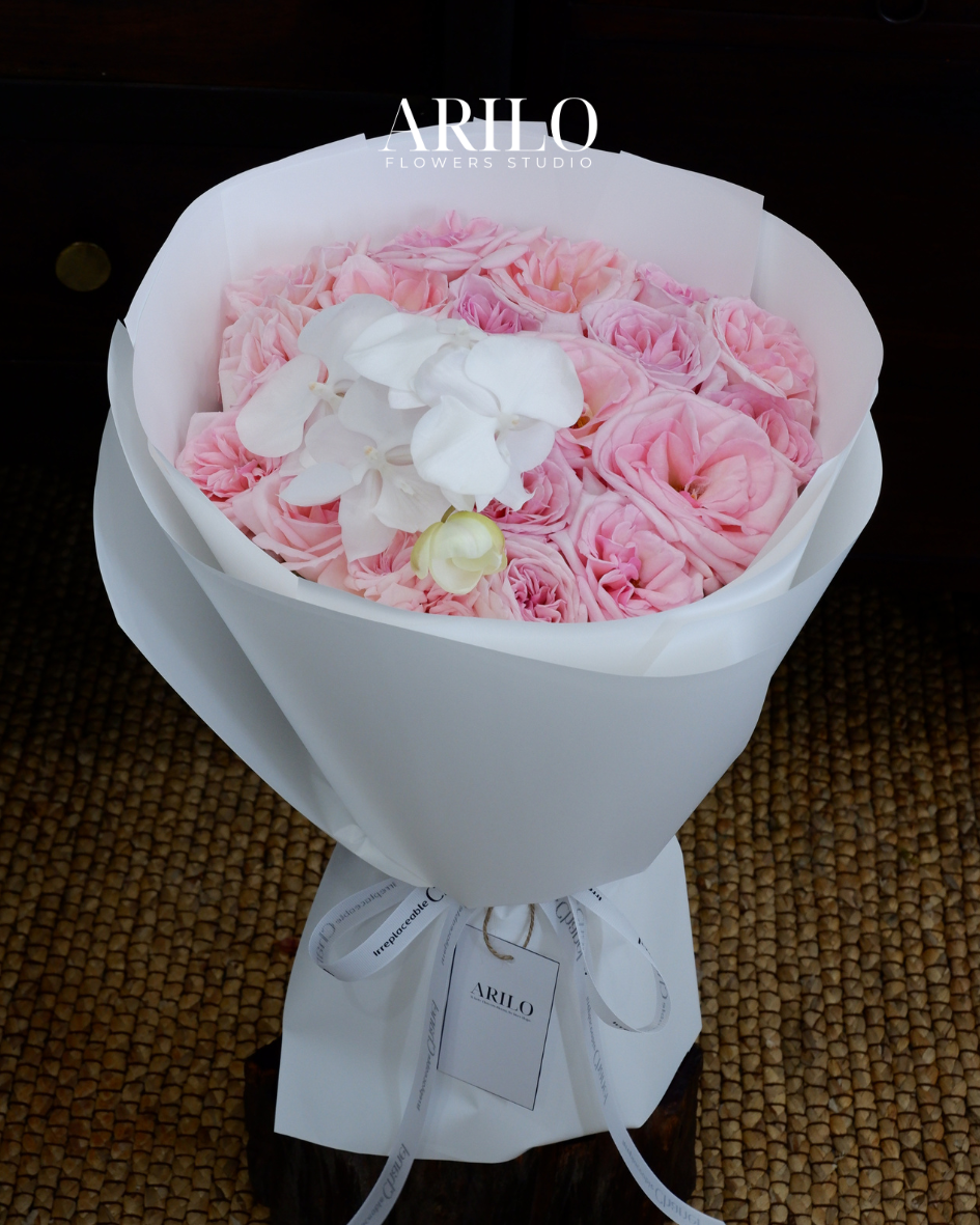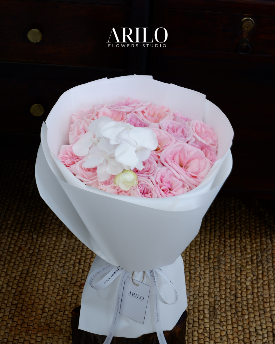 Dưới bàn tay khéo léo của nghệ nhân Arilo, bó hoa không chỉ là sự kết hợp của những đóa hoa mà là một tác phẩm nghệ thuật. Chúng tôi sử dụng giấy gói Hàn Quốc cao cấp (như giấy mờ, giấy lụa) với tông màu trang nhã (ví dụ: kem, xám khói, đen tuyền) làm nổi bật vẻ đẹp kiêu sa của hoa hồng. Điểm nhấn là chiếc nơ lụa mềm mại được thắt thủ công, tạo nên một tổng thể sang trọng và hiện đại.