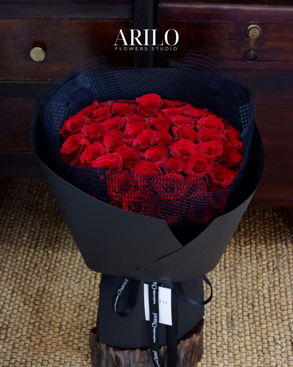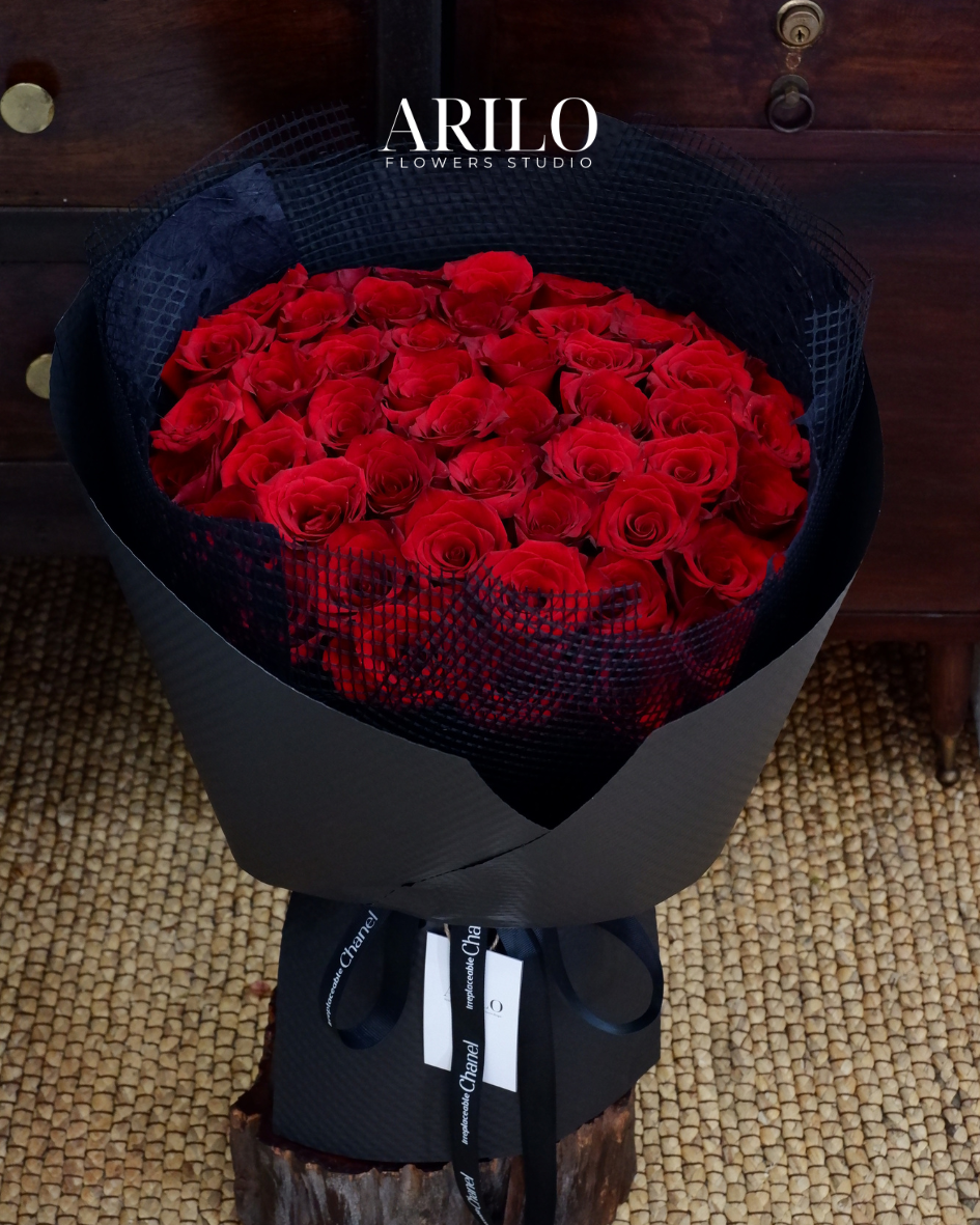 Dưới bàn tay khéo léo của nghệ nhân Arilo, bó hoa không chỉ là sự kết hợp của những đóa hoa mà là một tác phẩm nghệ thuật. Chúng tôi sử dụng giấy gói Hàn Quốc cao cấp (như giấy mờ, giấy lụa) với tông màu trang nhã (ví dụ: kem, xám khói, đen tuyền) làm nổi bật vẻ đẹp kiêu sa của hoa hồng. Điểm nhấn là chiếc nơ lụa mềm mại được thắt thủ công, tạo nên một tổng thể sang trọng và hiện đại.