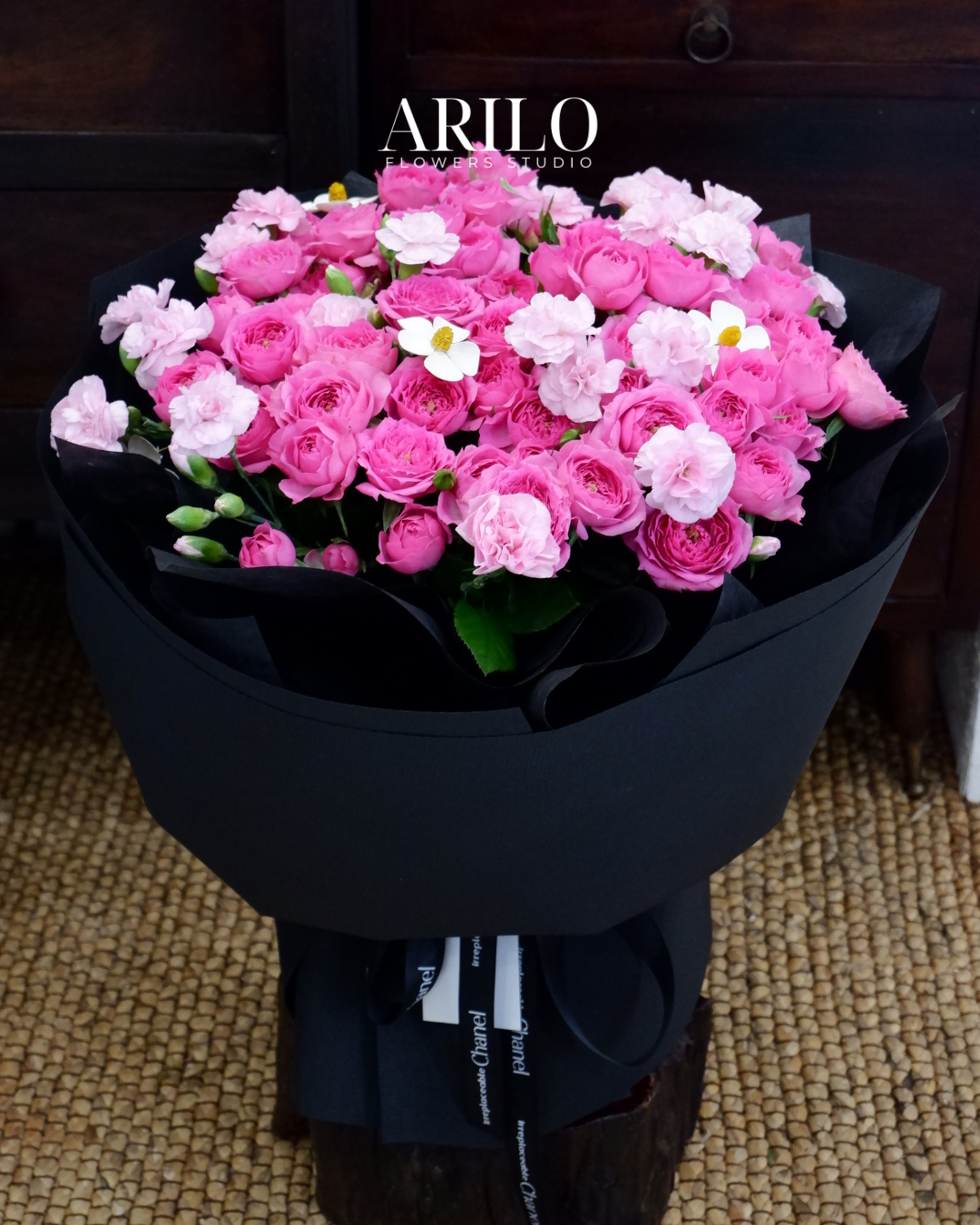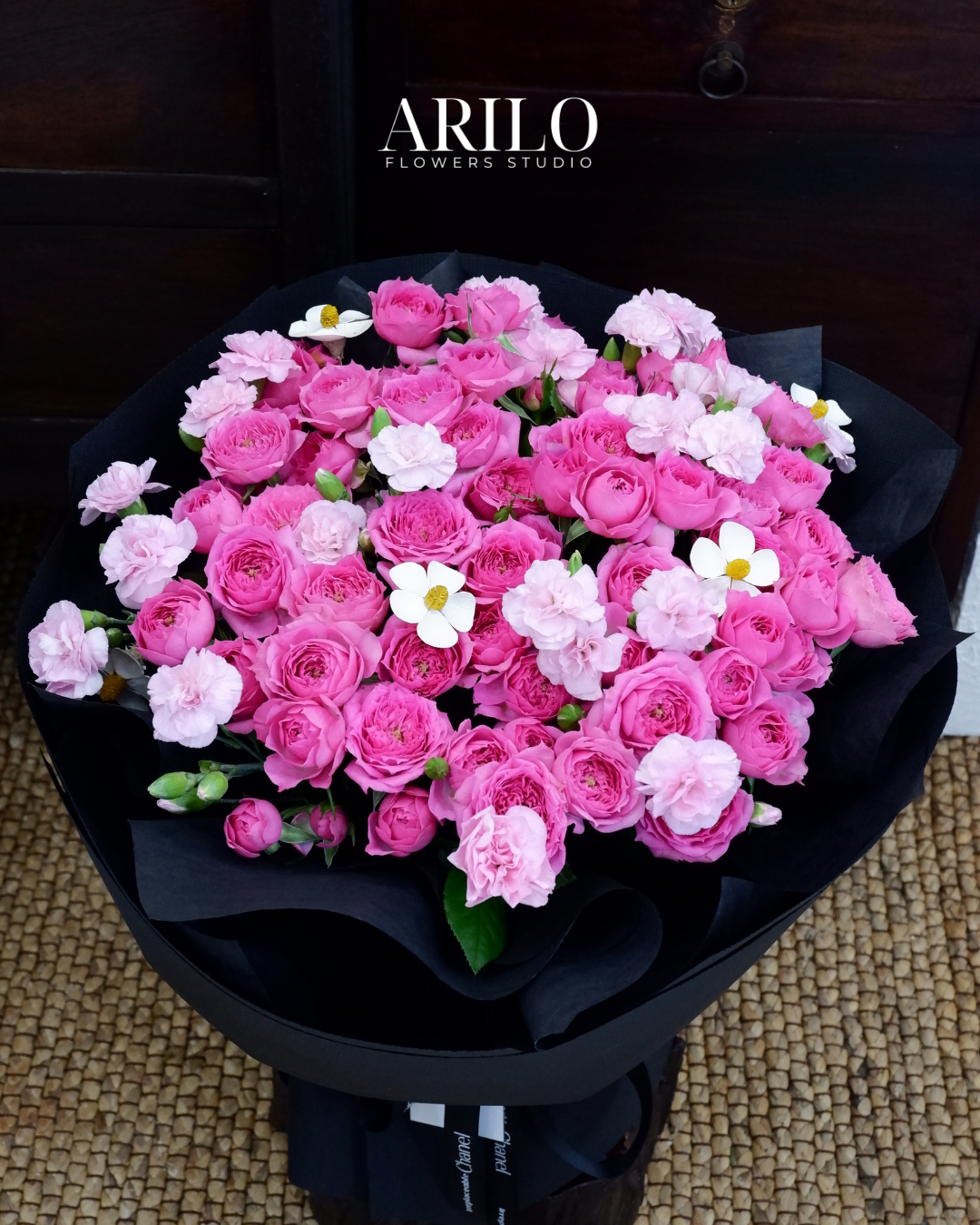 Dưới bàn tay khéo léo của nghệ nhân Arilo, bó hoa không chỉ là sự kết hợp của những đóa hoa mà là một tác phẩm nghệ thuật. Chúng tôi sử dụng giấy gói Hàn Quốc cao cấp (như giấy mờ, giấy lụa) với tông màu trang nhã (ví dụ: kem, xám khói, đen tuyền) làm nổi bật vẻ đẹp kiêu sa của hoa hồng. Điểm nhấn là chiếc nơ lụa mềm mại được thắt thủ công, tạo nên một tổng thể sang trọng và hiện đại.