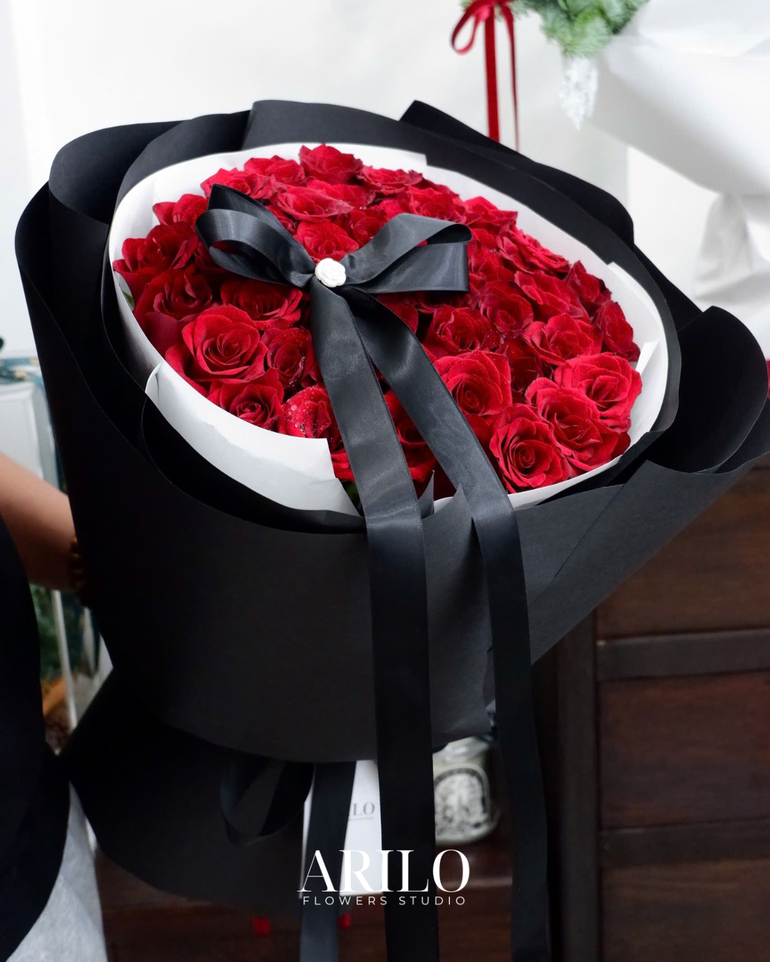 Dưới bàn tay khéo léo của nghệ nhân Arilo, bó hoa không chỉ là sự kết hợp của những đóa hoa mà là một tác phẩm nghệ thuật. Chúng tôi sử dụng giấy gói Hàn Quốc cao cấp (như giấy mờ, giấy lụa) với tông màu trang nhã (ví dụ: kem, xám khói, đen tuyền) làm nổi bật vẻ đẹp kiêu sa của hoa hồng. Điểm nhấn là chiếc nơ lụa mềm mại được thắt thủ công, tạo nên một tổng thể sang trọng và hiện đại.