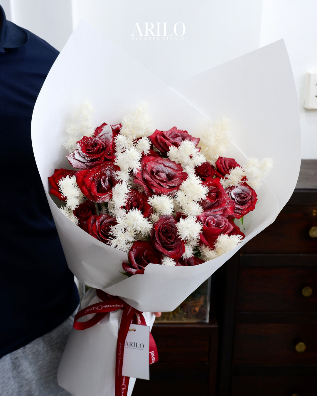 Dưới bàn tay khéo léo của nghệ nhân Arilo, bó hoa không chỉ là sự kết hợp của những đóa hoa mà là một tác phẩm nghệ thuật. Chúng tôi sử dụng giấy gói Hàn Quốc cao cấp (như giấy mờ, giấy lụa) với tông màu trang nhã (ví dụ: kem, xám khói, đen tuyền) làm nổi bật vẻ đẹp kiêu sa của hoa hồng. Điểm nhấn là chiếc nơ lụa mềm mại được thắt thủ công, tạo nên một tổng thể sang trọng và hiện đại.