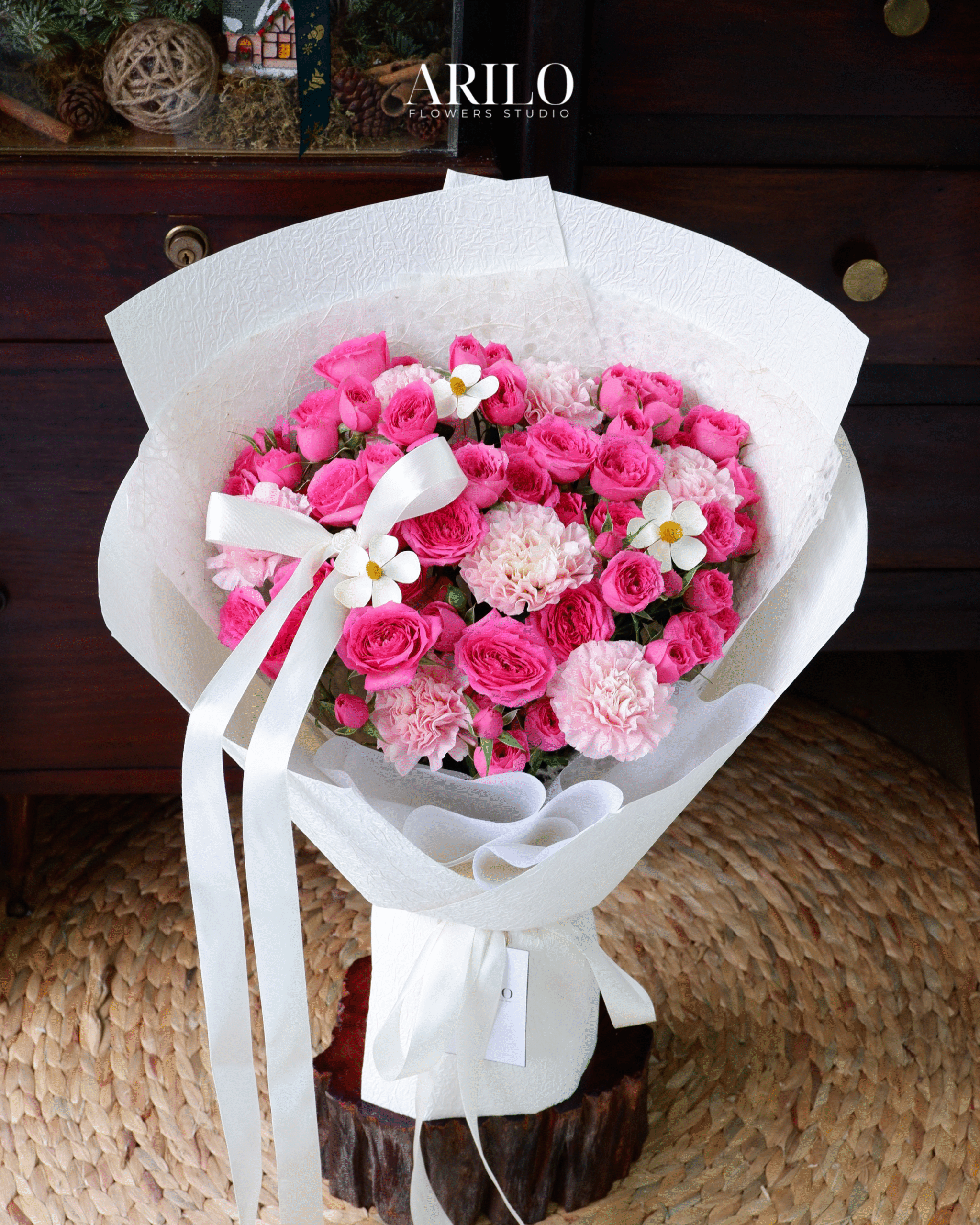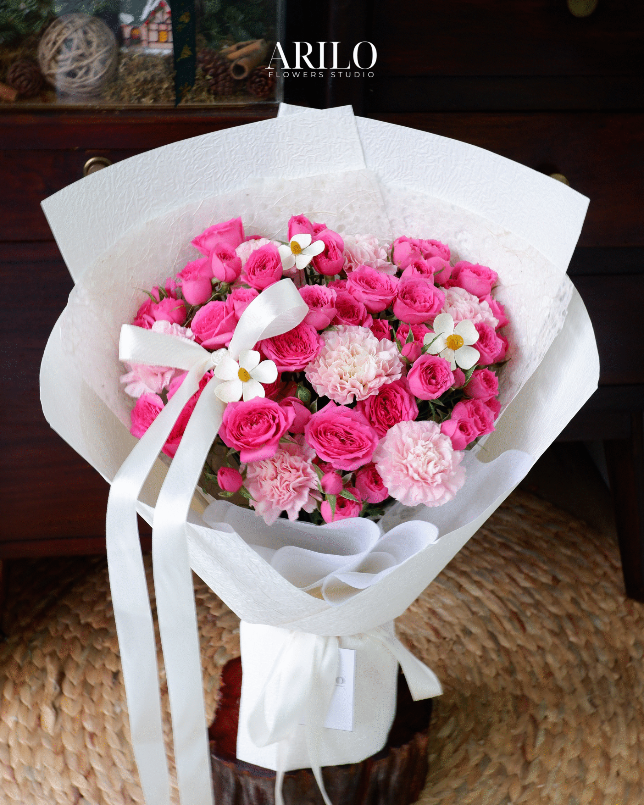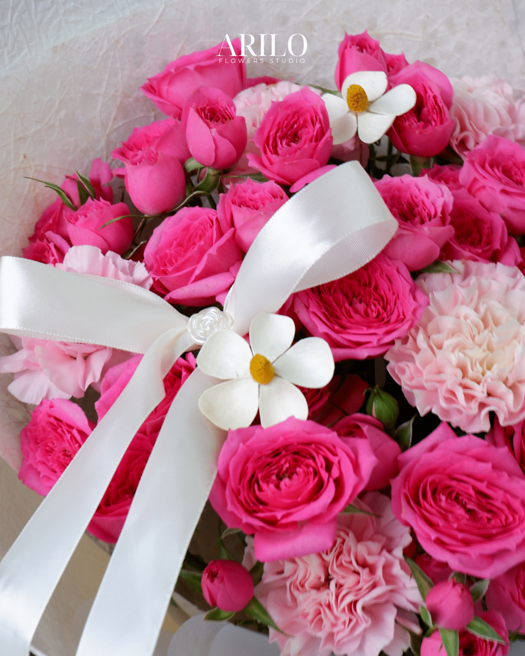 Dưới bàn tay khéo léo của nghệ nhân Arilo, bó hoa không chỉ là sự kết hợp của những đóa hoa mà là một tác phẩm nghệ thuật. Chúng tôi sử dụng giấy gói Hàn Quốc cao cấp (như giấy mờ, giấy lụa) với tông màu trang nhã (ví dụ: kem, xám khói, đen tuyền) làm nổi bật vẻ đẹp kiêu sa của hoa hồng. Điểm nhấn là chiếc nơ lụa mềm mại được thắt thủ công, tạo nên một tổng thể sang trọng và hiện đại.