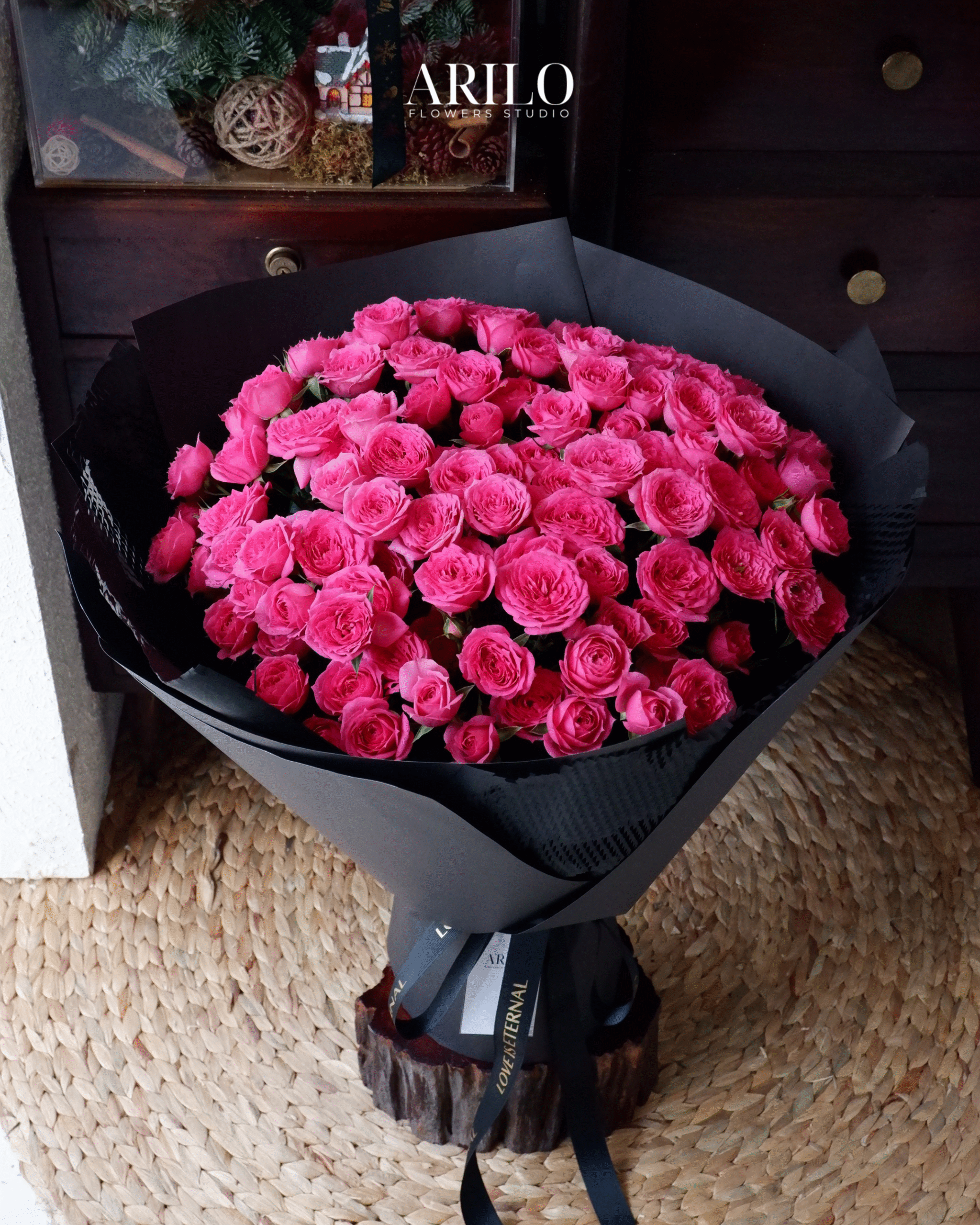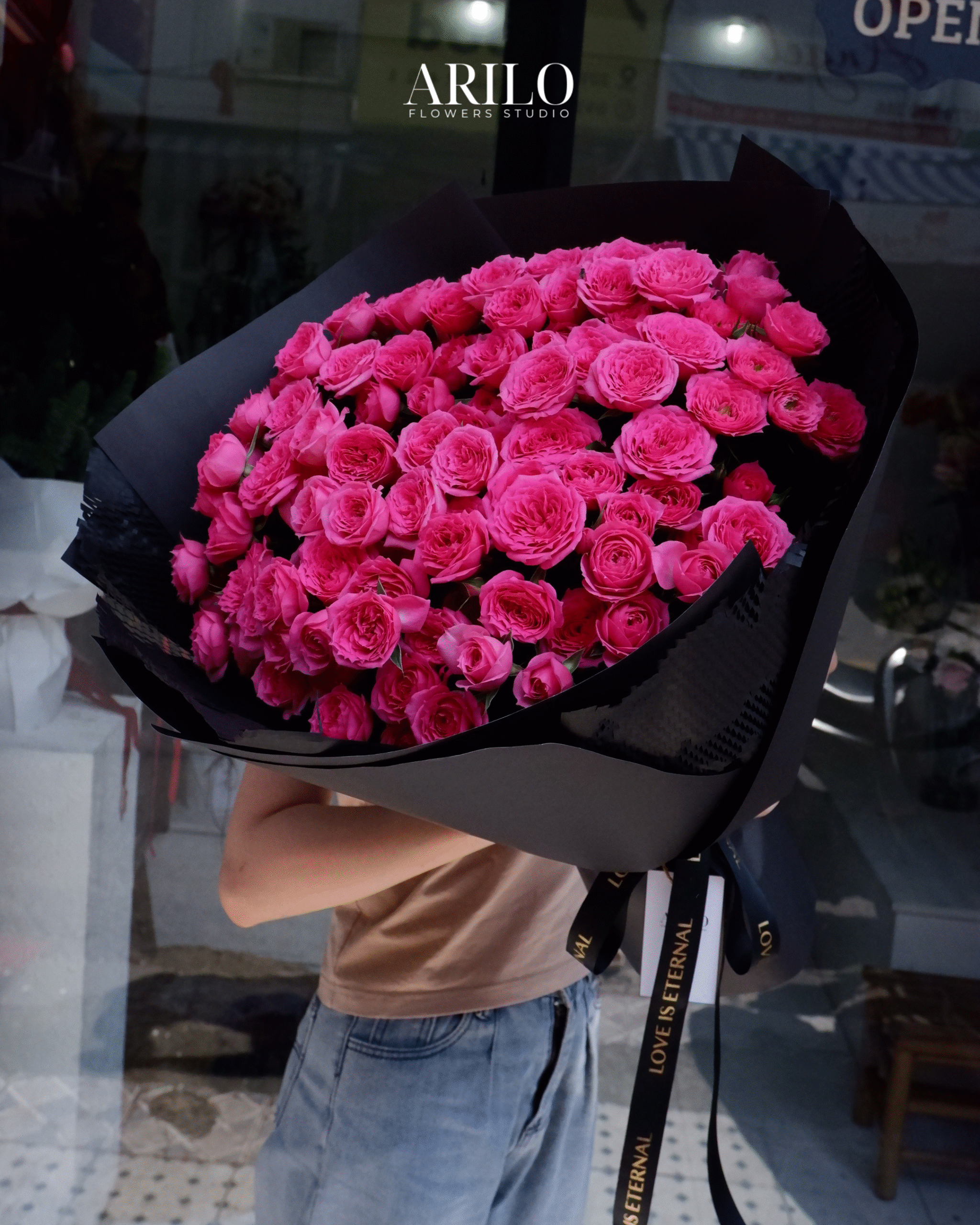 Dưới bàn tay khéo léo của nghệ nhân Arilo, bó hoa không chỉ là sự kết hợp của những đóa hoa mà là một tác phẩm nghệ thuật. Chúng tôi sử dụng giấy gói Hàn Quốc cao cấp (như giấy mờ, giấy lụa) với tông màu trang nhã (ví dụ: kem, xám khói, đen tuyền) làm nổi bật vẻ đẹp kiêu sa của hoa hồng. Điểm nhấn là chiếc nơ lụa mềm mại được thắt thủ công, tạo nên một tổng thể sang trọng và hiện đại.