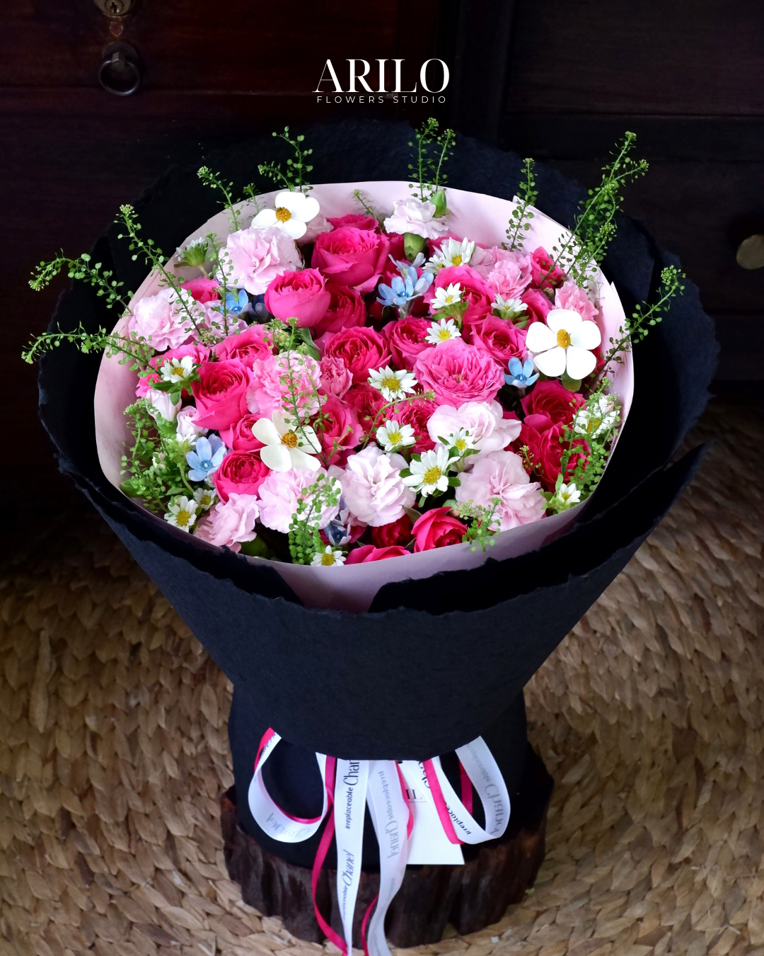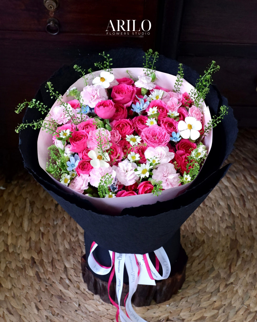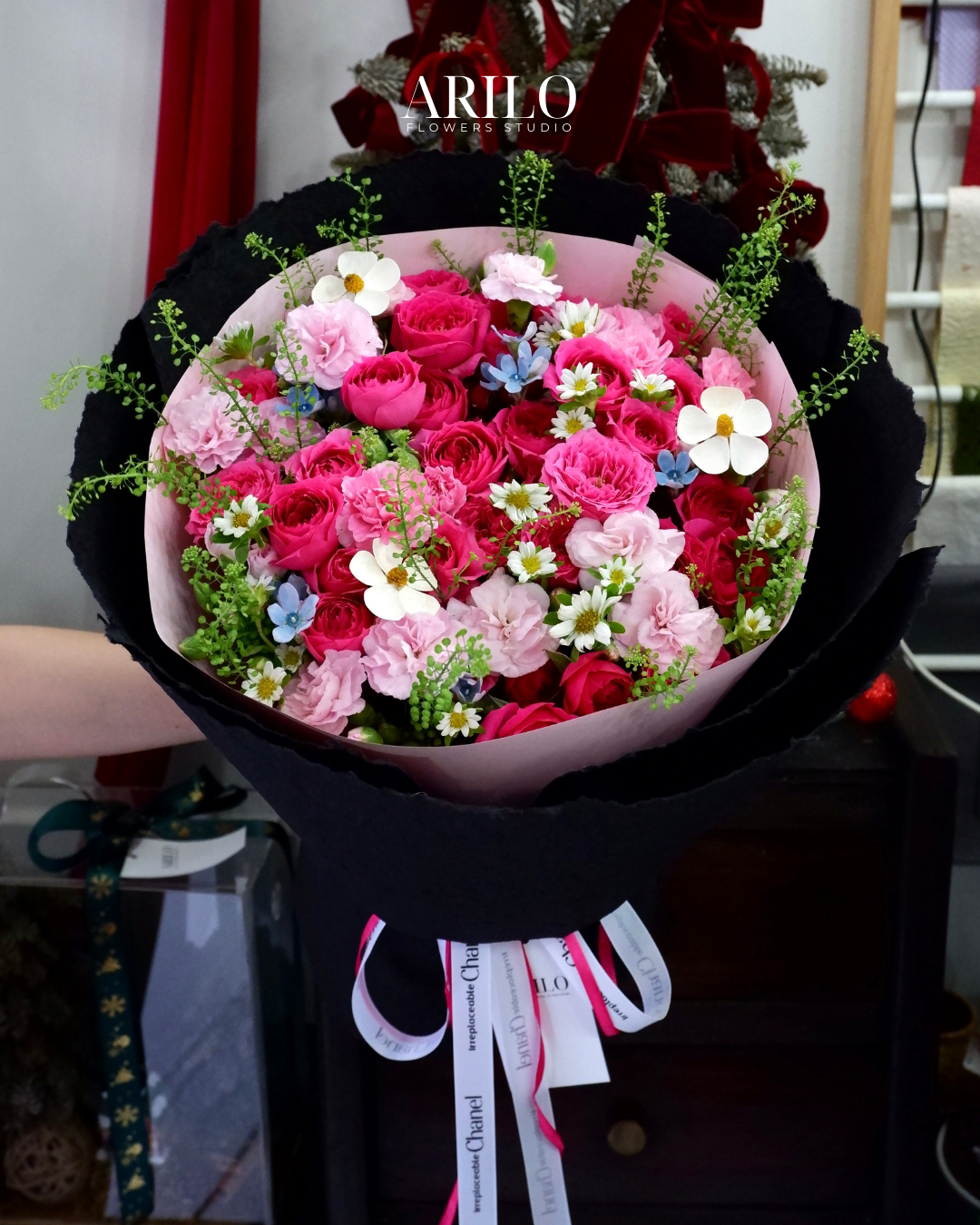 Dưới bàn tay khéo léo của nghệ nhân Arilo, bó hoa không chỉ là sự kết hợp của những đóa hoa mà là một tác phẩm nghệ thuật. Chúng tôi sử dụng giấy gói Hàn Quốc cao cấp (như giấy mờ, giấy lụa) với tông màu trang nhã (ví dụ: kem, xám khói, đen tuyền) làm nổi bật vẻ đẹp kiêu sa của hoa hồng. Điểm nhấn là chiếc nơ lụa mềm mại được thắt thủ công, tạo nên một tổng thể sang trọng và hiện đại.