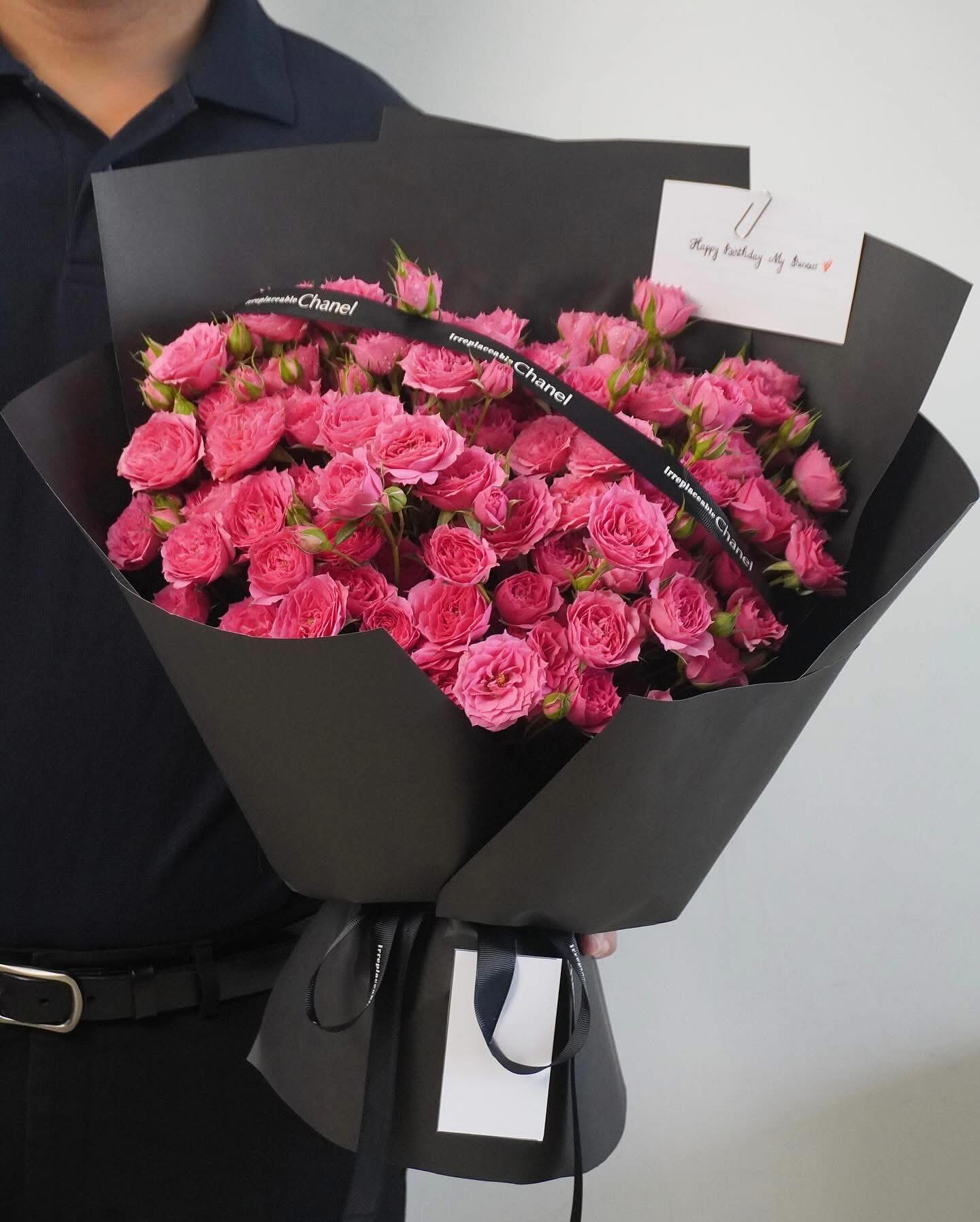 Dưới bàn tay khéo léo của nghệ nhân Arilo, bó hoa không chỉ là sự kết hợp của những đóa hoa mà là một tác phẩm nghệ thuật. Chúng tôi sử dụng giấy gói Hàn Quốc cao cấp (như giấy mờ, giấy lụa) với tông màu trang nhã (ví dụ: kem, xám khói, đen tuyền) làm nổi bật vẻ đẹp kiêu sa của hoa hồng. Điểm nhấn là chiếc nơ lụa mềm mại được thắt thủ công, tạo nên một tổng thể sang trọng và hiện đại.