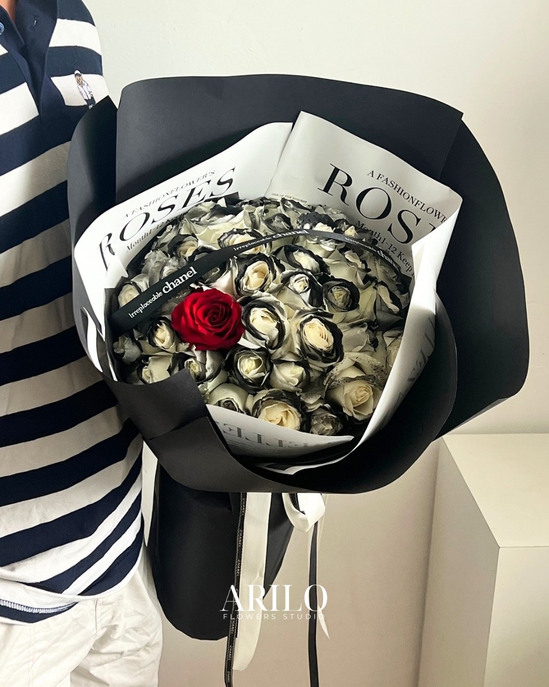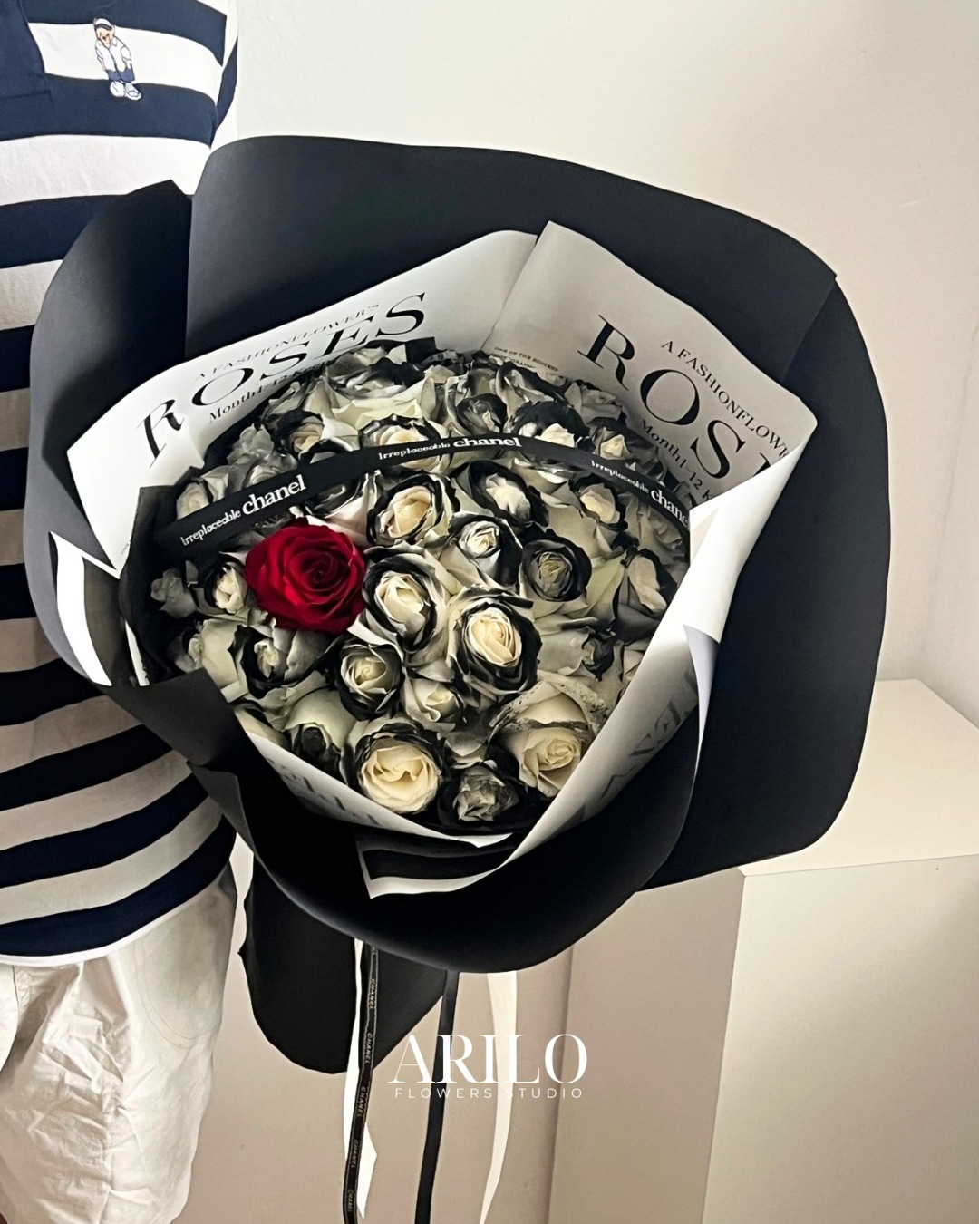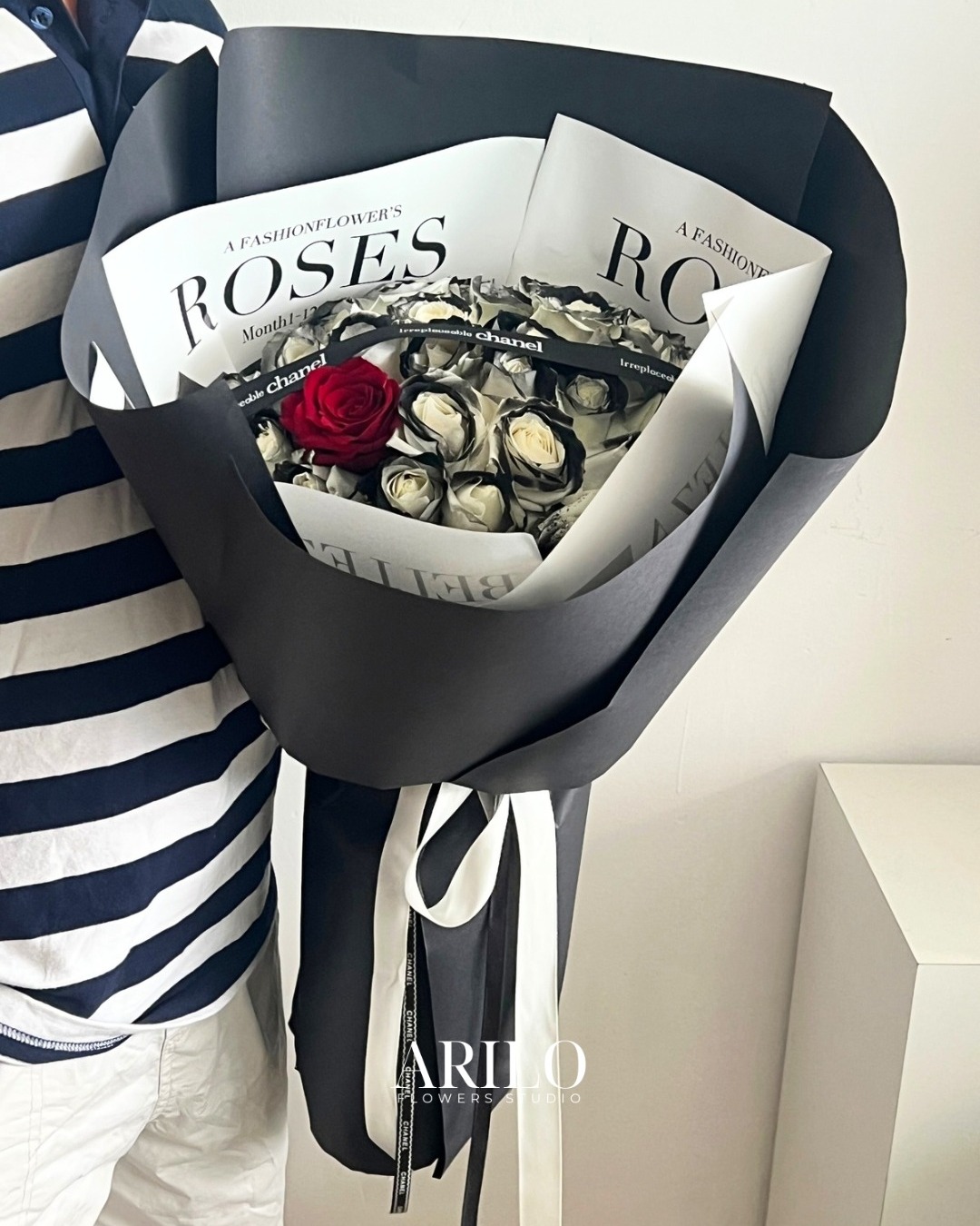 Dưới bàn tay khéo léo của nghệ nhân Arilo, bó hoa không chỉ là sự kết hợp của những đóa hoa mà là một tác phẩm nghệ thuật. Chúng tôi sử dụng giấy gói Hàn Quốc cao cấp (như giấy mờ, giấy lụa) với tông màu trang nhã (ví dụ: kem, xám khói, đen tuyền) làm nổi bật vẻ đẹp kiêu sa của hoa hồng. Điểm nhấn là chiếc nơ lụa mềm mại được thắt thủ công, tạo nên một tổng thể sang trọng và hiện đại.