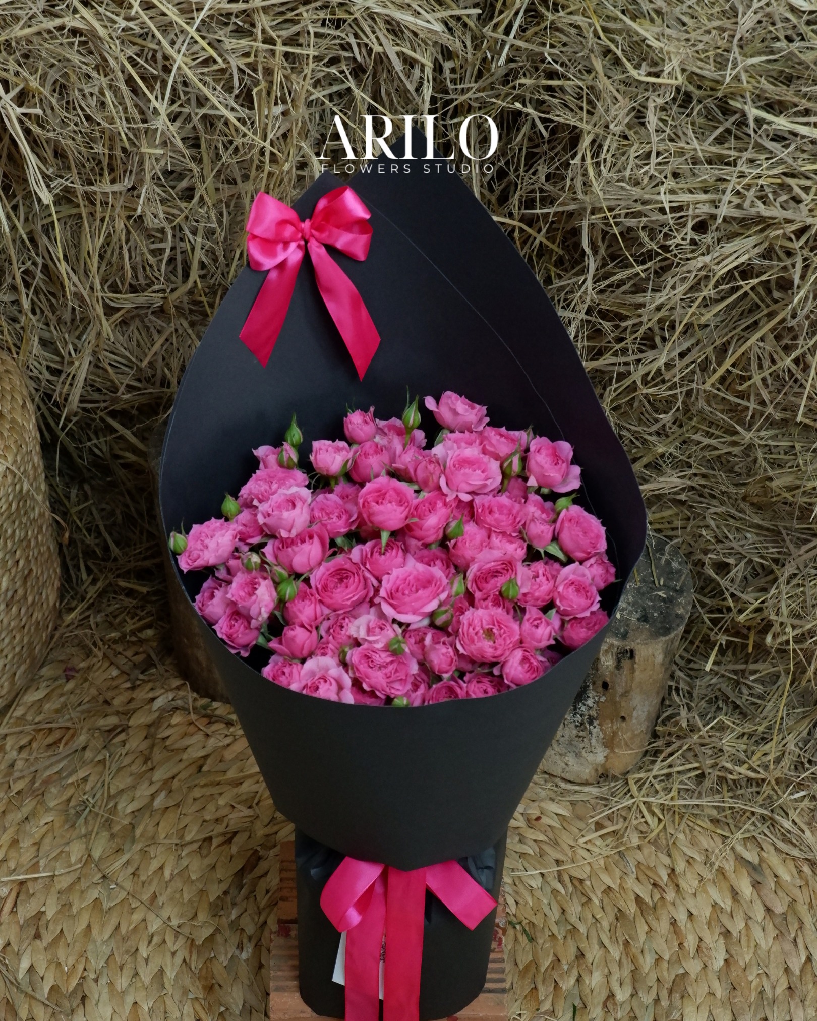 Dưới bàn tay khéo léo của nghệ nhân Arilo, bó hoa không chỉ là sự kết hợp của những đóa hoa mà là một tác phẩm nghệ thuật. Chúng tôi sử dụng giấy gói Hàn Quốc cao cấp (như giấy mờ, giấy lụa) với tông màu trang nhã (ví dụ: kem, xám khói, đen tuyền) làm nổi bật vẻ đẹp kiêu sa của hoa hồng. Điểm nhấn là chiếc nơ lụa mềm mại được thắt thủ công, tạo nên một tổng thể sang trọng và hiện đại.