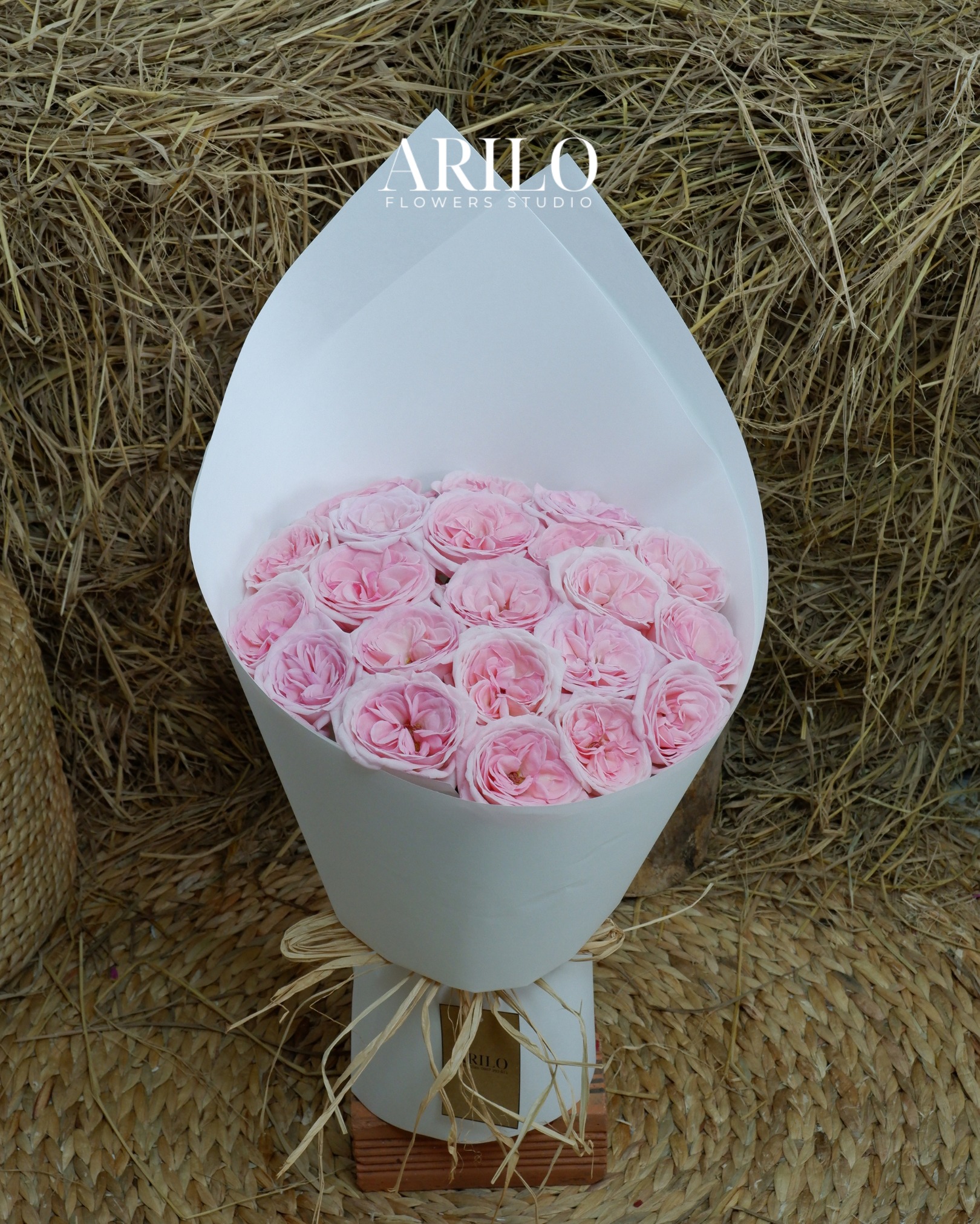 Dưới bàn tay khéo léo của nghệ nhân Arilo, bó hoa không chỉ là sự kết hợp của những đóa hoa mà là một tác phẩm nghệ thuật. Chúng tôi sử dụng giấy gói Hàn Quốc cao cấp (như giấy mờ, giấy lụa) với tông màu trang nhã (ví dụ: kem, xám khói, đen tuyền) làm nổi bật vẻ đẹp kiêu sa của hoa hồng. Điểm nhấn là chiếc nơ lụa mềm mại được thắt thủ công, tạo nên một tổng thể sang trọng và hiện đại.