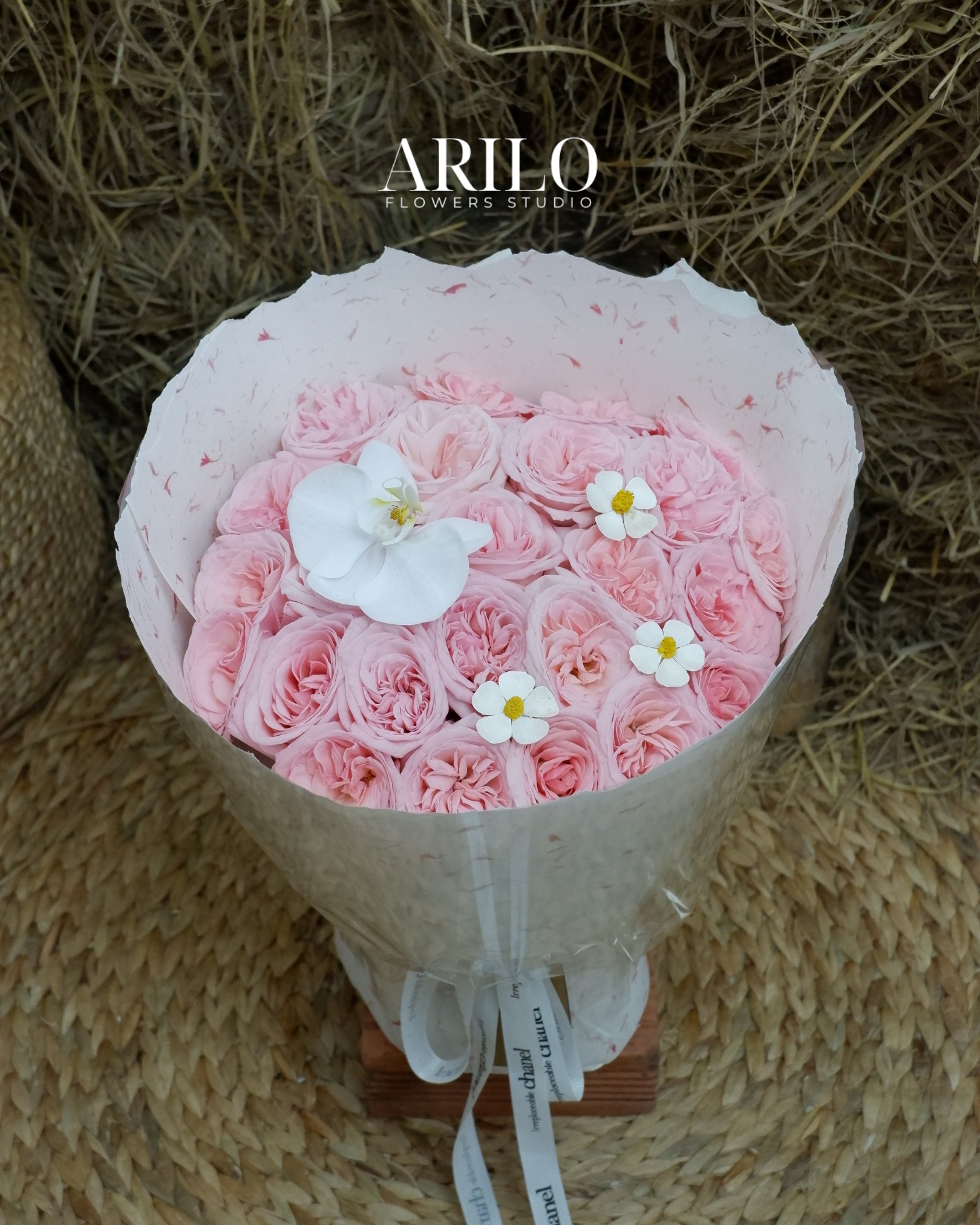 Dưới bàn tay khéo léo của nghệ nhân Arilo, bó hoa không chỉ là sự kết hợp của những đóa hoa mà là một tác phẩm nghệ thuật. Chúng tôi sử dụng giấy gói Hàn Quốc cao cấp (như giấy mờ, giấy lụa) với tông màu trang nhã (ví dụ: kem, xám khói, đen tuyền) làm nổi bật vẻ đẹp kiêu sa của hoa hồng. Điểm nhấn là chiếc nơ lụa mềm mại được thắt thủ công, tạo nên một tổng thể sang trọng và hiện đại.