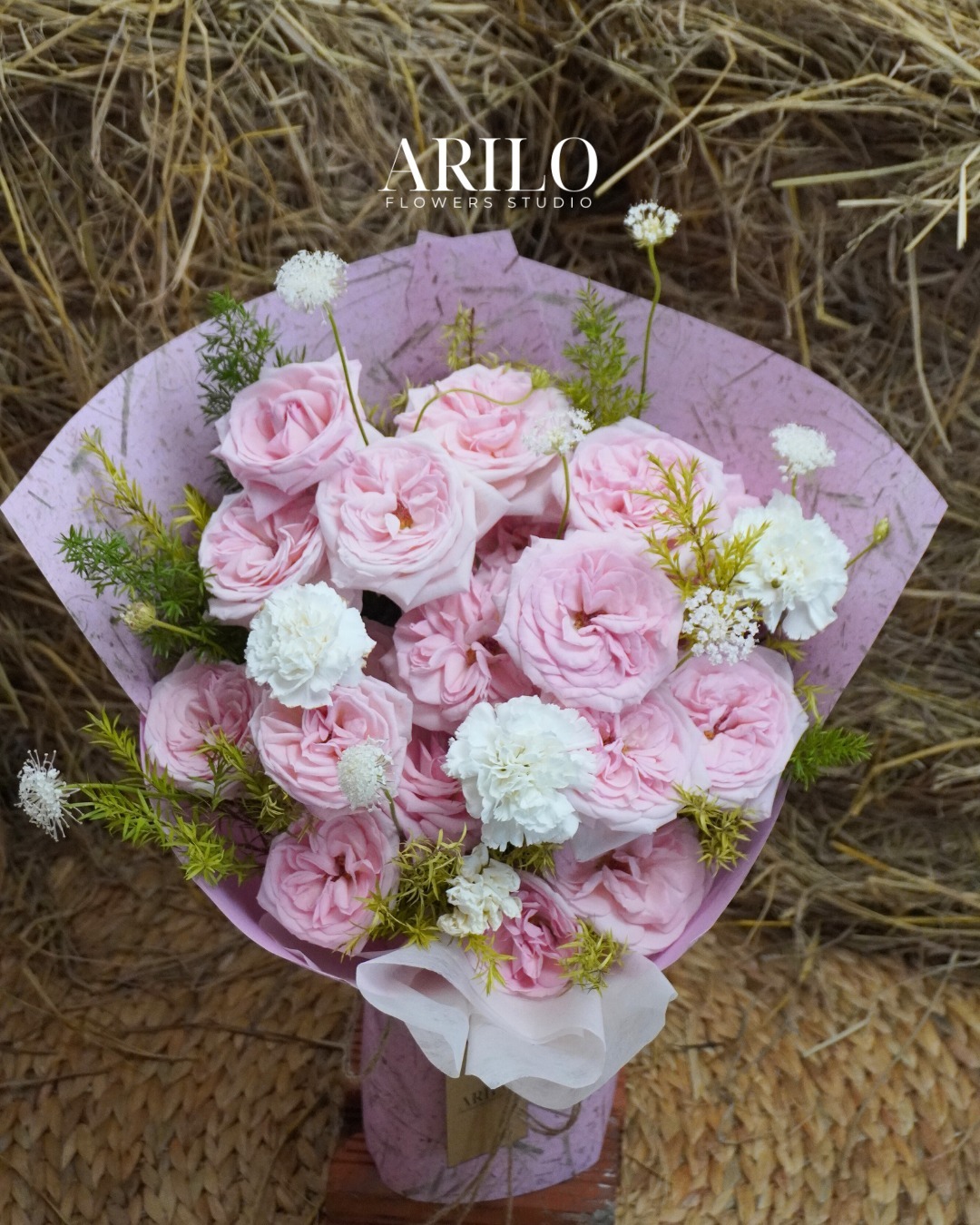 Tất cả được gói trong giấy tone hồng pastel nhã nhặn, phối ruy băng mềm mại, tạo nên một tổng thể hài hòa và tinh tế – đúng tinh thần thiết kế của Shop hoa tươi Sài Gòn – Arilo Flower Studio.