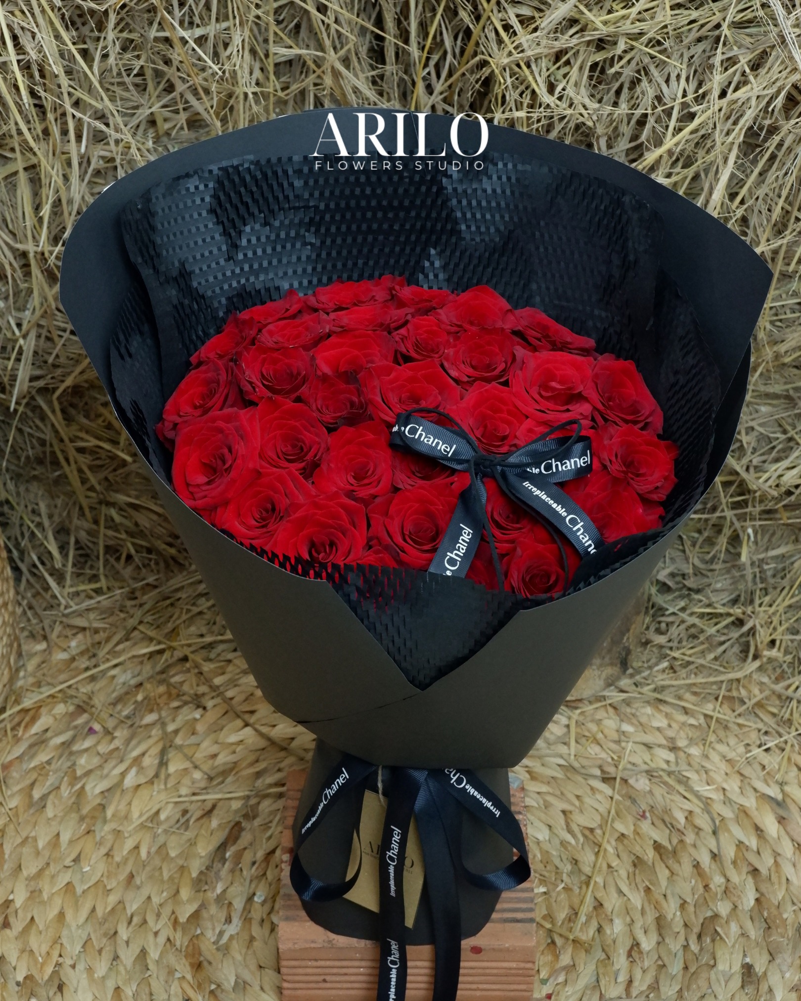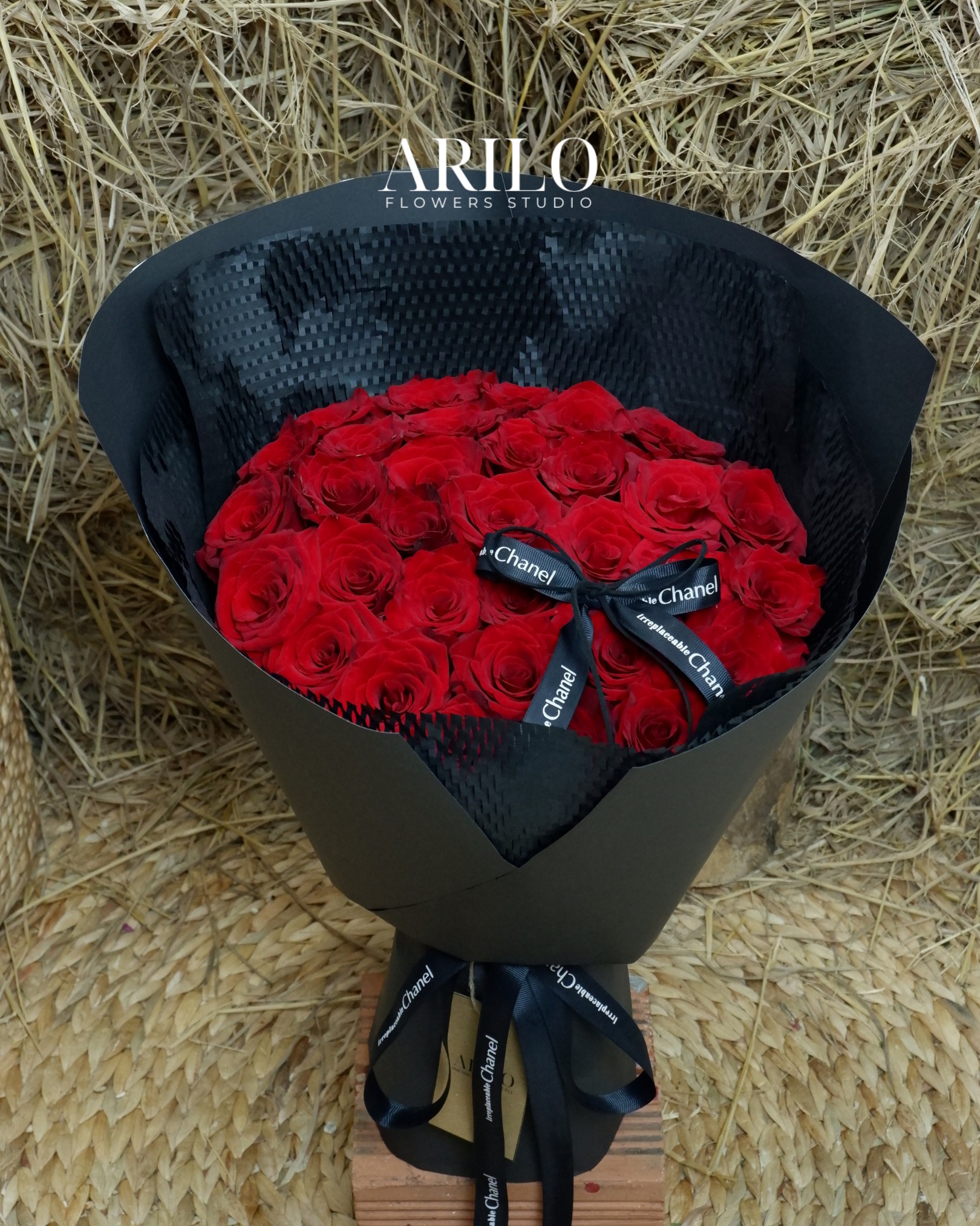 Dưới bàn tay khéo léo của nghệ nhân Arilo, bó hoa không chỉ là sự kết hợp của những đóa hoa mà là một tác phẩm nghệ thuật. Chúng tôi sử dụng giấy gói Hàn Quốc cao cấp (như giấy mờ, giấy lụa) với tông màu trang nhã (ví dụ: kem, xám khói, đen tuyền) làm nổi bật vẻ đẹp kiêu sa của hoa hồng. Điểm nhấn là chiếc nơ lụa mềm mại được thắt thủ công, tạo nên một tổng thể sang trọng và hiện đại.