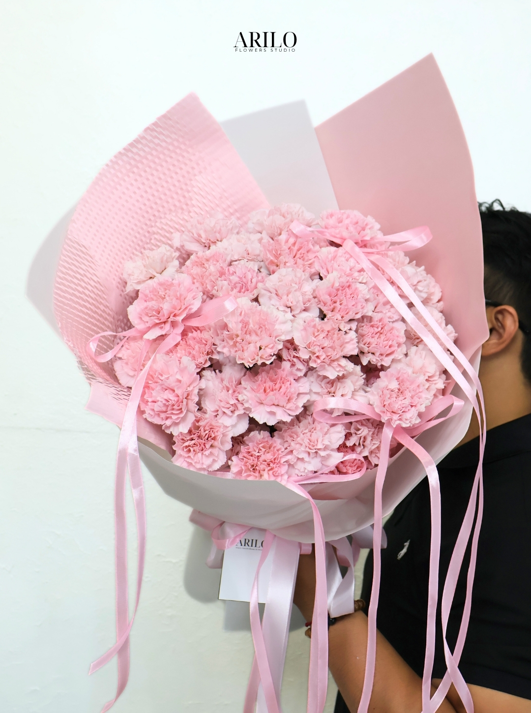 Điểm nổi bật của bó hoa nằm ở sự tối giản nhưng tinh tế trong cách phối màu và bố cục. Không sử dụng quá nhiều loại hoa, thiết kế tập trung vào việc làm nổi bật vẻ đẹp của cẩm chướng thông qua cách sắp xếp đều tay và cân đối. Lớp giấy gói được lựa chọn kỹ lưỡng với tone hồng nhẹ, tạo cảm giác hài hòa và dễ chịu. Phần ruy băng dài buông xuống không chỉ là chi tiết trang trí mà còn giúp bó hoa thêm phần mềm mại, tạo điểm nhấn nhẹ nhàng. Đây là phong cách rất phù hợp với xu hướng hiện đại, khi người ta ưu tiên sự tinh tế hơn là cầu kỳ. Khi cầm trên tay, bó hoa mang lại cảm giác nhẹ nhàng nhưng vẫn đủ chắc chắn, giúp người nhận dễ dàng cảm nhận được sự chăm chút từ người tặng. Chính sự đơn giản có chủ ý này đã tạo nên giá trị riêng cho sản phẩm tại shop hoa tươi sài gòn Arilo Flower Studio.