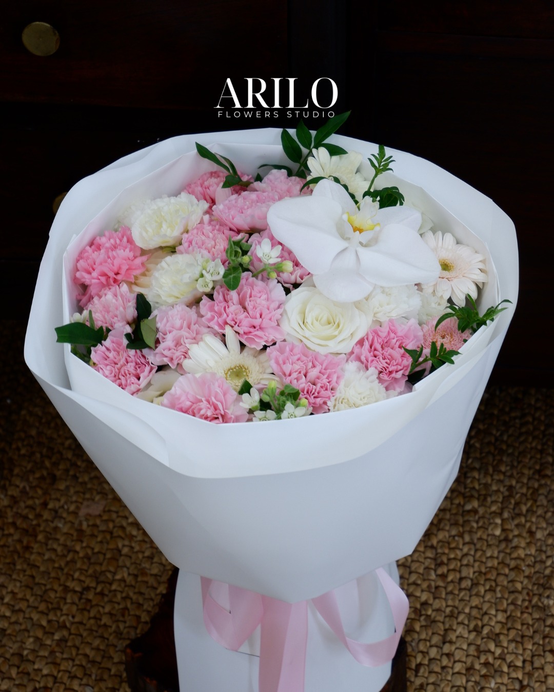 Bức ảnh là sự hòa quyện nhẹ nhàng giữa những gam màu trong trẻo, tạo nên một bó hoa mang cảm giác tinh khôi và rất đỗi nữ tính. Nổi bật ở trung tâm là hoa lan hồ điệp trắng với cánh hoa mềm mại, tượng trưng cho sự thanh cao, chân thành và lời hứa bền lâu. Bao quanh là những cụm hoa cẩm chướng hồng, hoa cẩm chướng trắng xếp lớp dày dặn, mang ý nghĩa của sự quan tâm, yêu thương bền bỉ theo thời gian. Điểm xuyết trong bó hoa là hoa đồng tiền trắng, hoa hồng trắng, hoa lam tinh trắng cùng các loại lá xanh trang trí giúp tổng thể trở nên hài hòa, thoáng đãng và đầy sức sống.