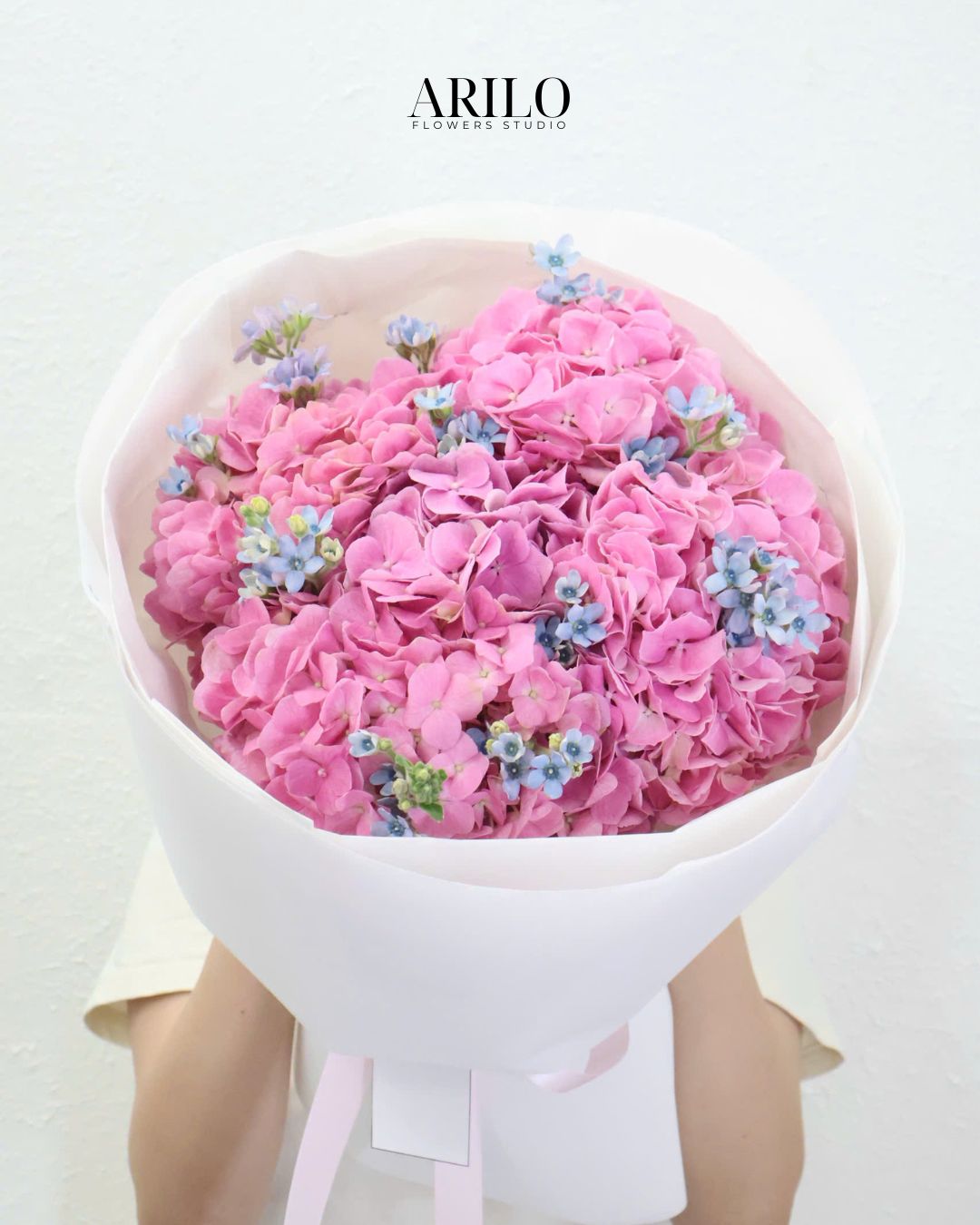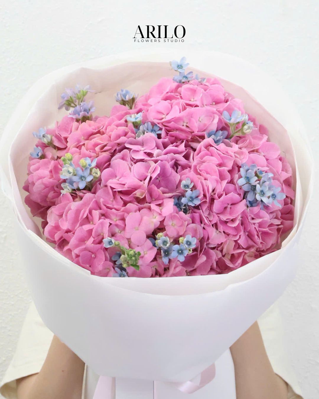 Hình ảnh bó hoa cẩm tú cầu hồng dịu dàng này đến từ Shop hoa tươi Sài Gòn – Arilo Flower Studio, được thiết kế theo phong cách tinh tế và hiện đại. Những bông cẩm tú cầu hồng bung nở mềm mại, xen kẽ với sắc xanh hoa lam tinh nhỏ nhắn, tạo nên tổng thể nhẹ nhàng nhưng vẫn đầy cuốn hút. Đây là lựa chọn hoàn hảo cho các dịp hoa sinh nhật, hoa chúc mừng hay hoa khai trương khi bạn muốn gửi gắm lời chúc tốt đẹp một cách tinh tế và thanh lịch.