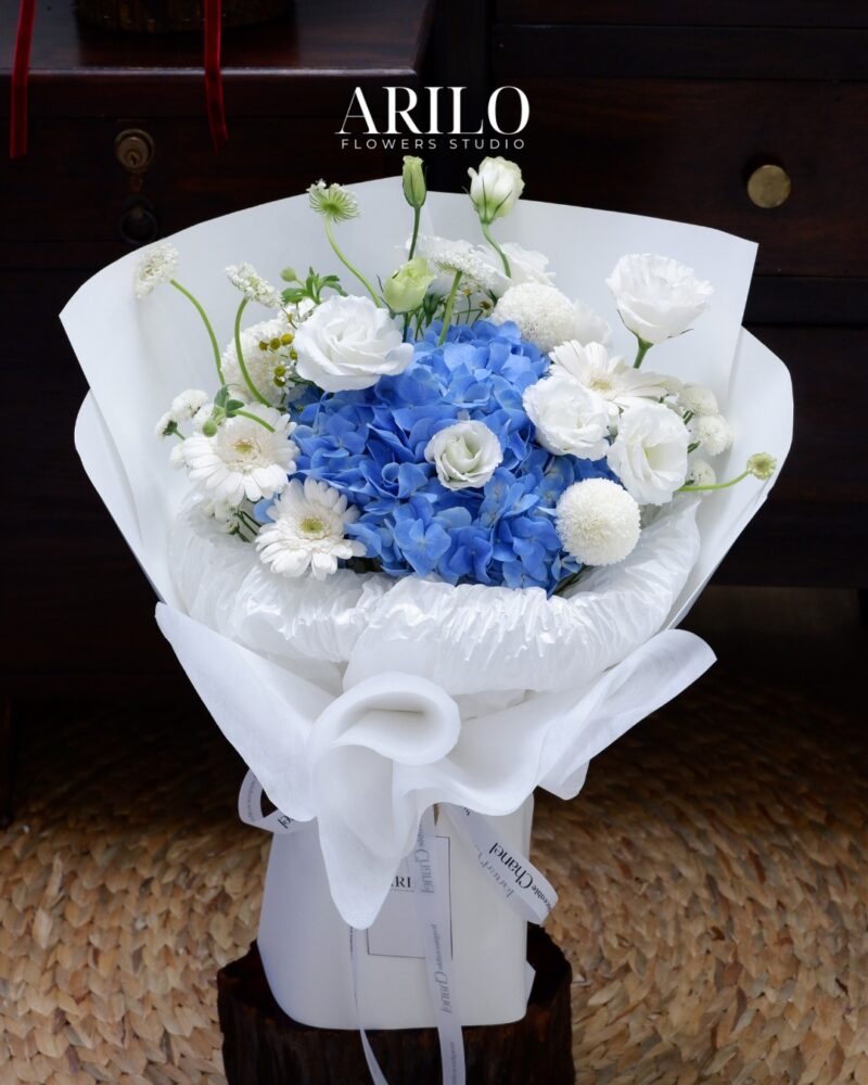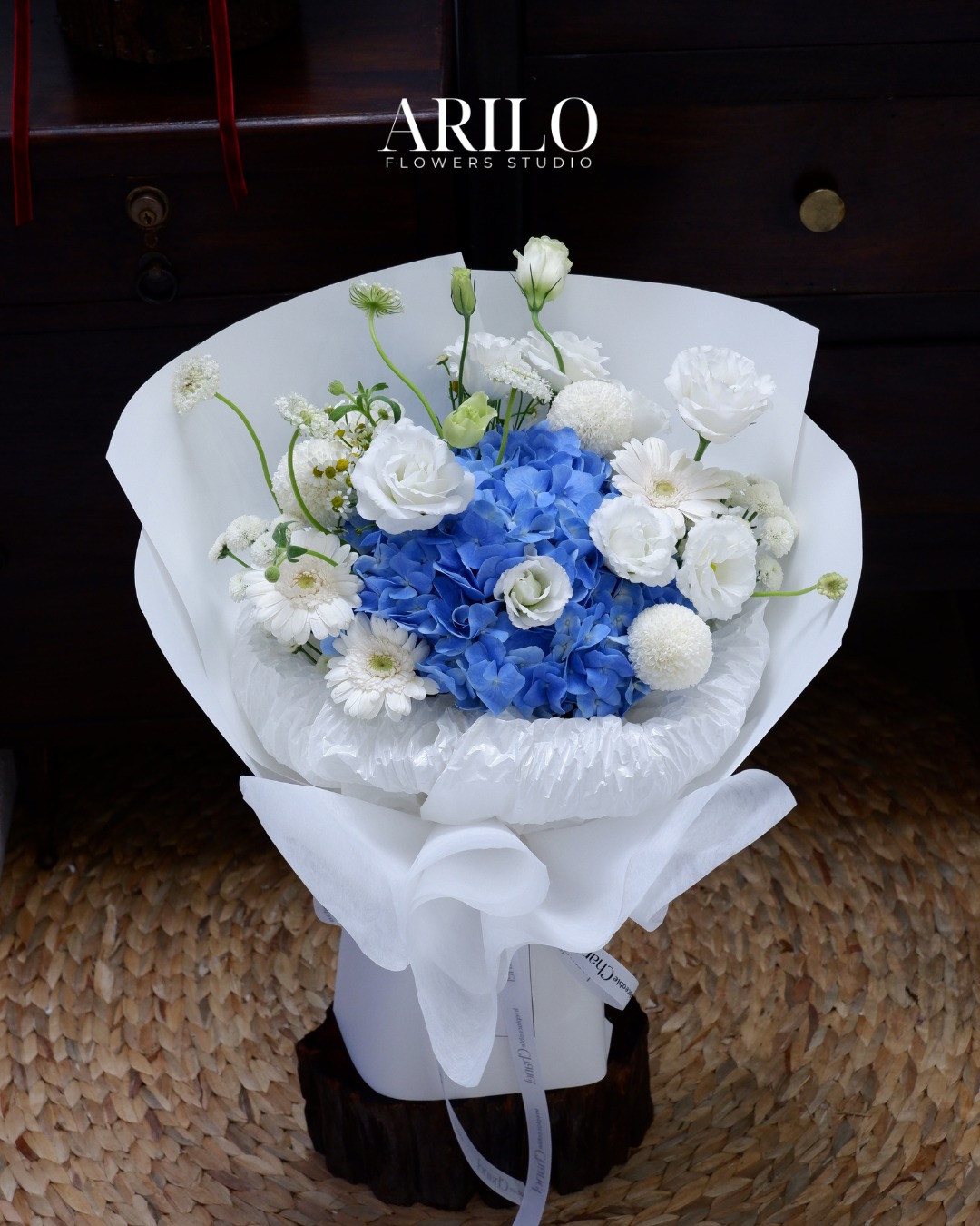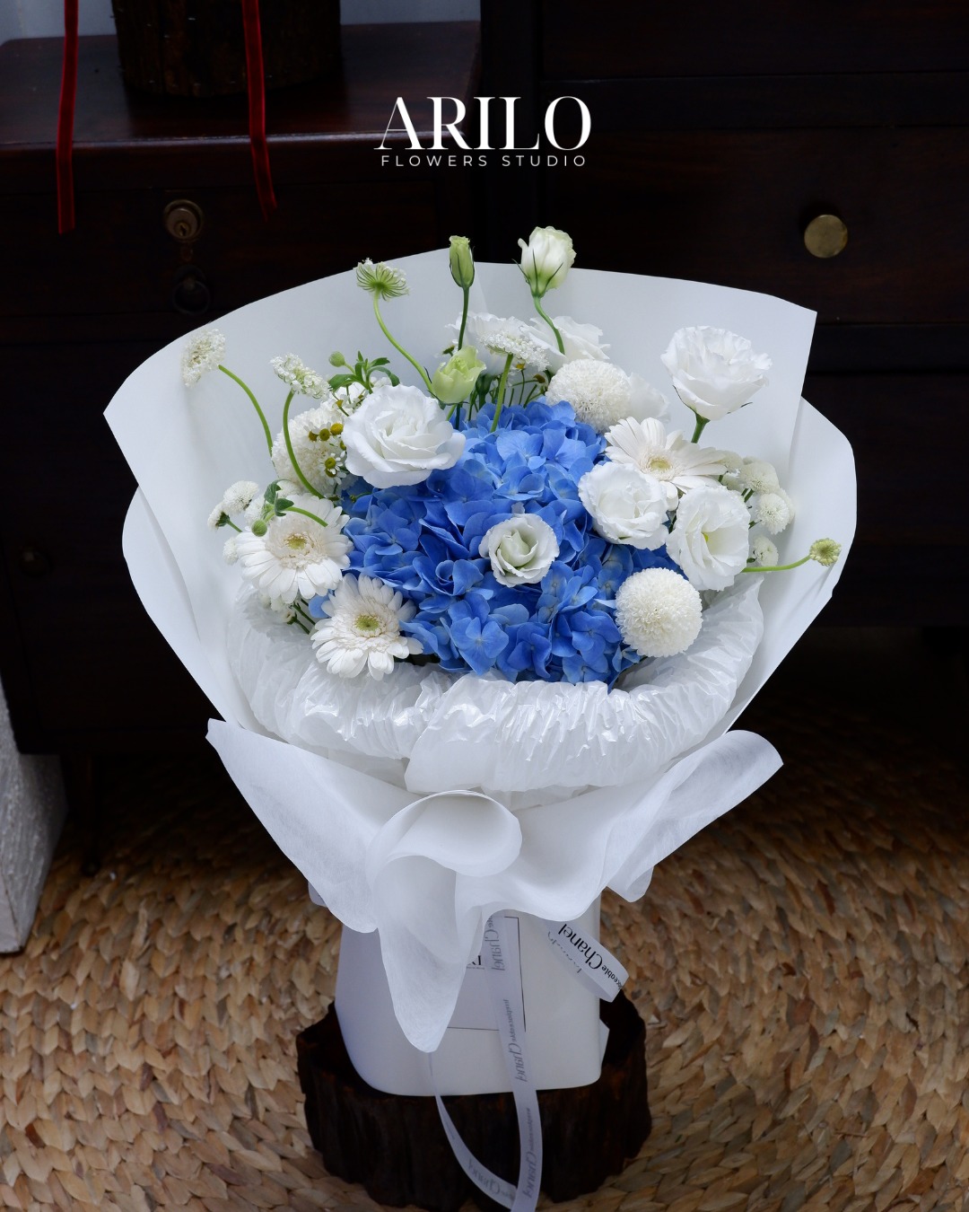 Bó hoa tặng người yêu mang bảng màu xanh – trắng thanh khiết, nhẹ như một lời yêu thì thầm nhưng đủ sâu để chạm vào cảm xúc. Trung tâm là hoa cẩm tú cầu xanh tròn đầy, kết hợp hài hòa cùng hoa hồng trắng, hoa đồng tiền trắng, hoa cẩm chướng, điểm xuyết hoa bi tròn (ping pong) và hoa thuý châu, tạo nên tổng thể sang trọng, tinh giản mà không hề đơn điệu.