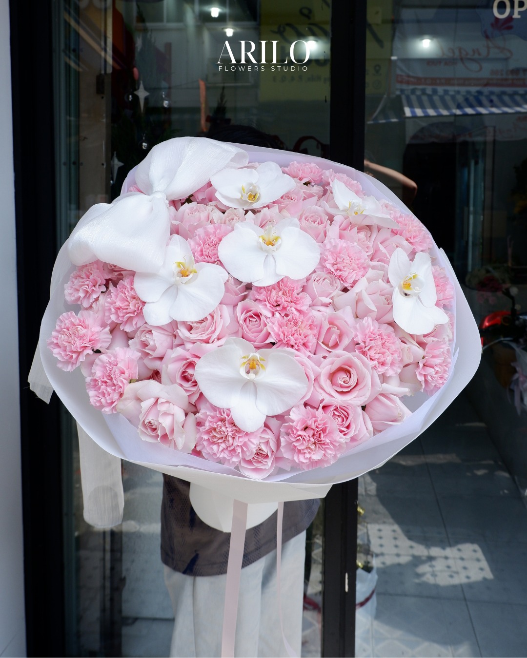 Bức ảnh ghi lại một bó hoa mang vẻ đẹp dịu dàng và tinh tế, nổi bật với gam hồng phấn chủ đạo, tạo cảm giác lãng mạn ngay từ ánh nhìn đầu tiên. Bó hoa được kết hợp hài hòa từ hoa hồng phấn, hoa cẩm chướng hồng, và điểm nhấn sang trọng là hoa lan hồ điệp trắng. Những cánh hoa mềm mại xếp lớp tròn đầy, đan xen khéo léo giúp tổng thể bó hoa trở nên cân đối, nữ tính nhưng vẫn rất trang nhã. Phần nơ voan trắng nhẹ buông tạo điểm nhấn thanh thoát, tôn lên vẻ cao cấp và tinh khôi của thiết kế.