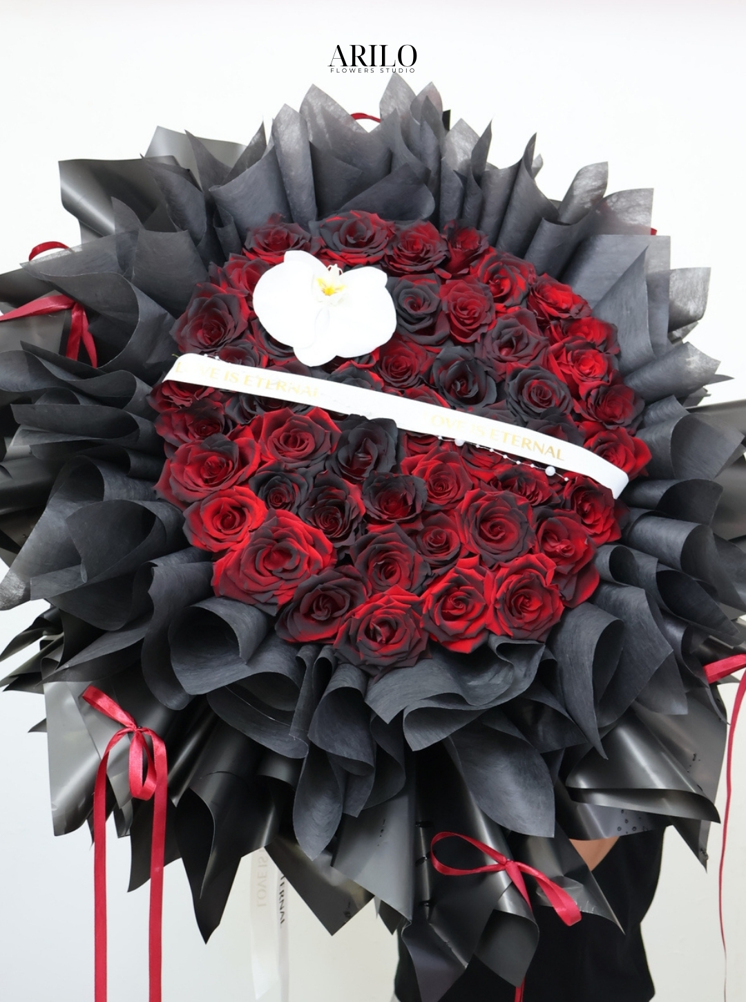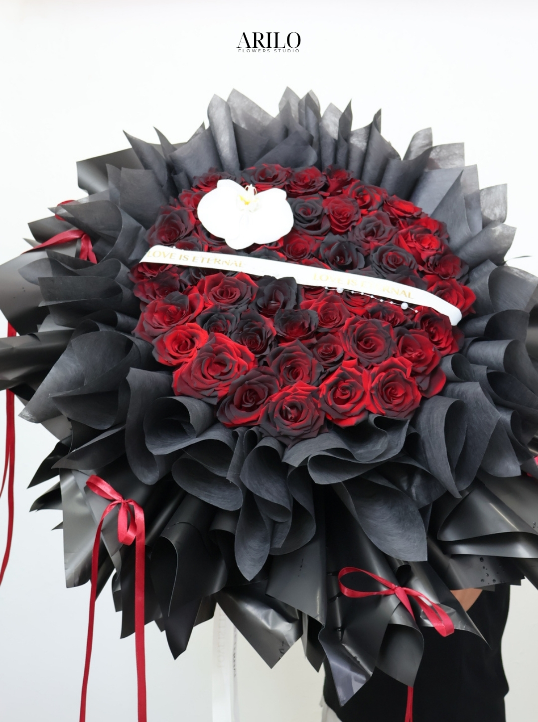 Những đóa hồng đỏ được sắp xếp thành hình trái tim tròn đầy, không hở khoảng trống, tượng trưng cho tình cảm trọn vẹn và sự lựa chọn không do dự. Bao quanh phần trung tâm là nhiều tầng giấy đen được tạo form xếp lớp, mang lại cảm giác như một khung nền sang trọng nâng đỡ trái tim hoa phía trong.