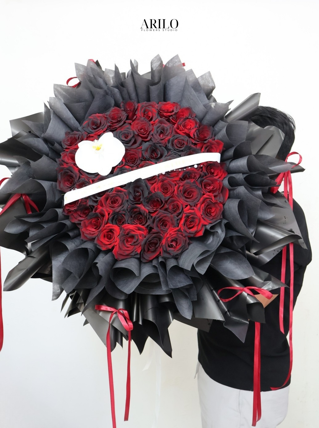Thiết kế này đặc biệt phù hợp làm bó hoa cầu hôn trong những khoảnh khắc trọng đại, khi bạn muốn tạo ấn tượng mạnh và khó quên. Tone đỏ – đen tạo hiệu ứng thị giác nổi bật trong không gian ánh đèn buổi tối, rất thích hợp cho những buổi cầu hôn lãng mạn tại nhà hàng, rooftop hoặc tiệc riêng tư.