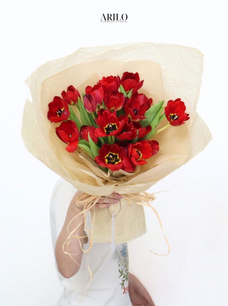 Phong cách gói của bó hoa mang hơi hướng tự nhiên và tinh tế. Lớp giấy gói màu beige giúp làm nổi bật sắc đỏ rực rỡ của tulip, tạo nên sự tương phản nhẹ nhàng nhưng rất sang trọng.