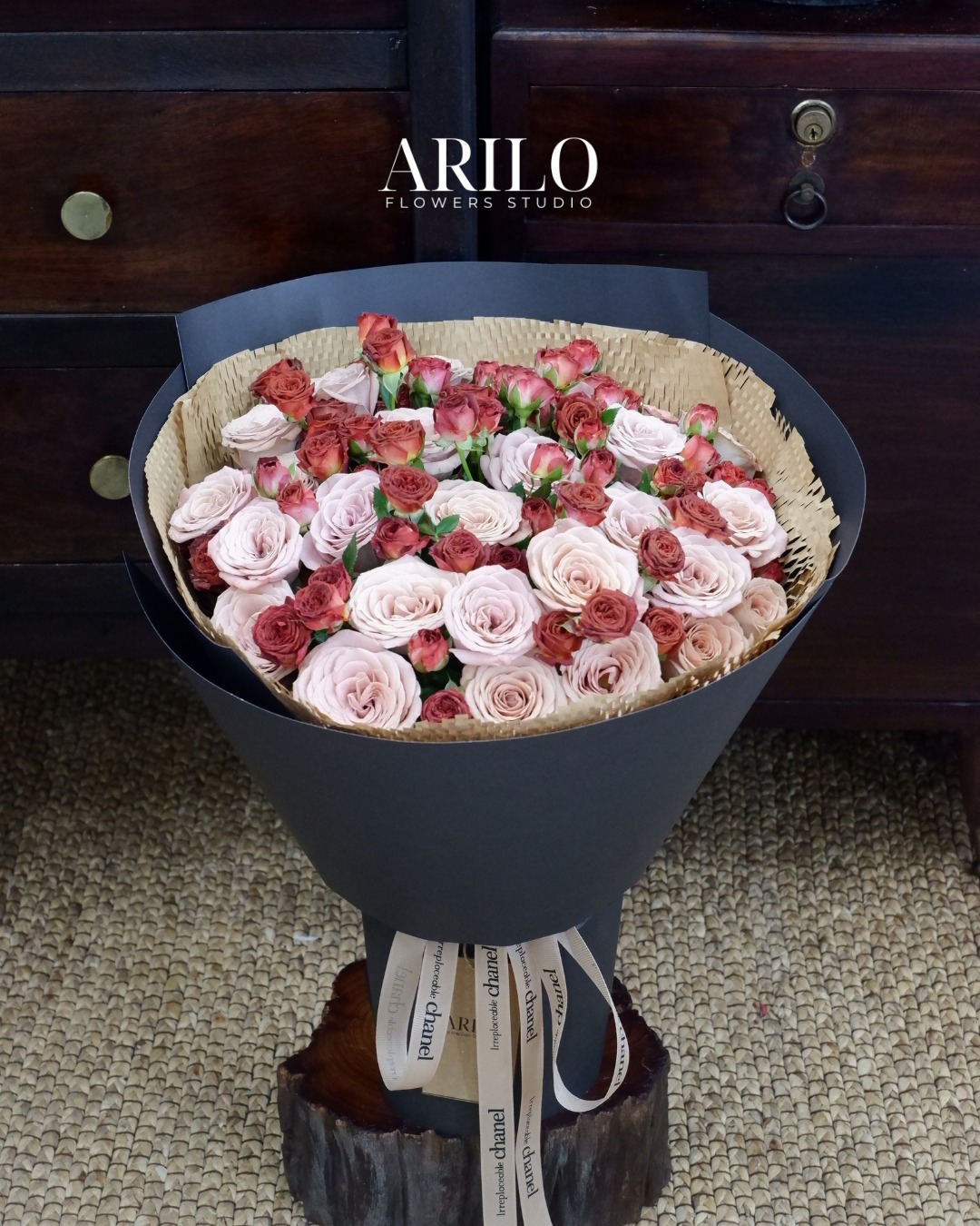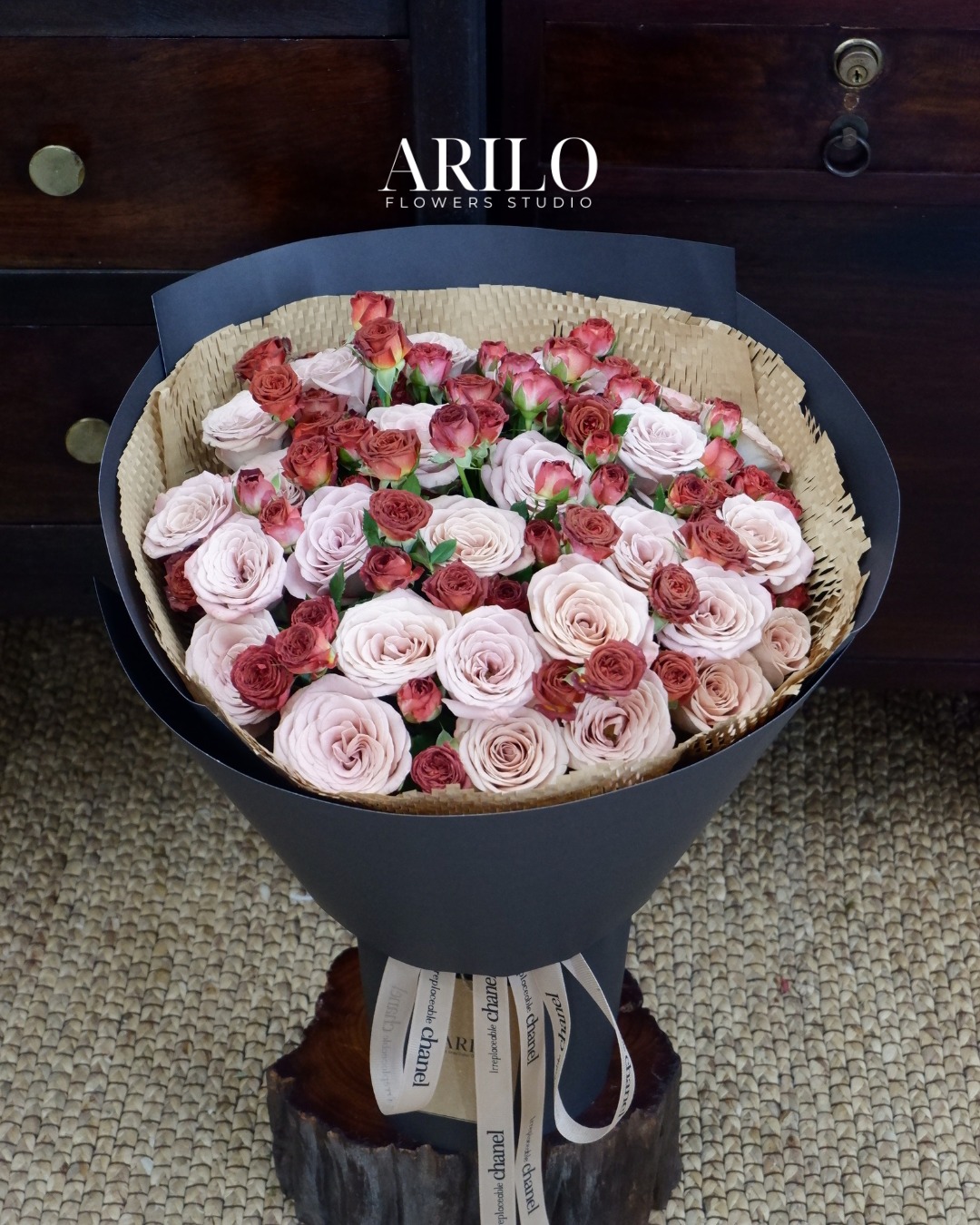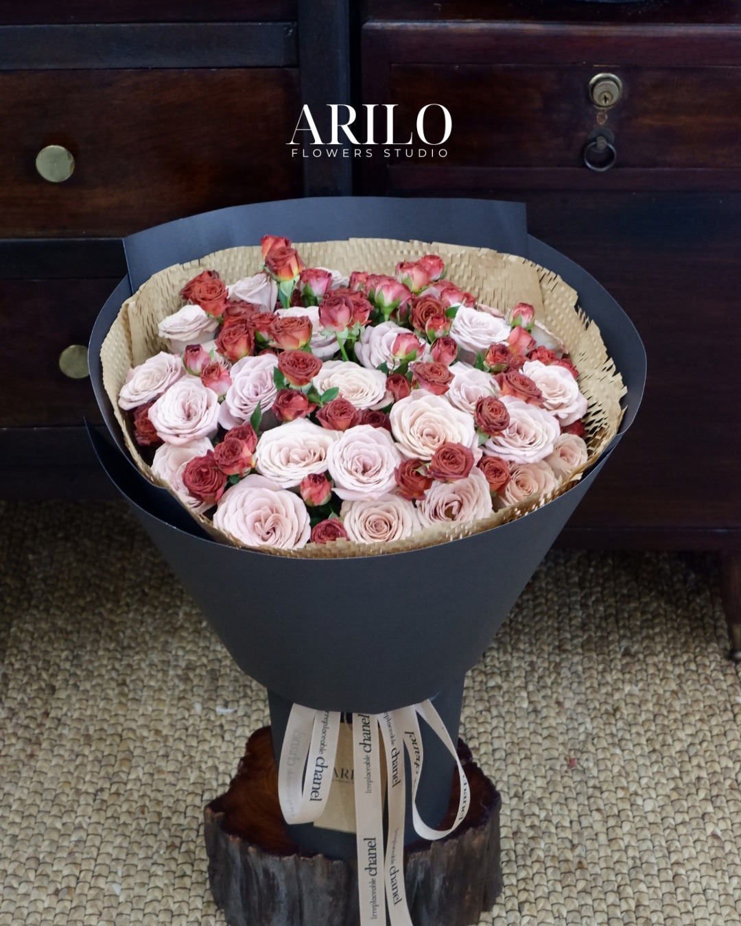 Bức ảnh là một thiết kế mang tinh thần thanh lịch và chiều sâu cảm xúc, nổi bật với sự kết hợp hài hòa giữa hoa hồng capuchino và hoa hồng chùm cà phê. Những bông hồng nở đều, cánh hoa xoắn lớp mềm mại, được sắp xếp dày dặn theo form tròn cổ điển. Phần giấy gói tone đen nhám kết hợp lớp giấy kraft bên trong tạo nên sự tương phản tinh tế, giúp sắc hoa trở nên nổi bật và sang trọng hơn. Điểm xuyết giữa các lớp hoa là lá xanh trang trí, mang lại cảm giác tự nhiên và cân bằng thị giác.