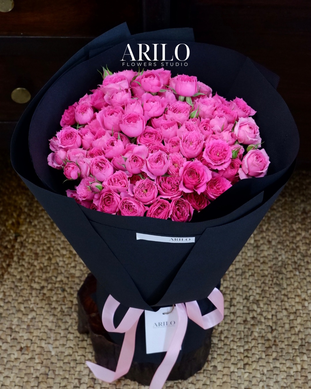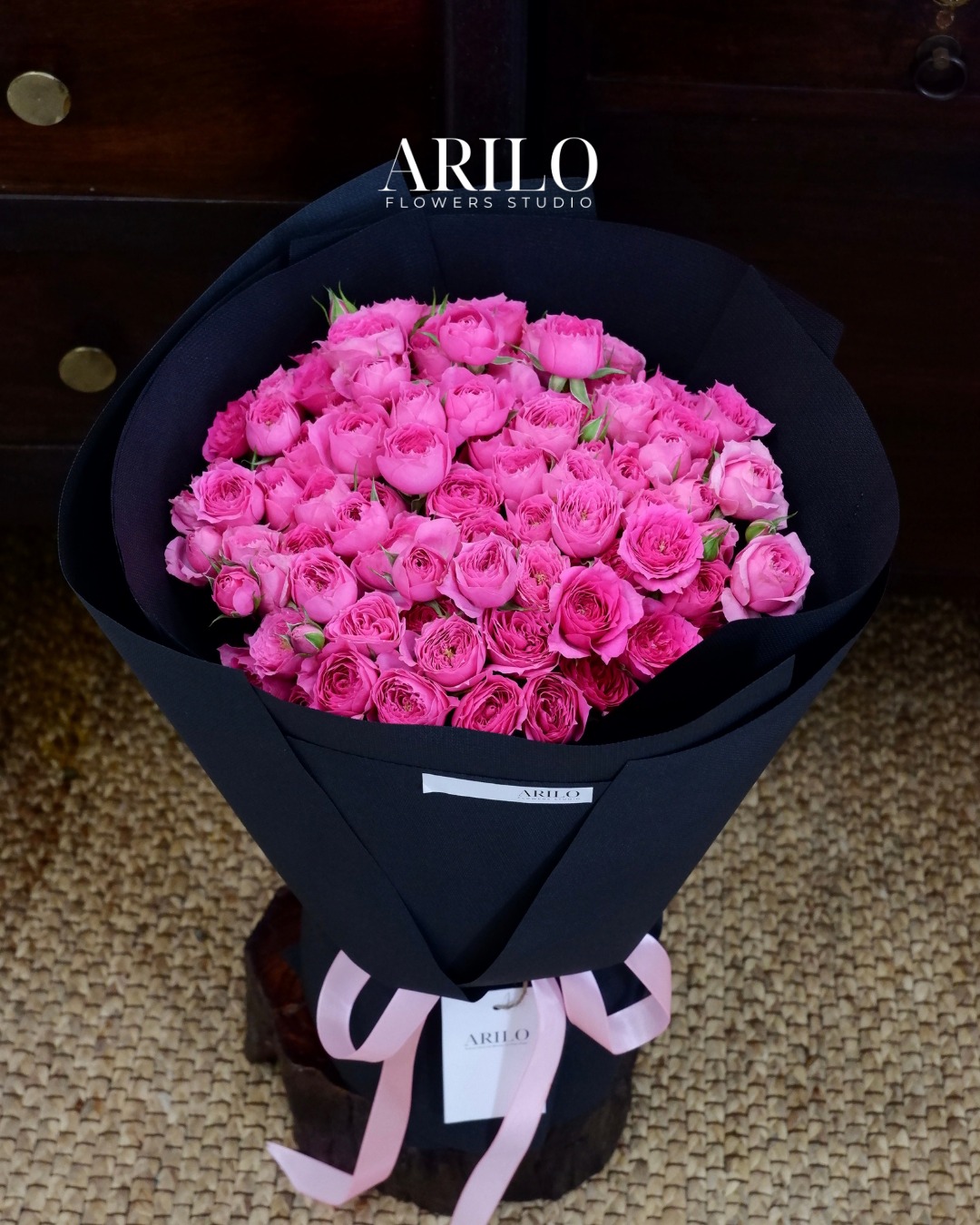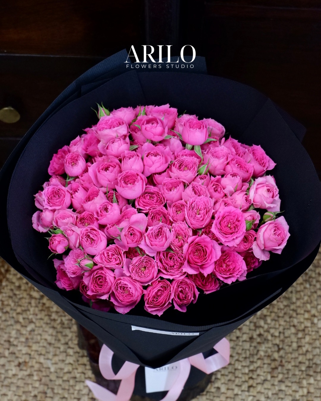 Bức ảnh ghi lại vẻ đẹp đầy cuốn hút của bó hoa hồng chùm Sofia với tone hồng rực rỡ, được gói tinh tế trong lớp giấy đen sang trọng, tạo nên sự tương phản mạnh mẽ nhưng hài hòa. Tổng thể bó hoa mang cảm giác dày dặn, tròn đầy, như một lời yêu được gom góp từ rất nhiều rung động nhỏ bé nhưng bền bỉ.
