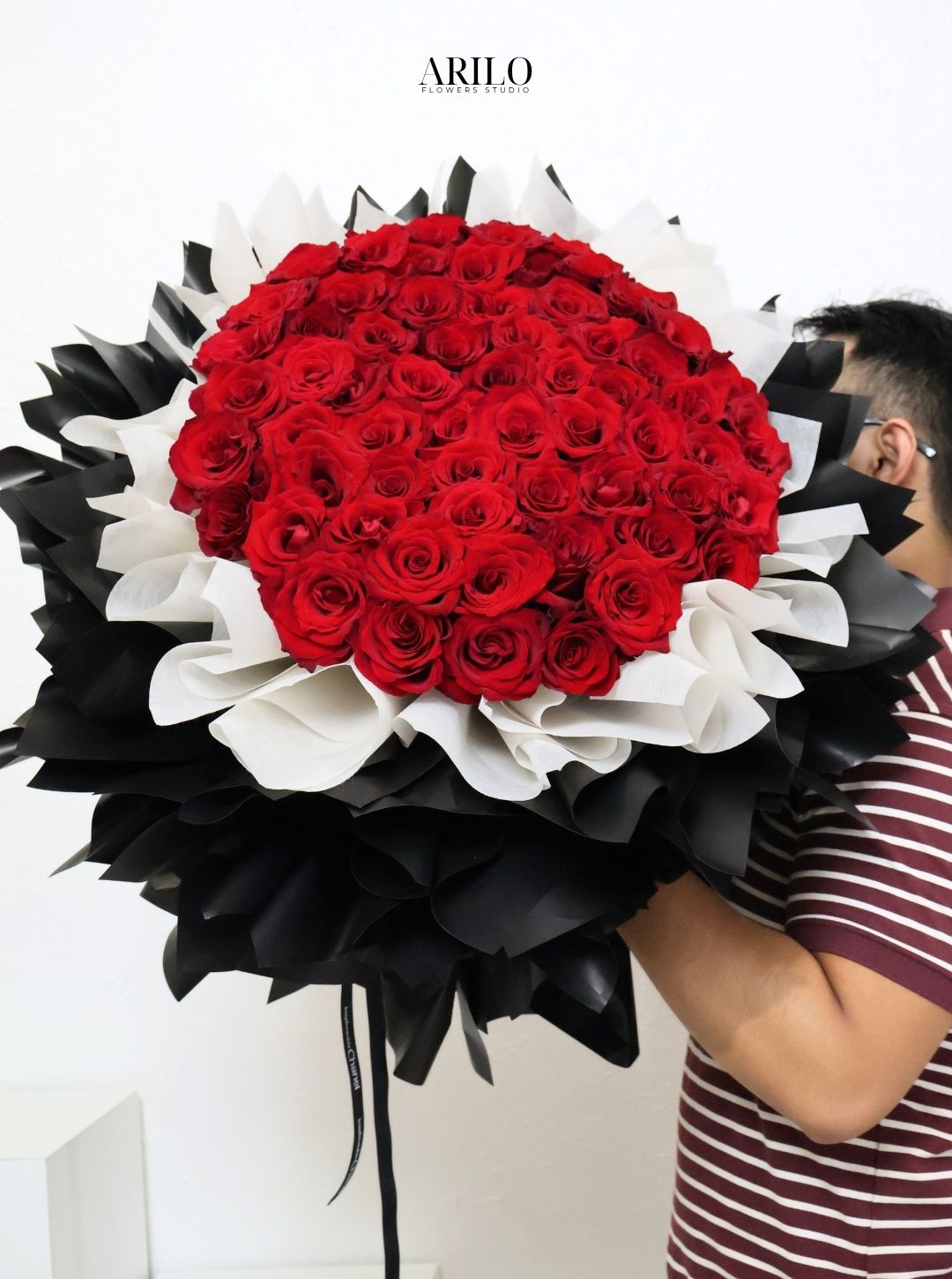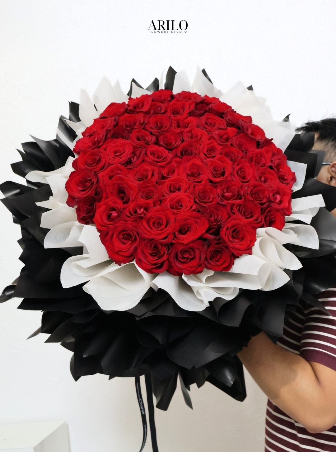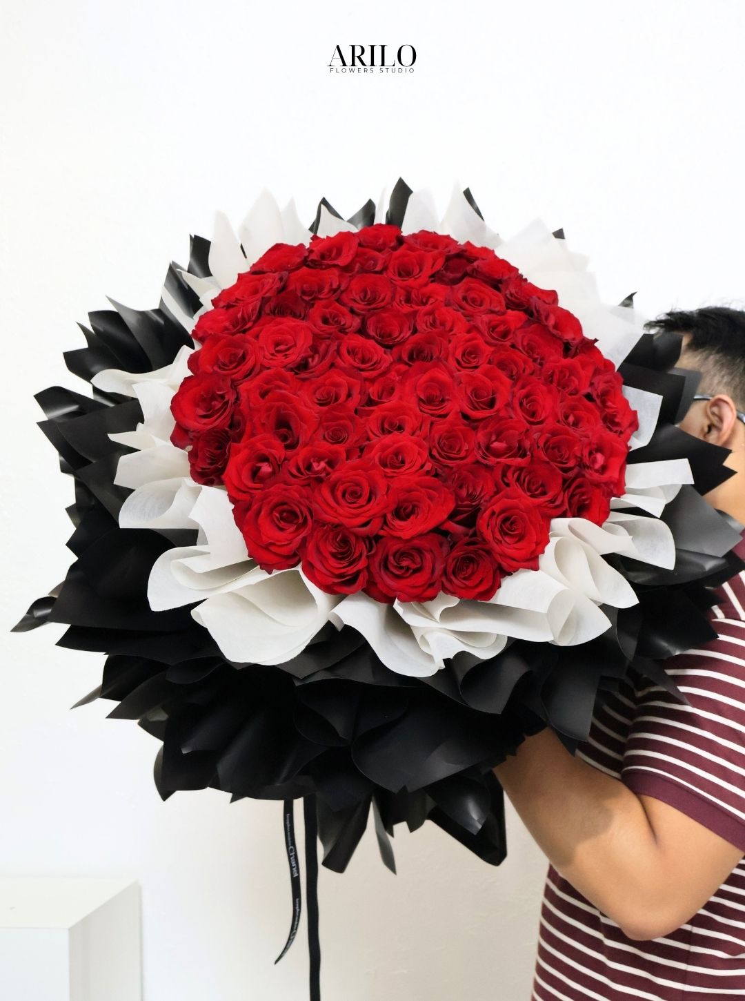 Thiết kế này không chạy theo sự phức tạp mà tập trung vào sự hoàn hảo trong bố cục. Từng bông hoa được đặt đúng vị trí, tạo nên sự cân đối tuyệt đối. Phần giấy gói hai lớp đen và trắng giúp làm nổi bật phần trung tâm, giống như một khung nền tinh tế để tôn vinh vẻ đẹp của hoa.