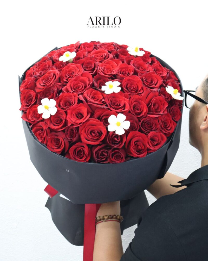 Bó hoa hồng đỏ điểm hoa trắng là thiết kế mang vẻ đẹp vừa lãng mạn, vừa tinh tế tại Arilo Flower Studio – shop hoa tươi quận 3. Những bông hồng đỏ rực rỡ được xếp khít thành khối tròn đầy đặn, tượng trưng cho tình yêu nồng nhiệt và cảm xúc chân thành. Điểm xuyết trên nền đỏ là những cánh hoa trắng nhỏ xinh, giúp tổng thể trở nên mềm mại và tươi sáng hơn. Đây là lựa chọn hoàn hảo cho những ai đang tìm một bó hoa sinh nhật đẹp, hoặc mẫu hoa tỏ tìnhhoa cầu hôn đầy ý nghĩa.
