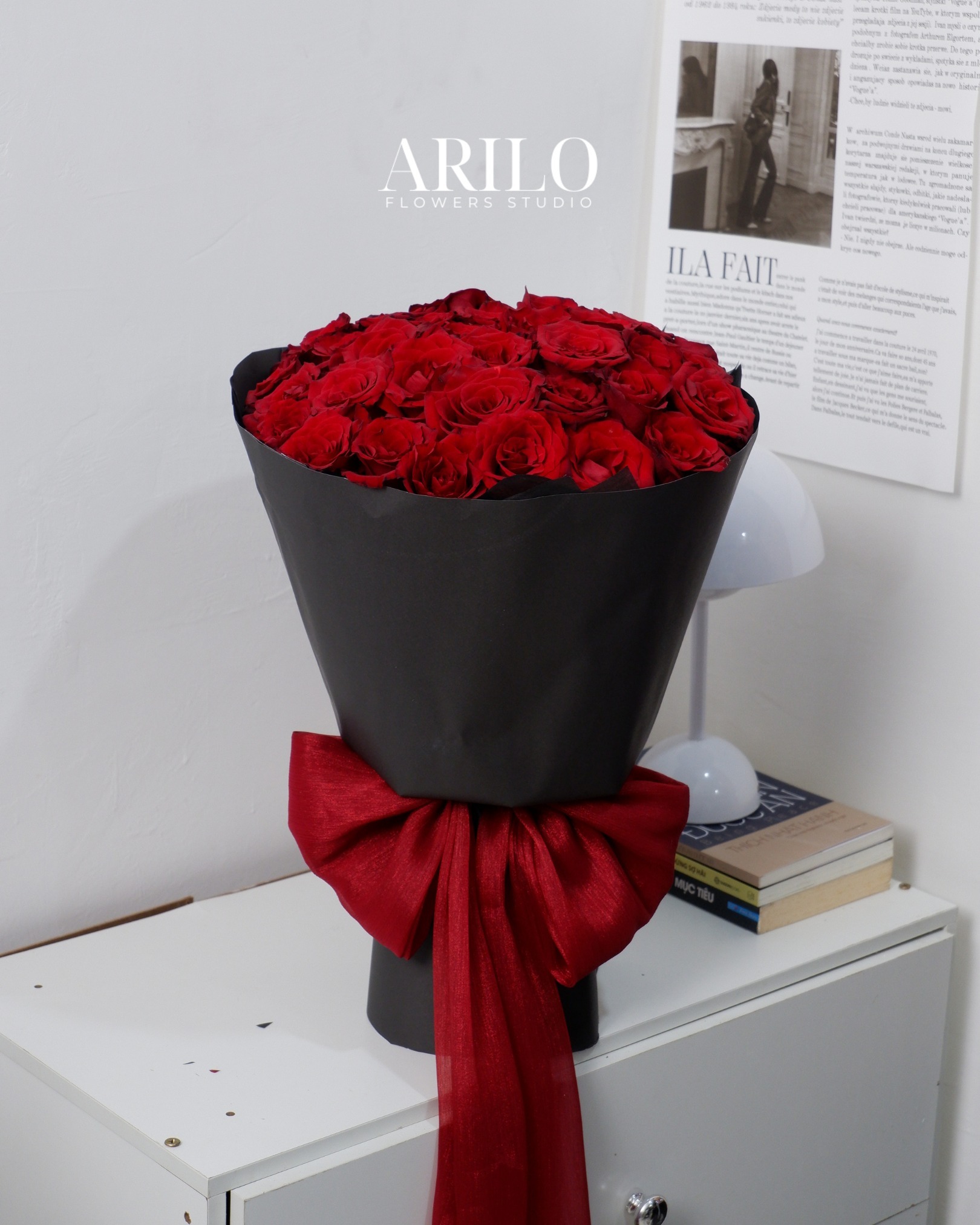 Về thiết kế, Arilo chọn cách bó tròn cổ điển, các bông hoa được sắp xếp đều tay, tạo mặt hoa phẳng và gọn. Lớp giấy đen nhám bao bên ngoài giúp tôn lên sắc đỏ của hoa, đồng thời mang lại cảm giác hiện đại, sang trọng. Chiếc nơ đỏ lớn được đặt khéo léo ở phần thân bó, không chỉ là điểm nhấn thị giác mà còn tạo sự liên kết hài hòa giữa màu hoa và tổng thể thiết kế.