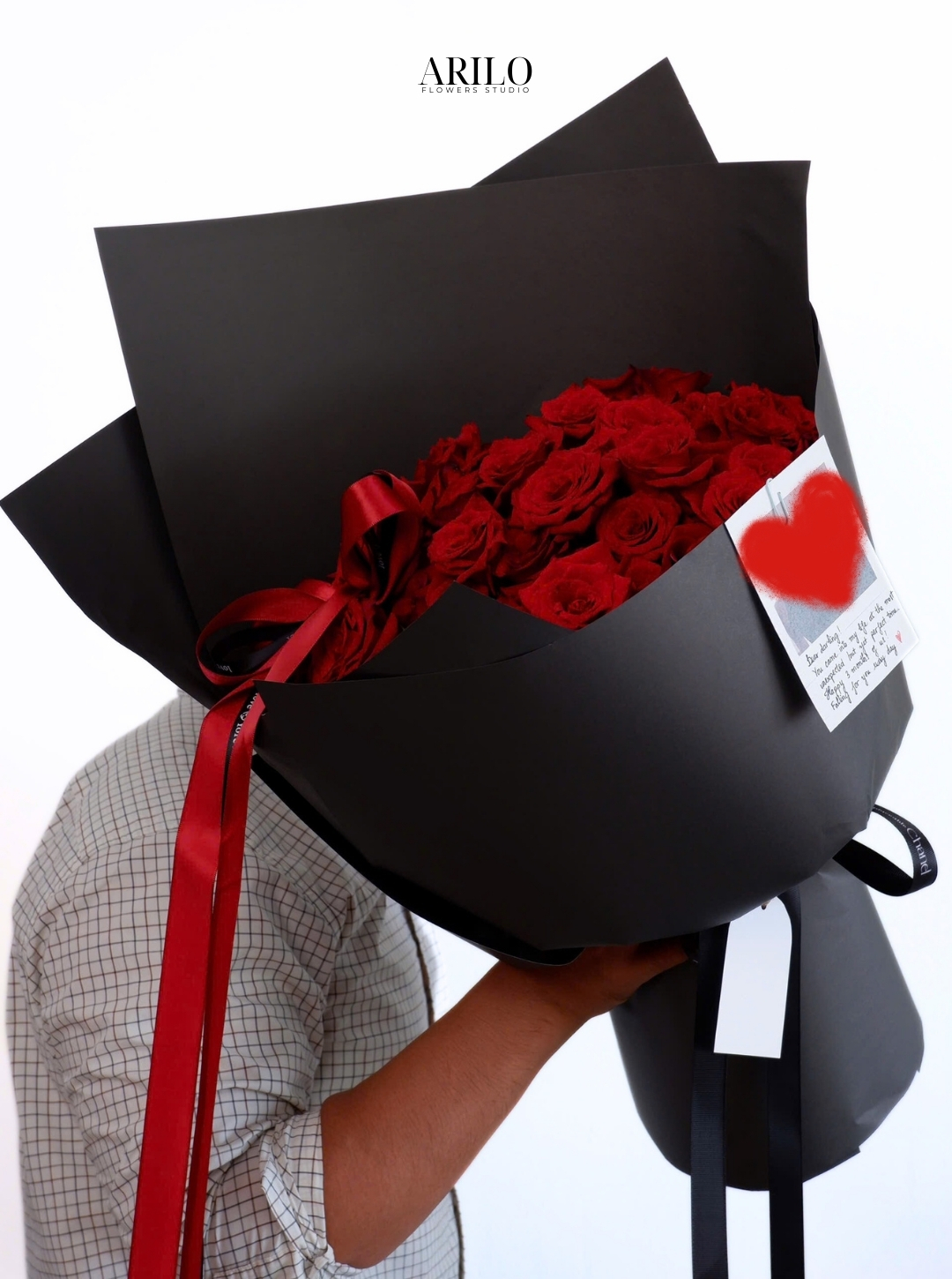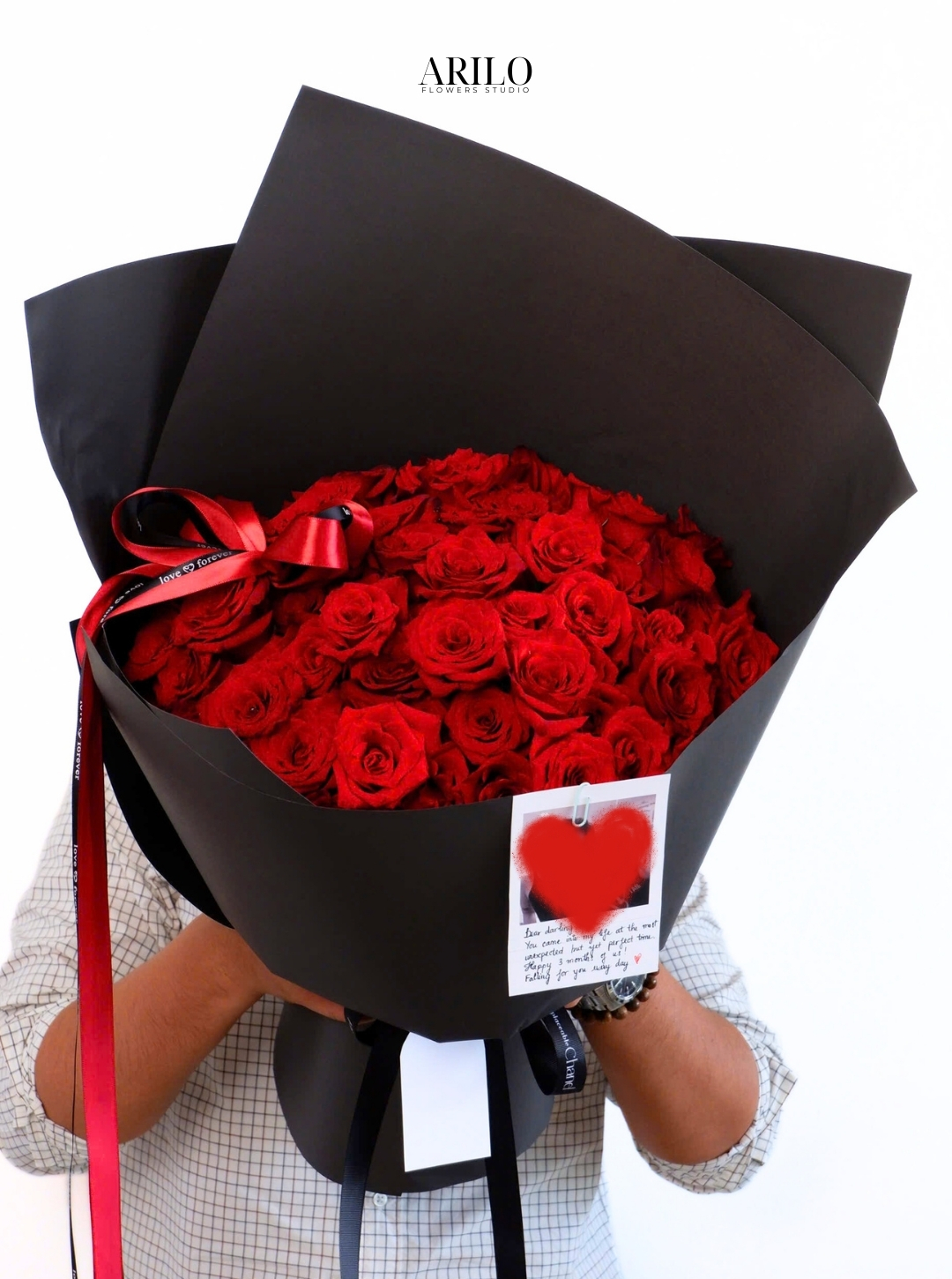 Giấy gói đen bản lớn bao trọn phần hoa phía trên, tạo nên sự tương phản ấn tượng, giúp sắc đỏ trở nên sâu và nổi bật hơn. Thiết kế này mang phong cách hiện đại, tinh giản nhưng đầy khí chất, phù hợp với những ai muốn thể hiện tình cảm theo cách tự tin và mạnh mẽ. Không cần quá nhiều hoa phụ hay chi tiết rườm rà, chính sự thuần nhất của hồng đỏ Ecuador đã đủ để tạo nên một bó hoa mang giá trị thẩm mỹ cao và giàu cảm xúc.