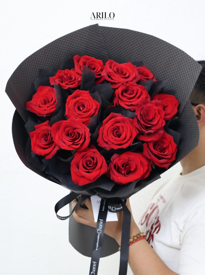 Thiết kế này đặc biệt phù hợp cho bó hoa tỏ tình khi bạn muốn tạo ấn tượng mạnh mẽ ngay từ khoảnh khắc đầu tiên. Sắc đỏ nổi bật trên nền đen giúp bó hoa trở thành tâm điểm, khiến lời yêu trở nên rõ ràng và khó quên.