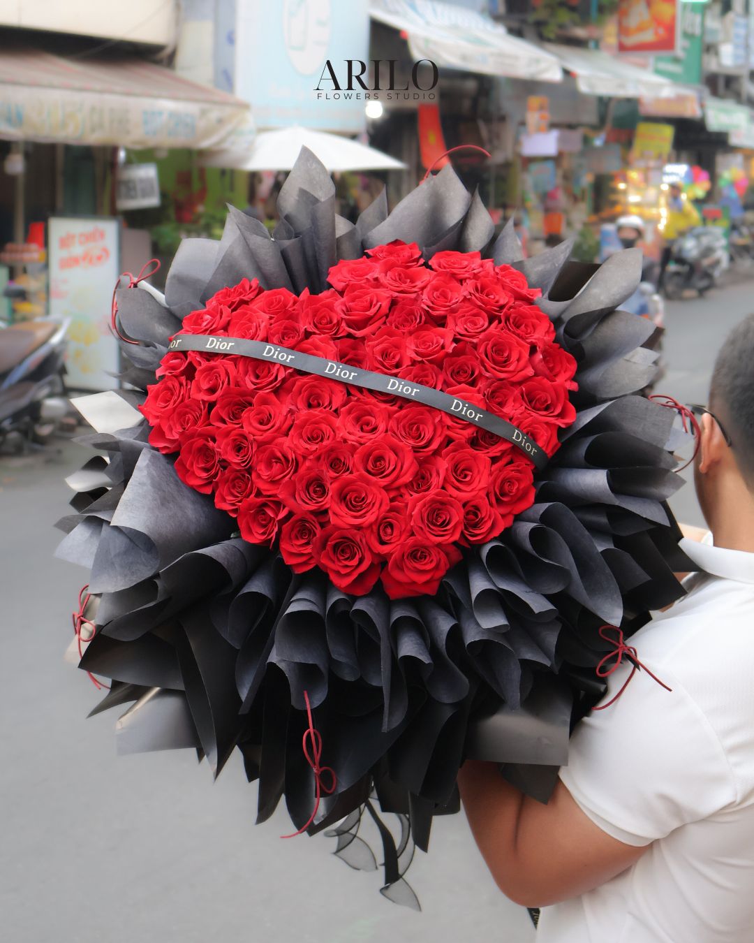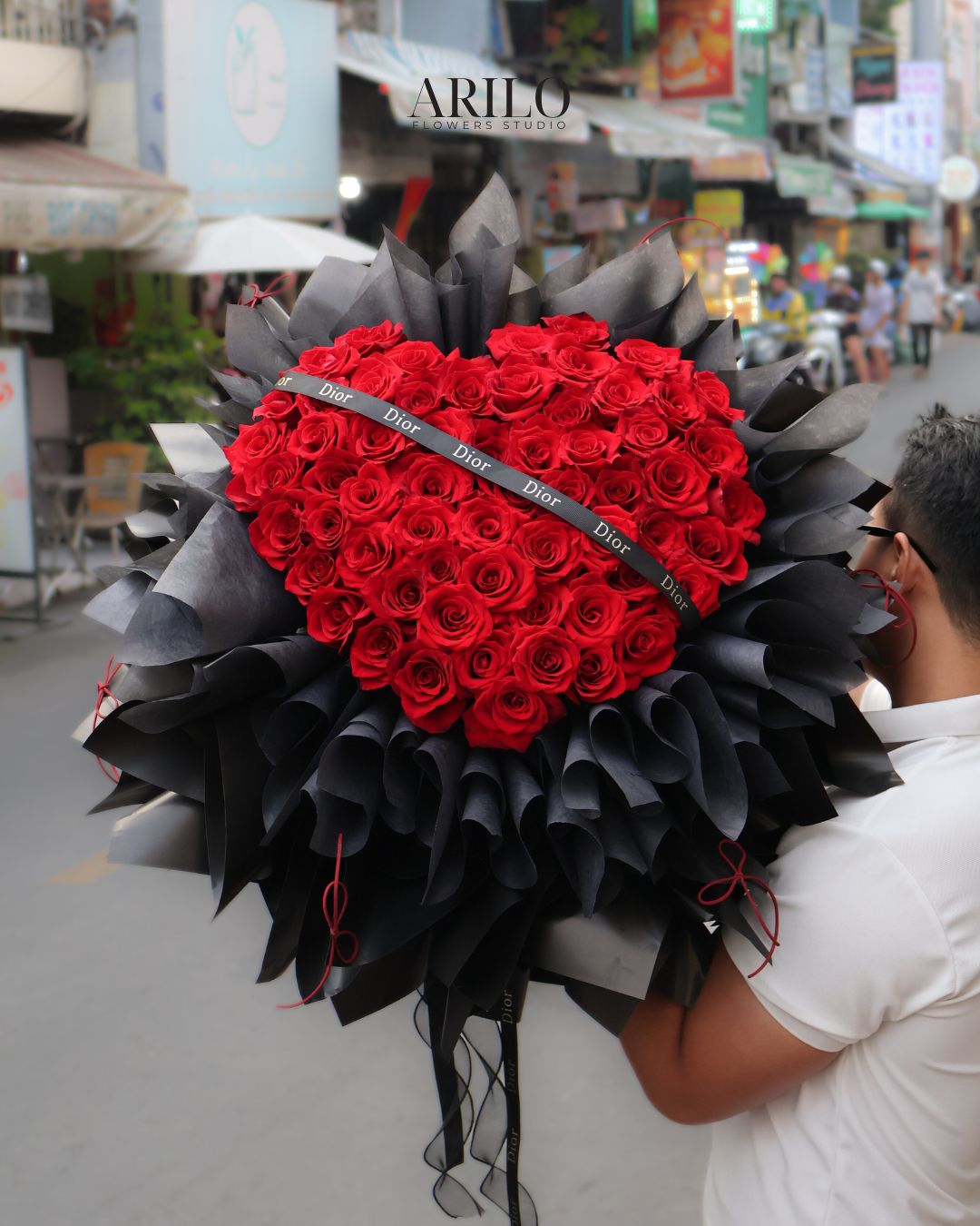 Bó hoa hồng đỏ hình trái tim là thiết kế nổi bật và đầy cảm xúc tại Arilo Flower Studio – shop hoa tươi quận 3. Hàng chục bông hồng đỏ tươi được xếp khít thành hình trái tim tượng trưng cho tình yêu nồng nàn, chân thành và bền bỉ. Lớp giấy gói đen cao cấp được xếp cầu kỳ bao quanh, tạo nên tổng thể vừa sang trọng, vừa cá tính và vô cùng ấn tượng. Đây là lựa chọn lý tưởng cho những ai đang tìm một bó hoa sinh nhật đẹp, hoặc muốn tạo dấu ấn đáng nhớ với hoa tỏ tình hay hoa cầu hôn.