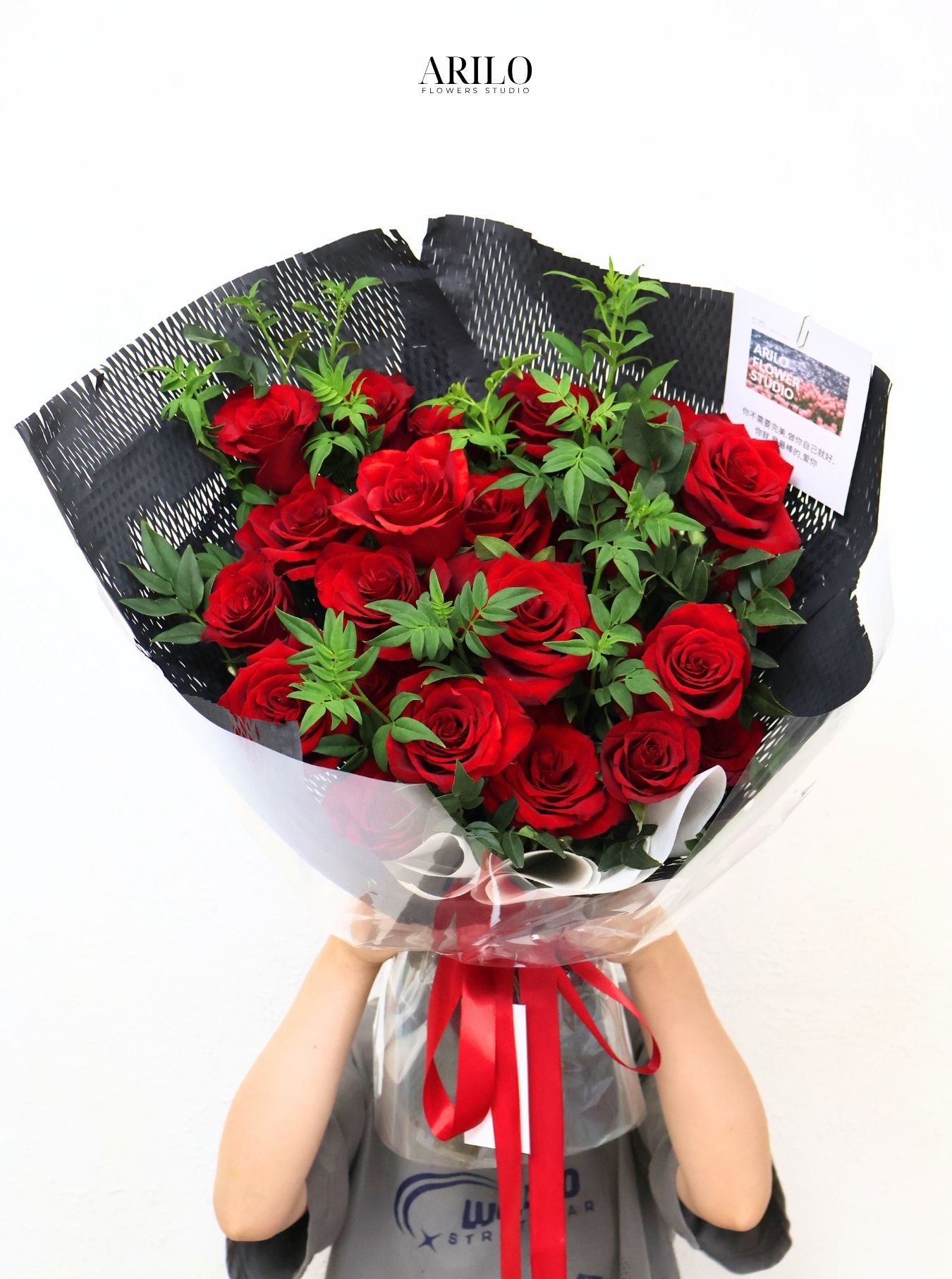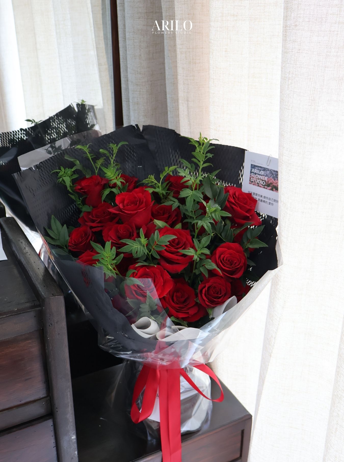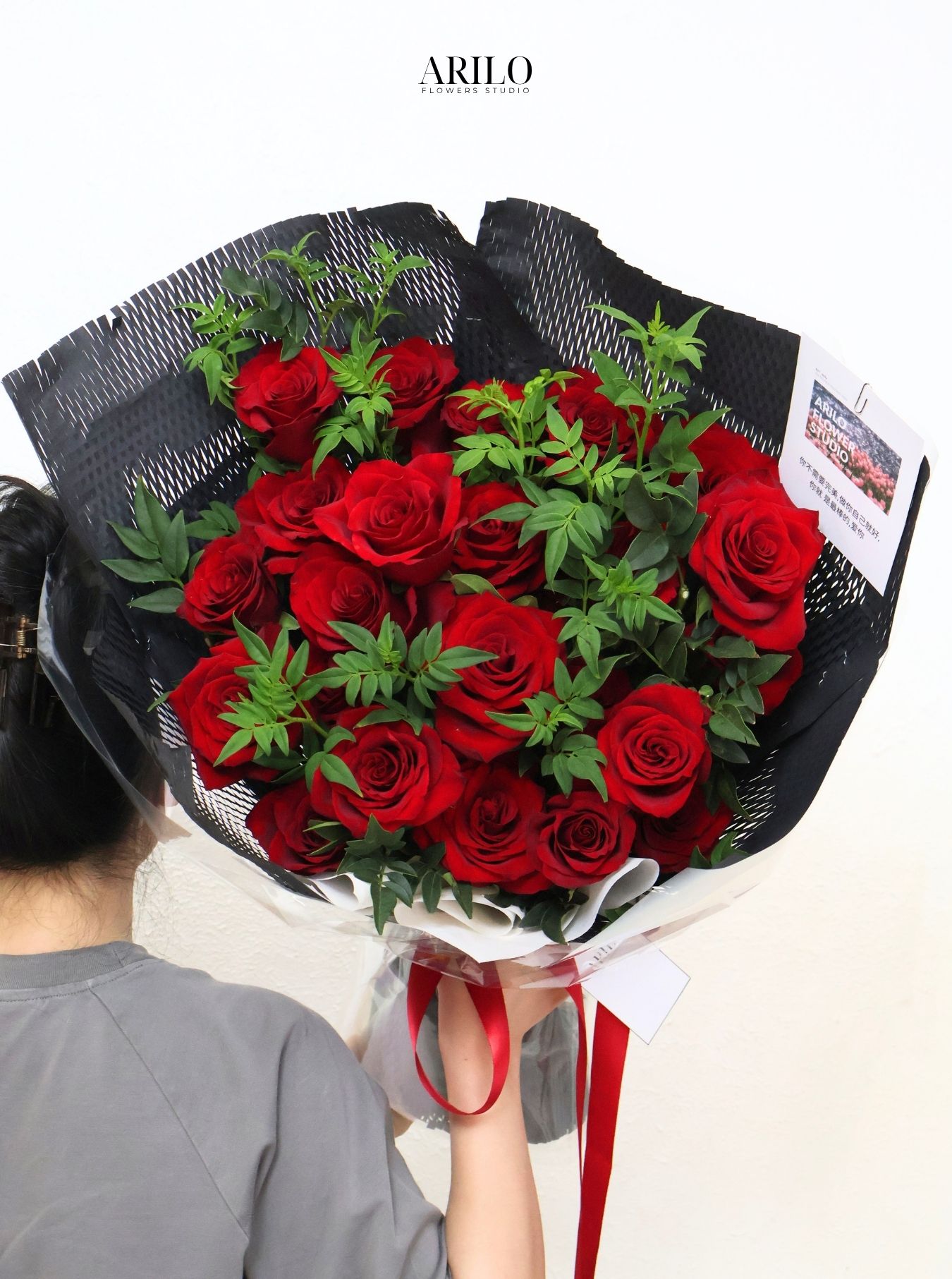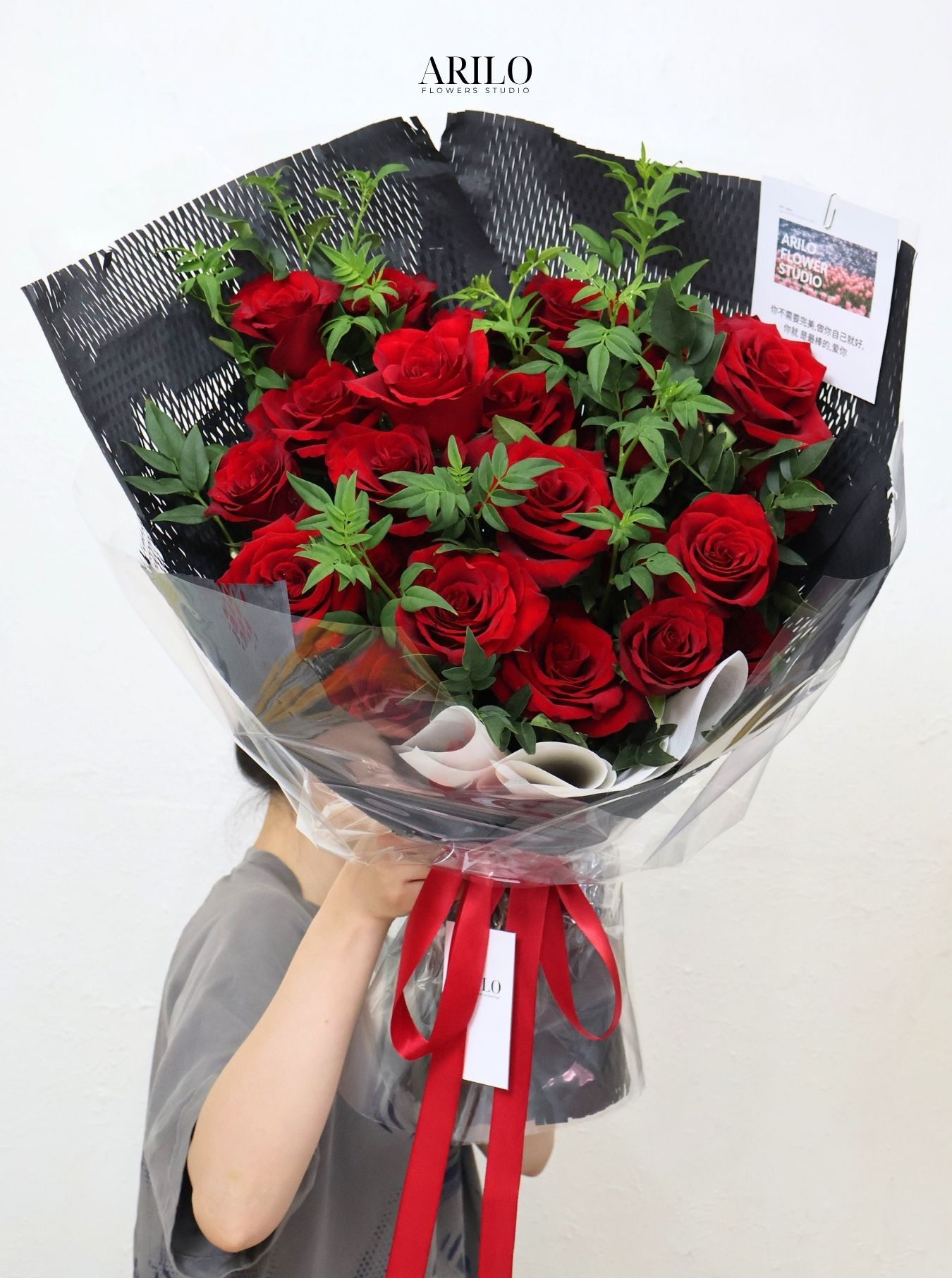 Điểm nổi bật của bó hoa nằm ở sự tương phản giữa các yếu tố. Màu đỏ của hoa kết hợp với giấy gói đen tạo nên sự nổi bật mạnh mẽ, giúp bó hoa trở thành tâm điểm ngay từ cái nhìn đầu tiên. Lớp giấy trong suốt bên ngoài không chỉ bảo vệ hoa mà còn giúp tăng thêm độ bóng và chiều sâu cho tổng thể. Phần nơ đỏ được thắt khéo léo, vừa đủ để tạo điểm nhấn mà không làm rối bố cục. Các cành lá xanh được xen kẽ một cách hợp lý, giúp làm mềm đi sự mạnh mẽ của màu sắc và mang lại cảm giác cân bằng. Tất cả những chi tiết này kết hợp lại tạo nên một thiết kế hài hòa và tinh tế.