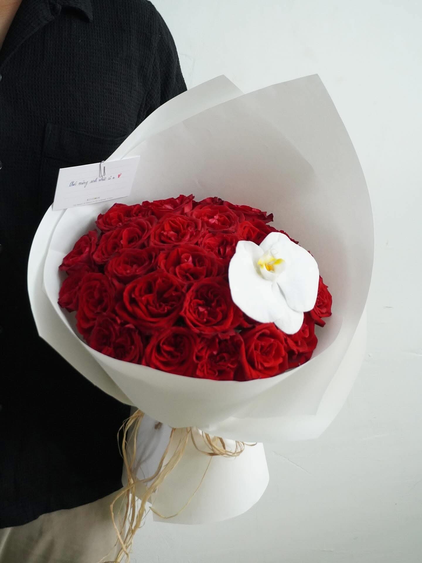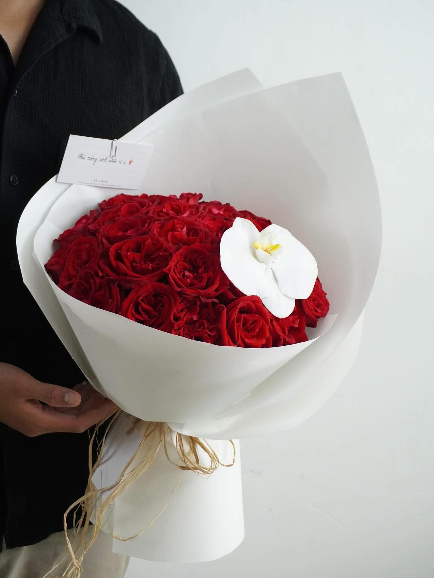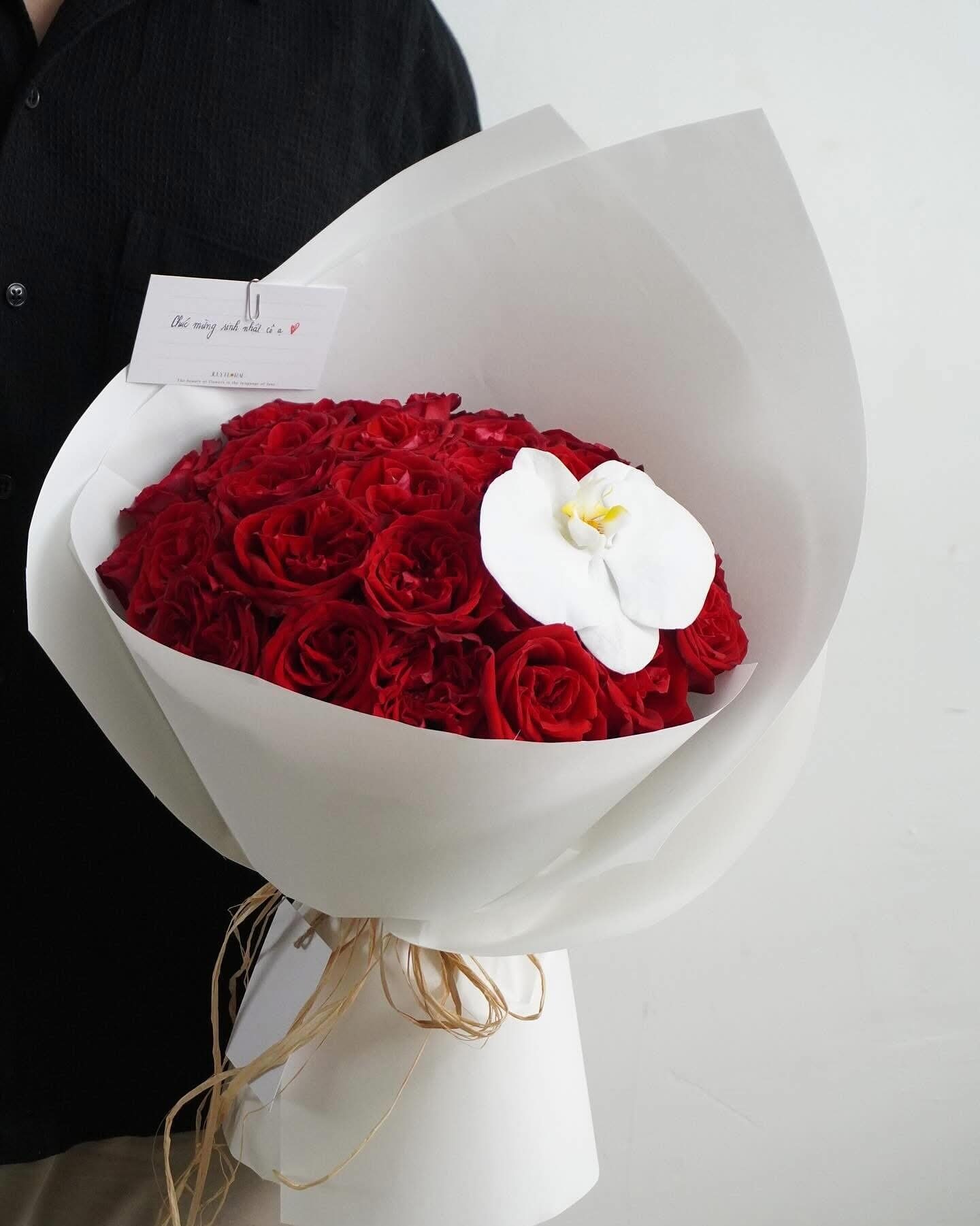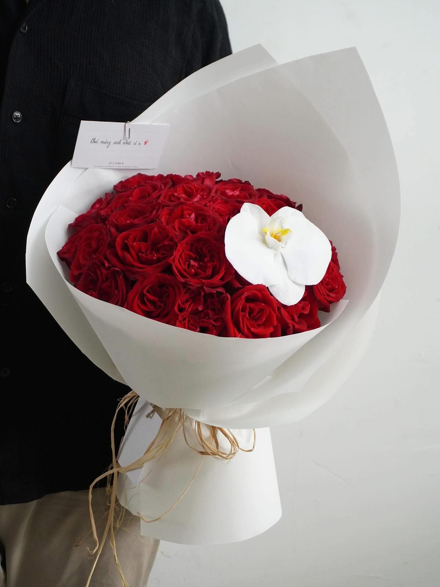 Hình ảnh bó hoa hồng đỏ đầy tinh tế này đến từ Shop hoa tươi Sài Gòn – Arilo Flower Studio, được thiết kế theo phong cách sang trọng và hiện đại. Những bông hồng đỏ tươi được xếp tròn chỉn chu, điểm nhấn là nhánh lan hồ điệp trắng thanh khiết, tạo nên tổng thể vừa mạnh mẽ, vừa tinh tế. Bó hoa rất phù hợp cho các dịp hoa sinh nhật, hoa chúc mừng hay hoa khai trương, giúp bạn gửi gắm lời chúc trân trọng và đẳng cấp đến người nhận.