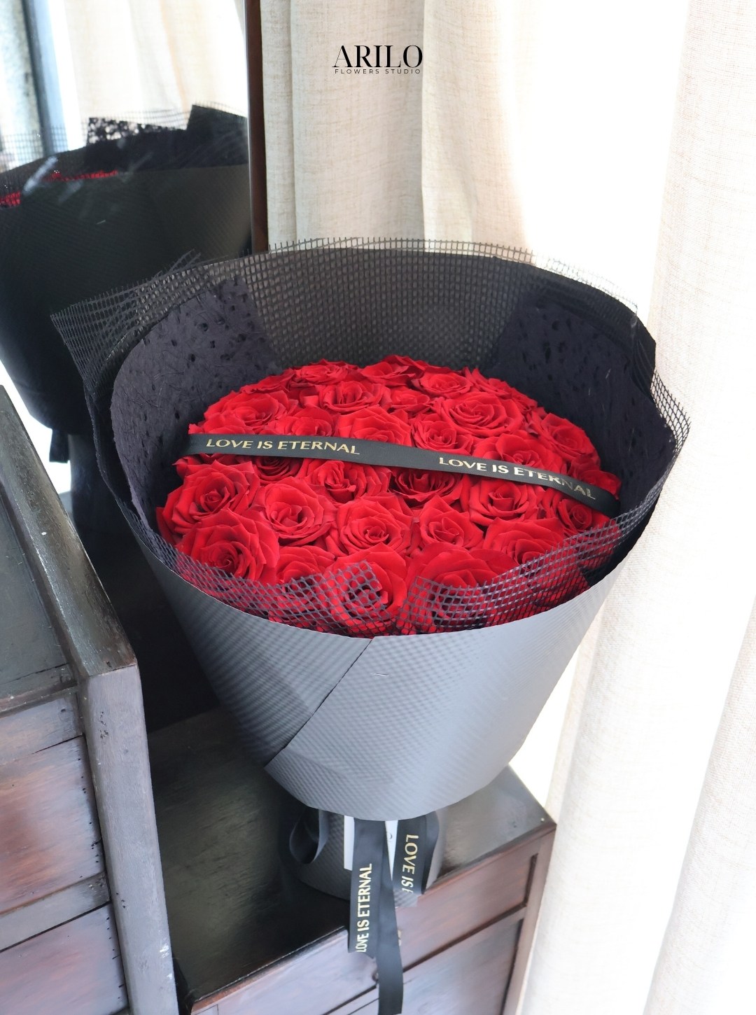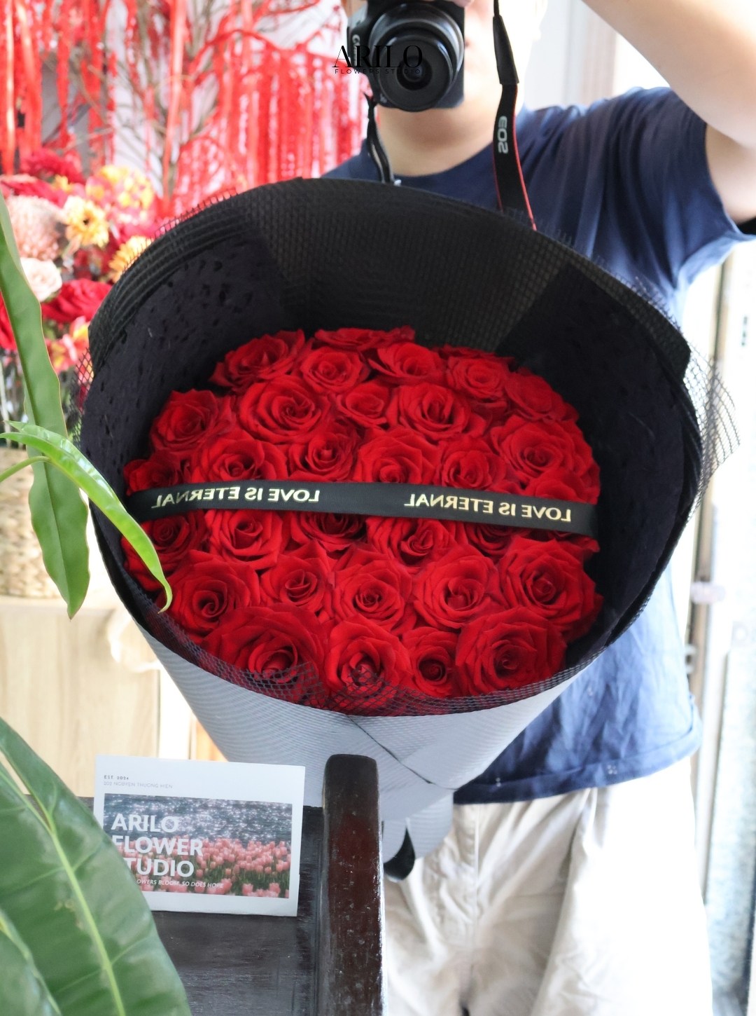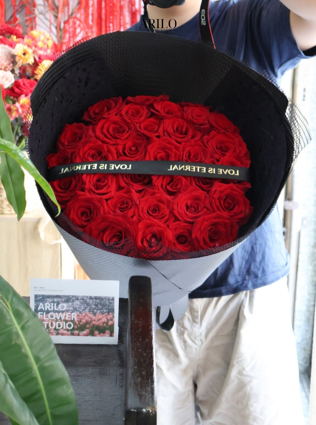 Bó hoa trong hình là thiết kế hoa hồng đỏ mang phong cách hiện đại và đầy cuốn hút, được gói bằng giấy đen cao cấp, tạo nhận diện mạnh mẽ và sang trọng. Những đóa hồng đỏ được xếp tròn dày dặn, kết hợp ruy băng tinh tế, truyền tải thông điệp yêu thương rõ ràng và dứt khoát. Đây là mẫu hoa được nhiều khách hàng lựa chọn tại Shop hoa tươi Sài Gòn – Arilo Flower Studio cho các dịp quan trọng.