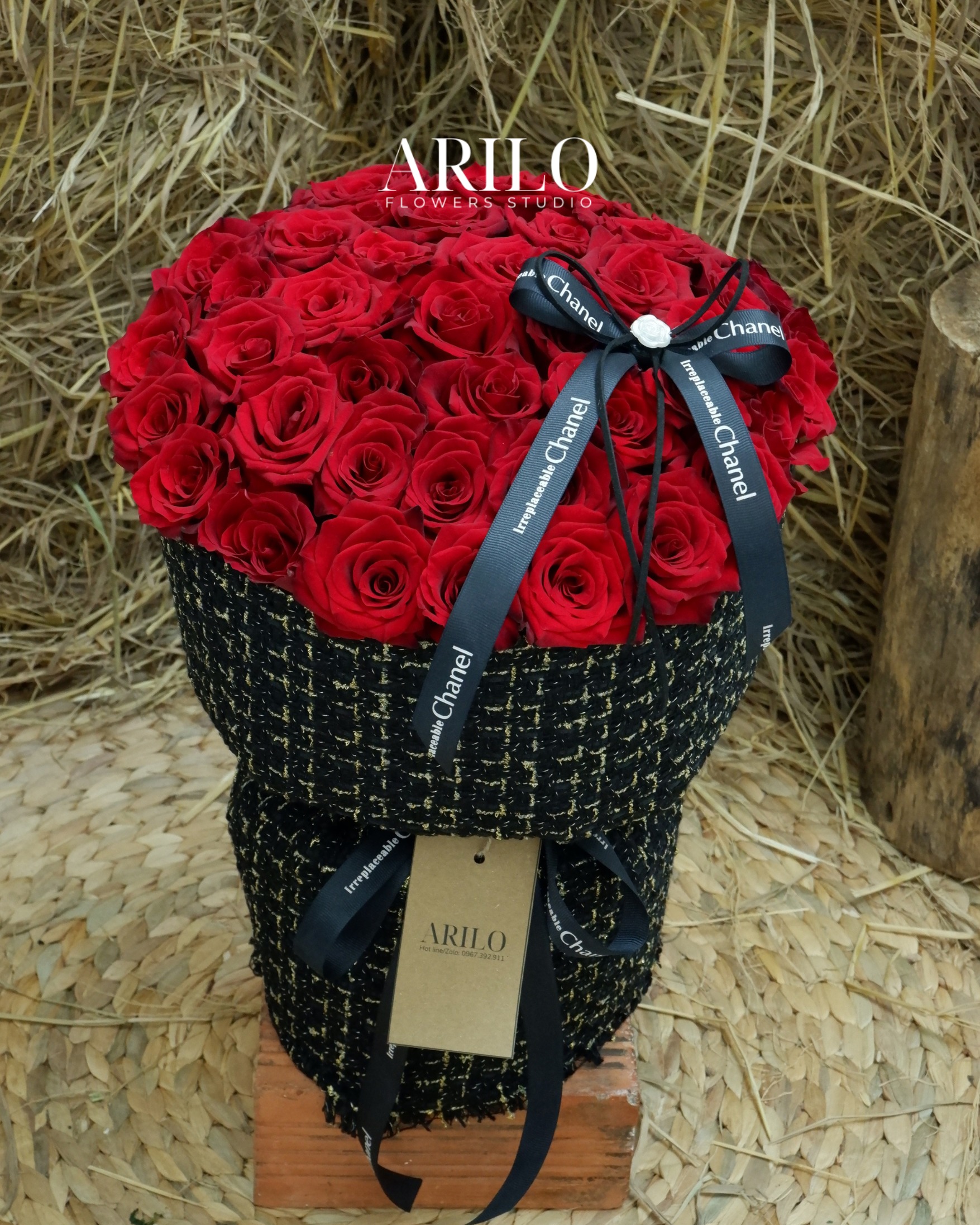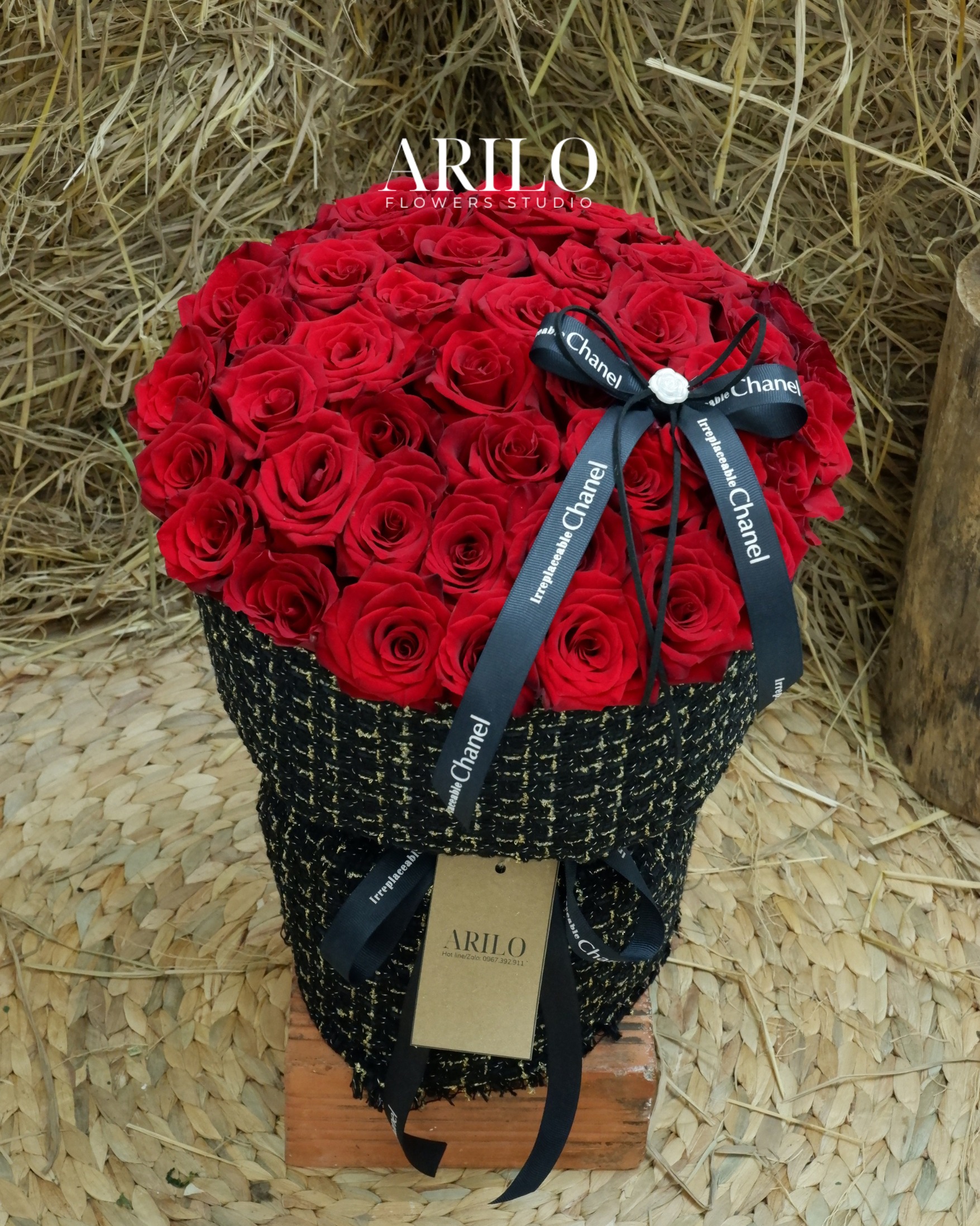 Bó hoa hồng đỏ trong hình là thiết kế mang phong cách sang trọng và đẳng cấp, nổi bật với những đóa hồng đỏ nhung được sắp xếp dày dặn, tròn đầy và tinh tế. Sản phẩm đến từ Shop hoa tươi Sài Gòn – Arilo Flower Studio, kết hợp hộp vải cao cấp cùng nơ lụa đen sang trọng, tạo nên tổng thể vừa mạnh mẽ vừa thời thượng. Đây là lựa chọn hoàn hảo cho các dịp hoa sinh nhật, hoa chúc mừng hay hoa khai trương, đặc biệt phù hợp để tặng đối tác, sếp hoặc những người quan trọng.