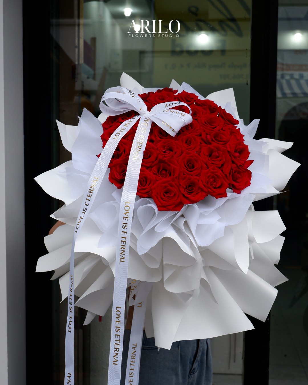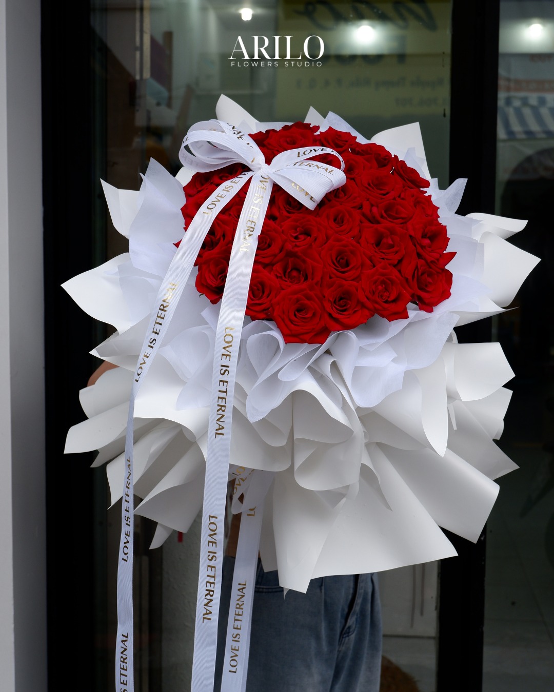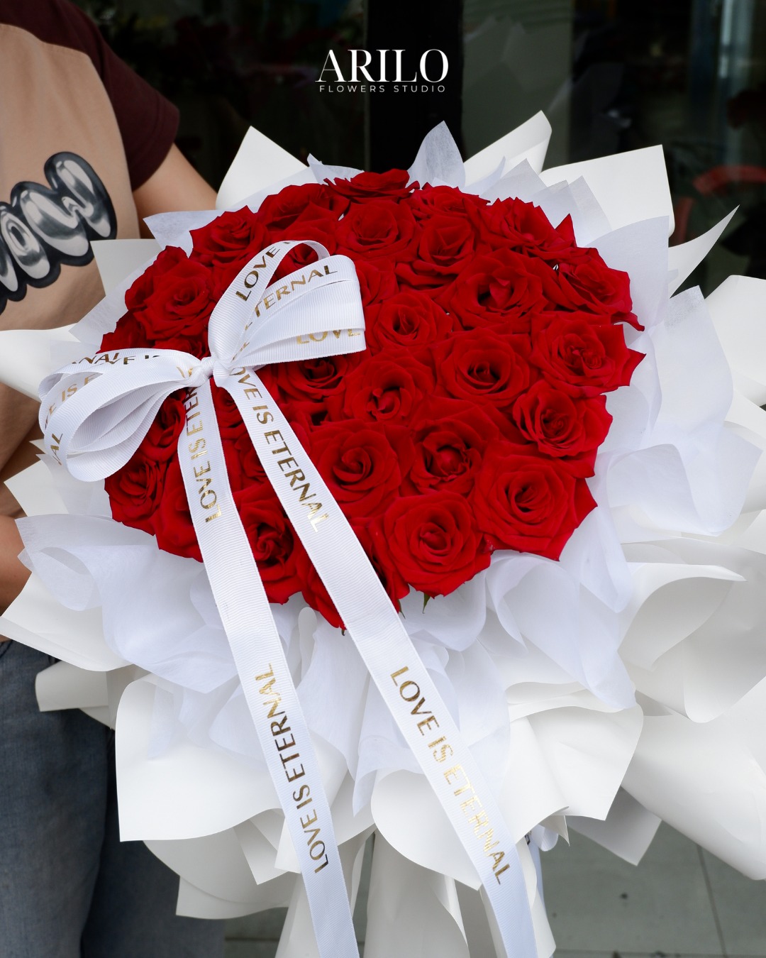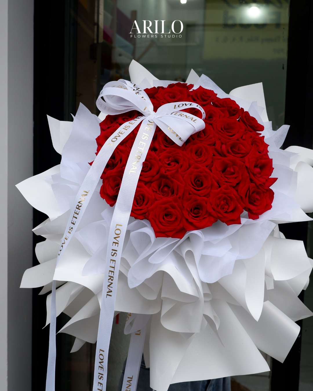 Phần giấy gói trắng được sử dụng như một lớp nền nhẹ nhàng, giúp tôn lên sắc đỏ của hoa. Khi xếp nhiều lớp giấy với độ xòe vừa phải, bó hoa trở nên mềm mại hơn, tạo cảm giác như hoa đang được nâng niu. Dải nơ in chữ “Love is eternal” không chỉ là chi tiết trang trí, mà còn là lời nhắn gửi nhẹ nhàng về một tình yêu bền bỉ và lâu dài.