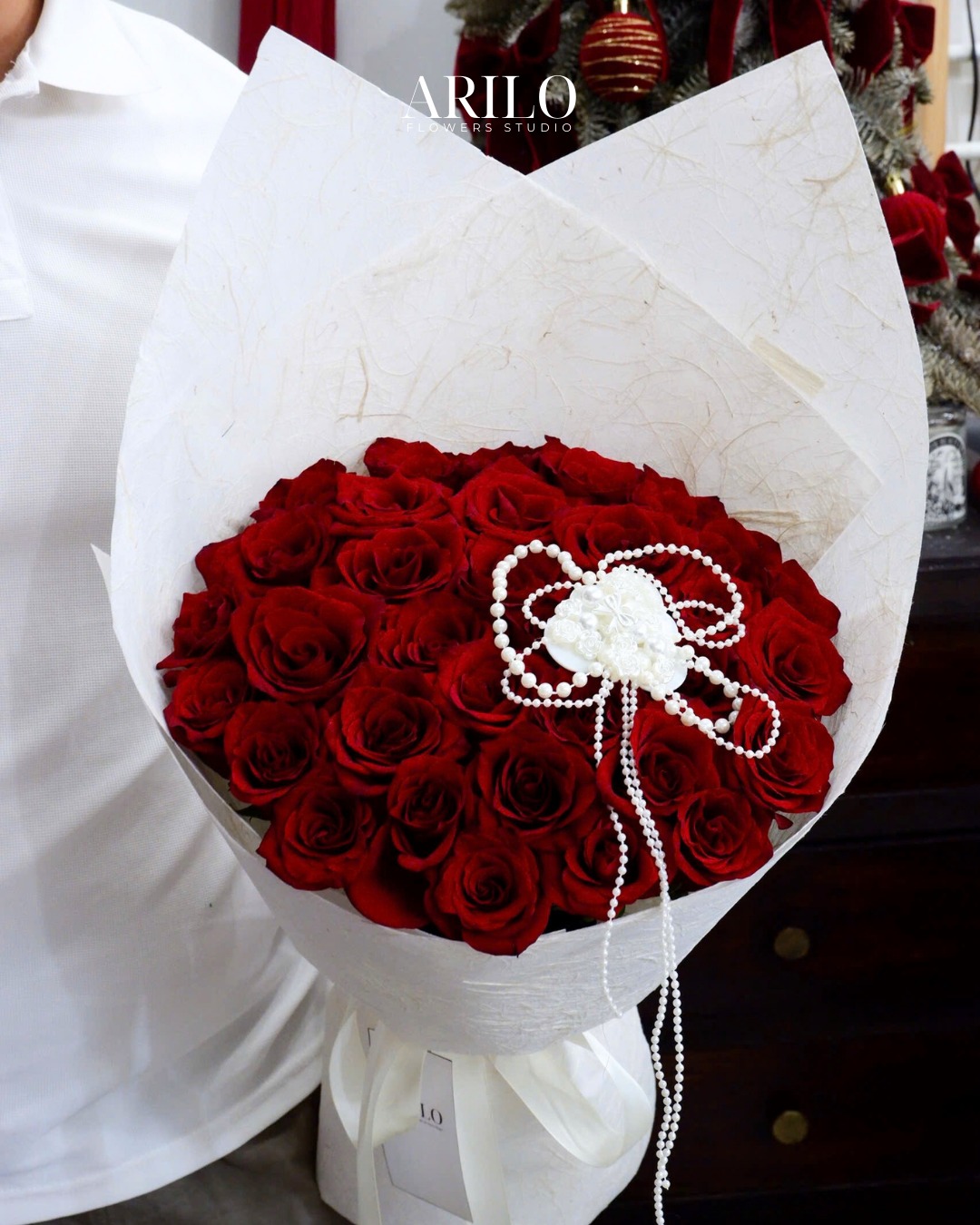 Thiết kế được gói bằng giấy trắng thủ công mềm mại, điểm nhấn là nơ ngọc trai sang trọng, tạo nên tổng thể vừa tinh khôi vừa lãng mạn. Mẫu hoa này rất được yêu thích tại Shop hoa tươi Sài Gòn – Arilo Flower Studio, đặc biệt trong các dịp hoa tặng người yêu Valentine, bó hoa tỏ tình, bó hoa cầu hôn hay bó hoa sinh nhật cho người thương.